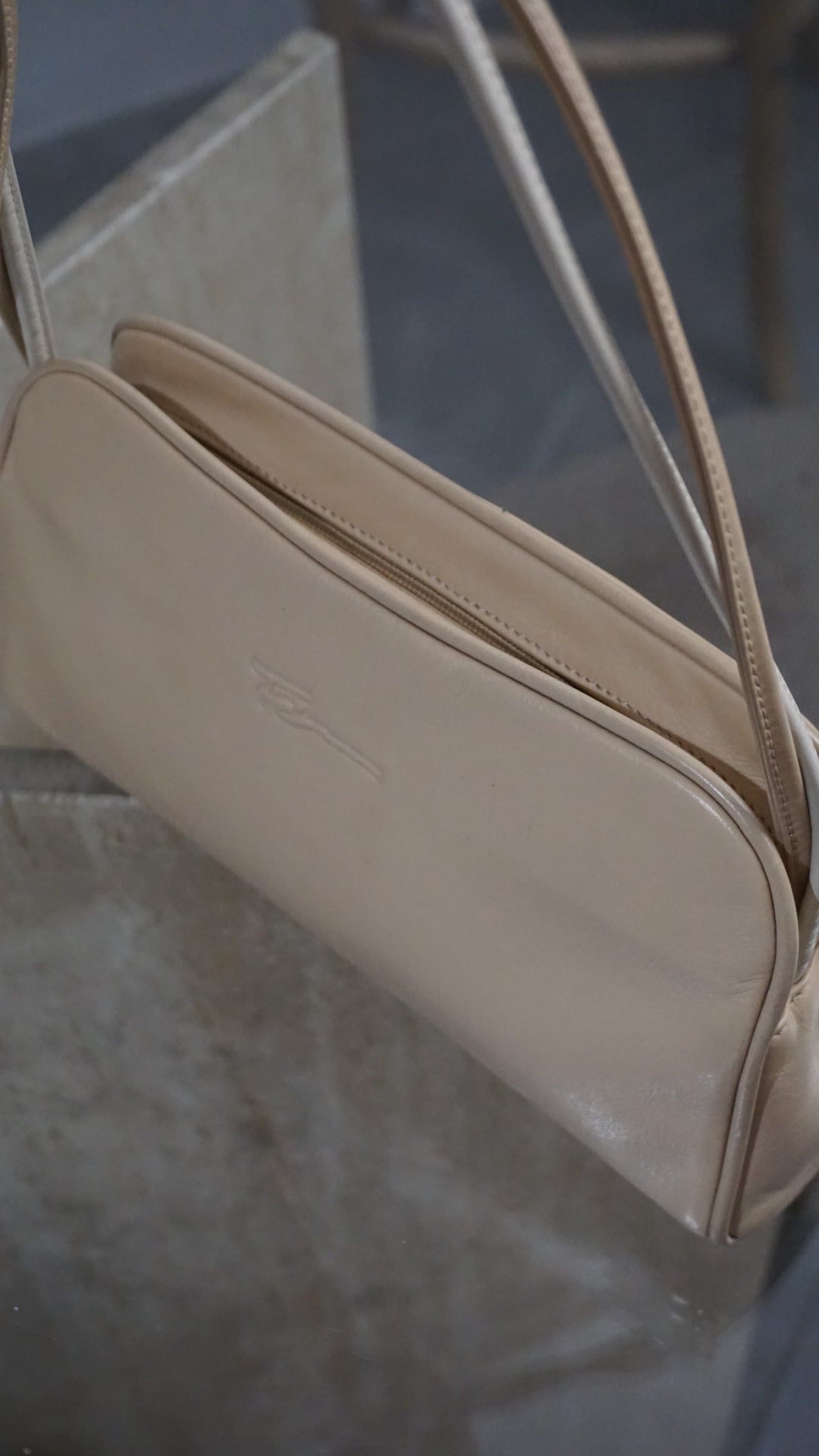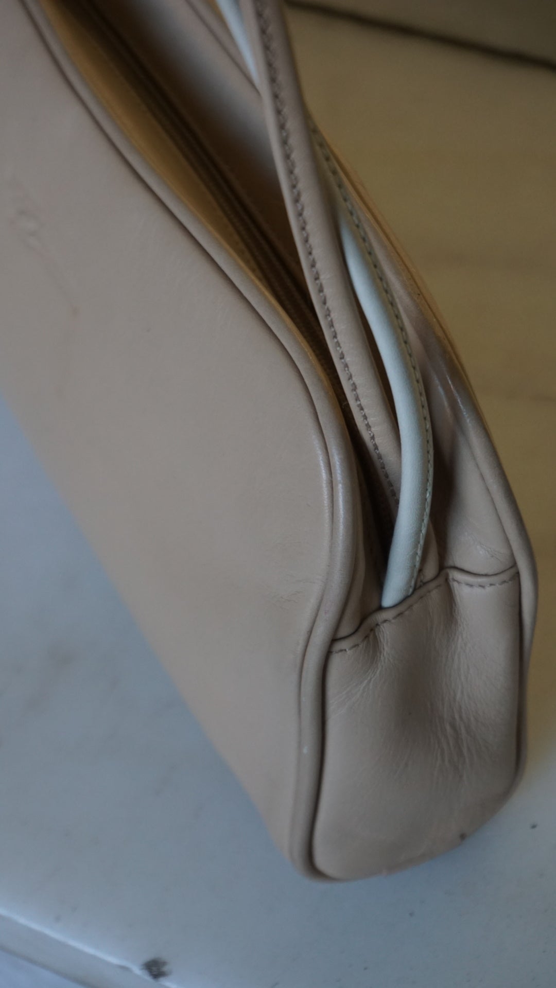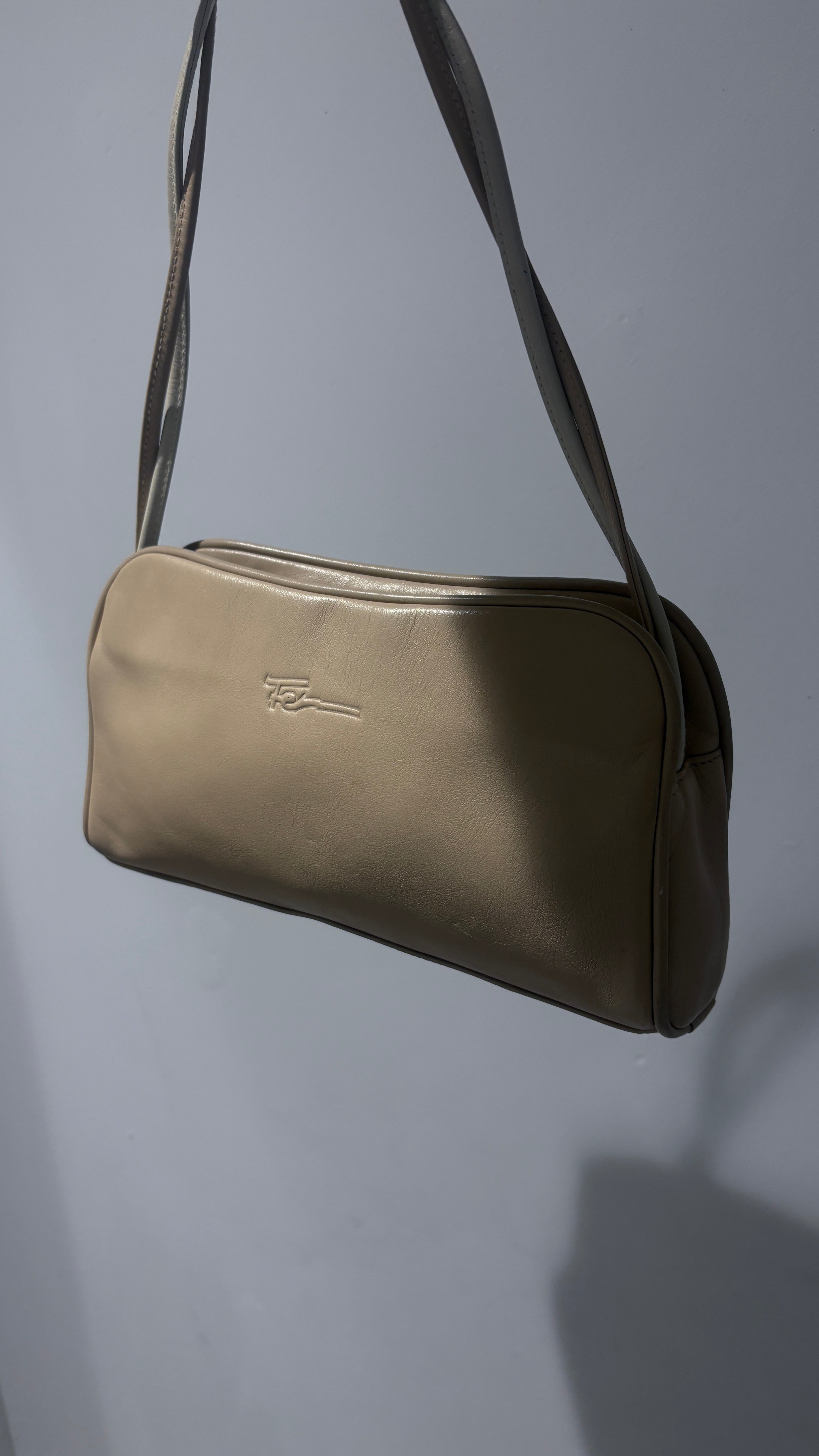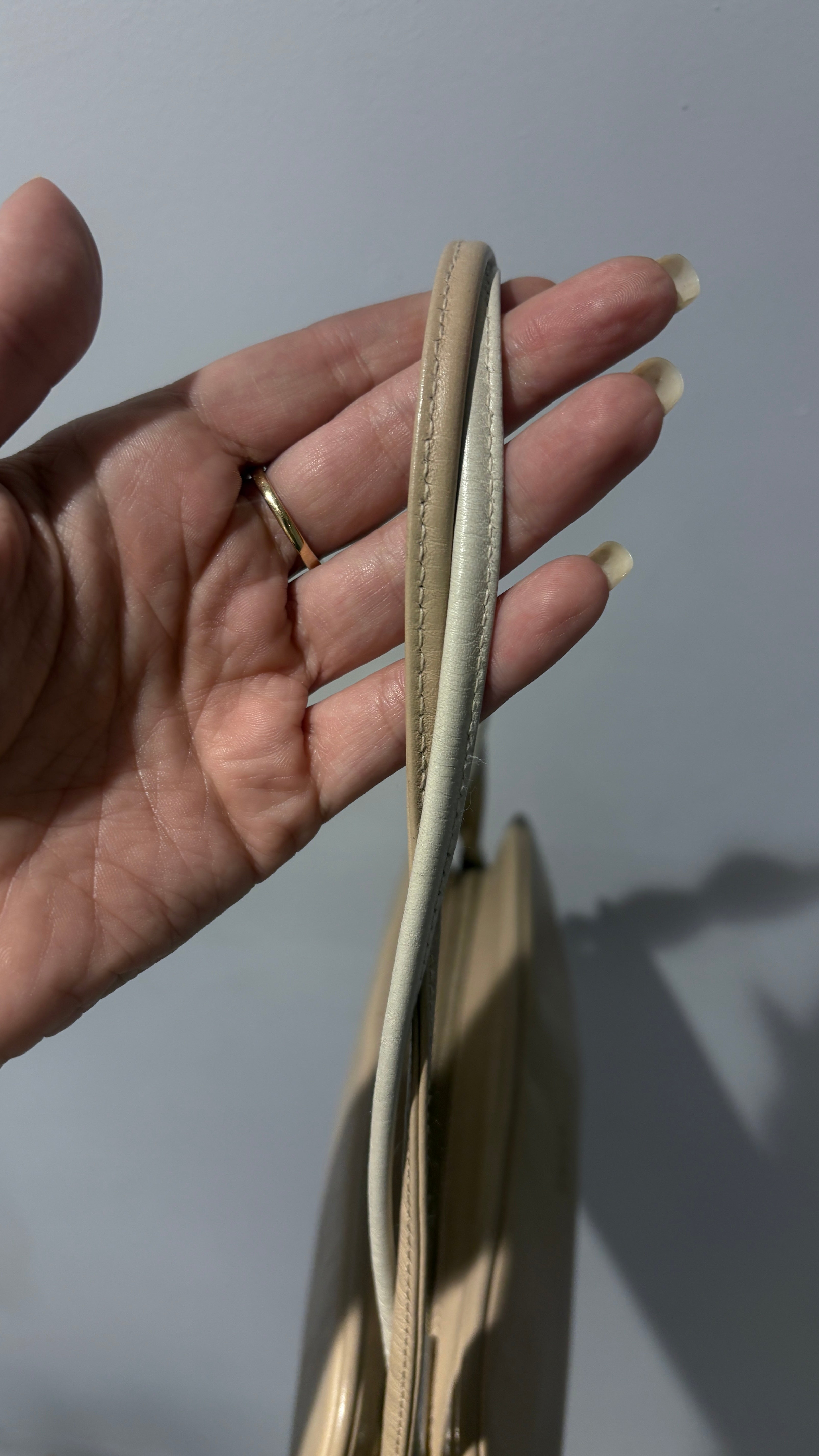 A super cute, elegant, and incredibly versatile beige shoulder bag.