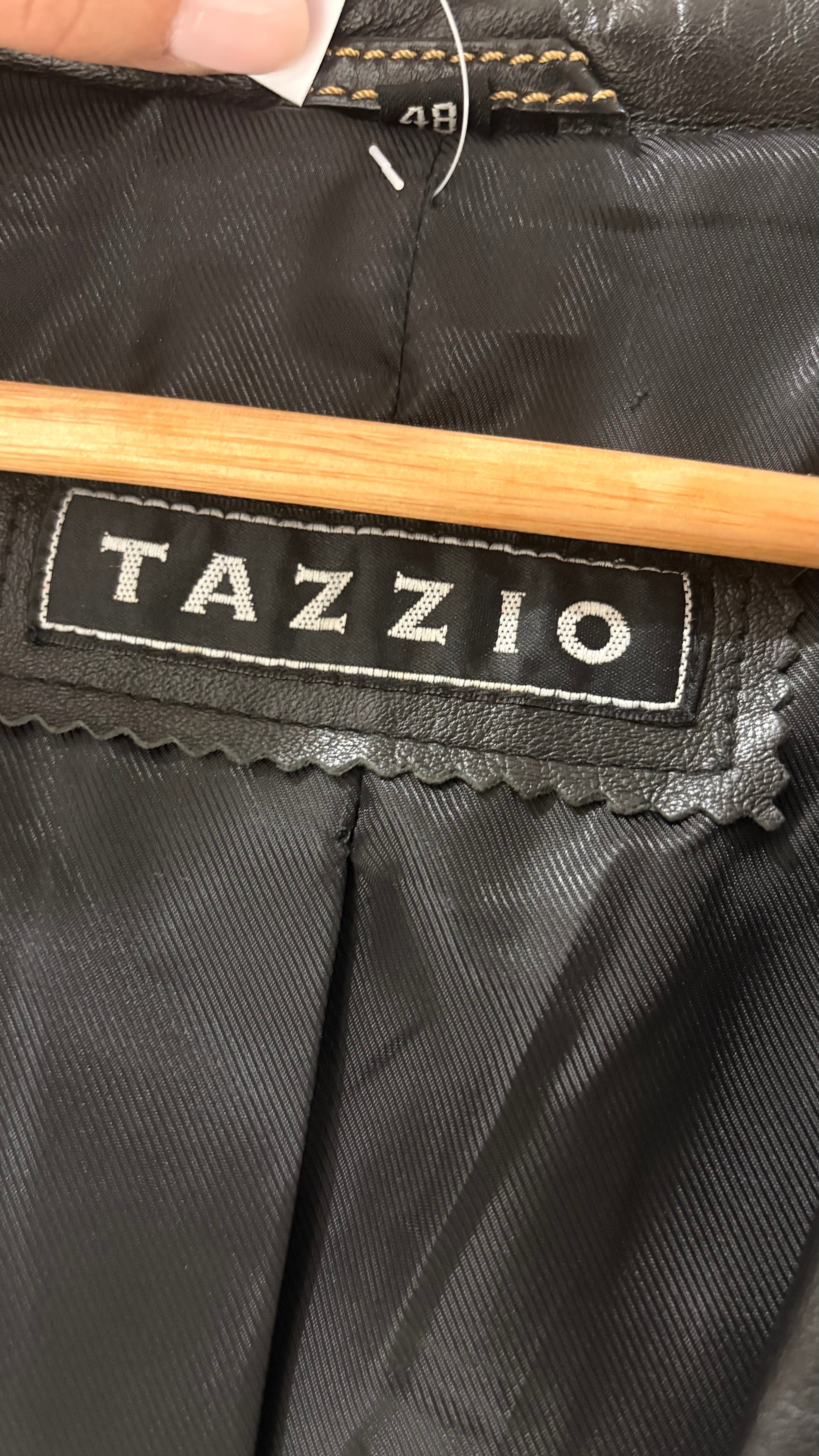 Black natural leather blazer with visible seam detailing and a cinched waist.