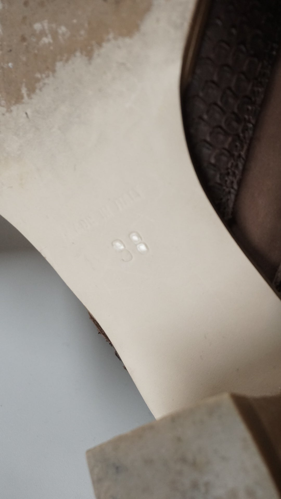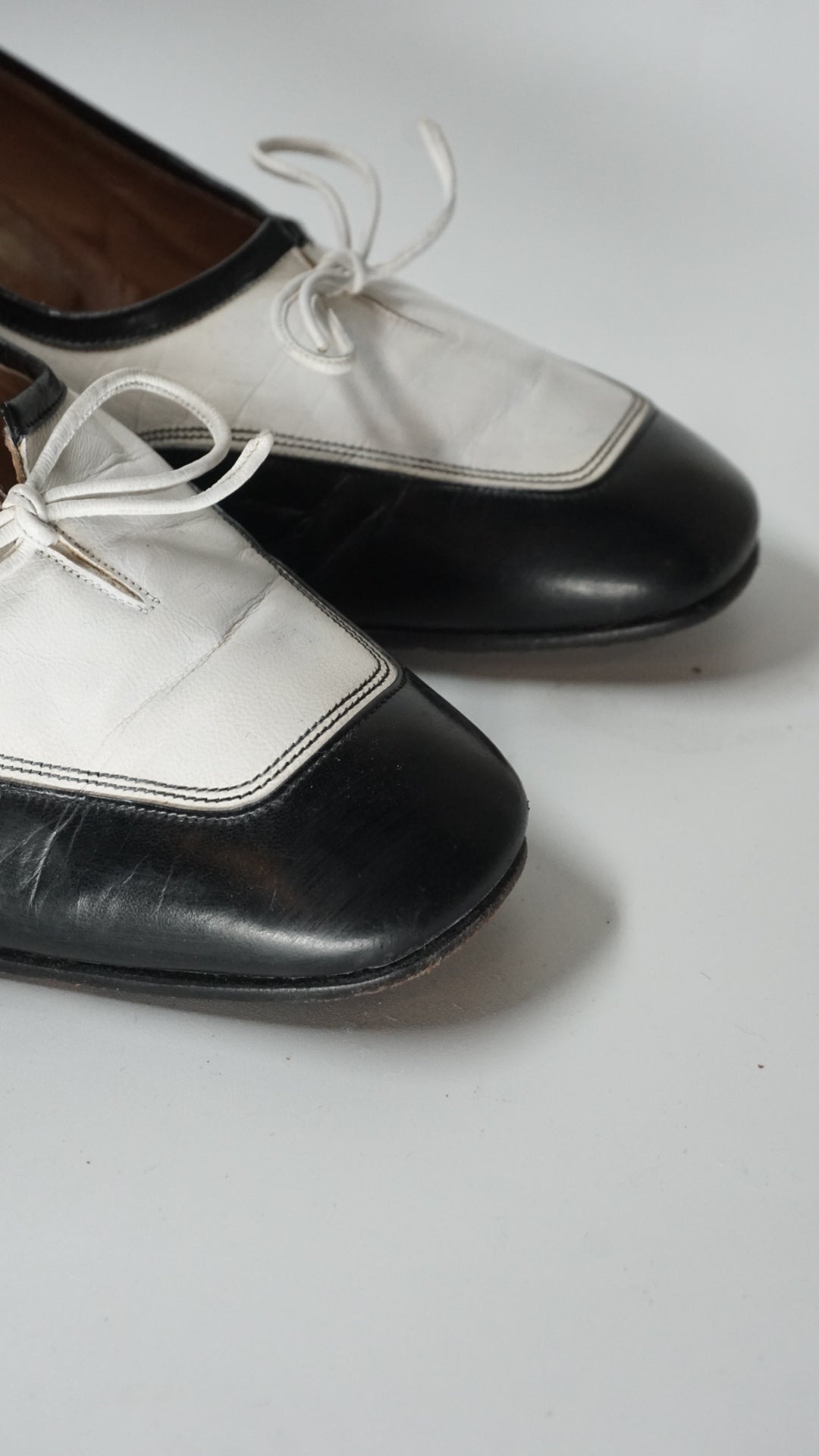 A pair of stunning black and white shoes, featuring a glossy black finish on the toe, heel, and sole, while the rest of the shoe shines in pristine white, creating an air of elegance and sophistication. Adding a charming touch is the delicate white bow, which beautifully enhances the overall design. The interior boasts a warm golden-brown hue, making the shoes stand out with a subtle yet striking contrast.