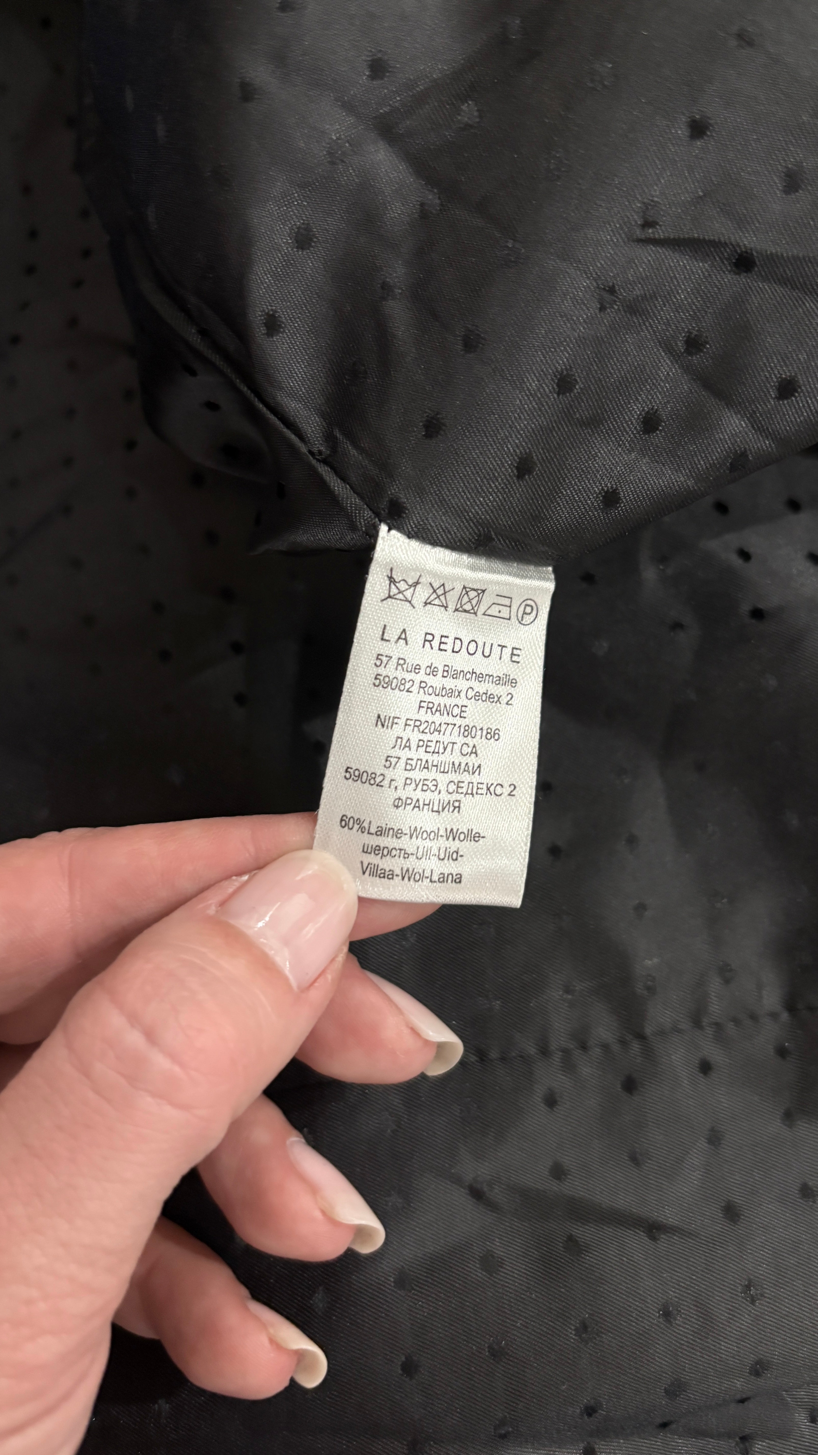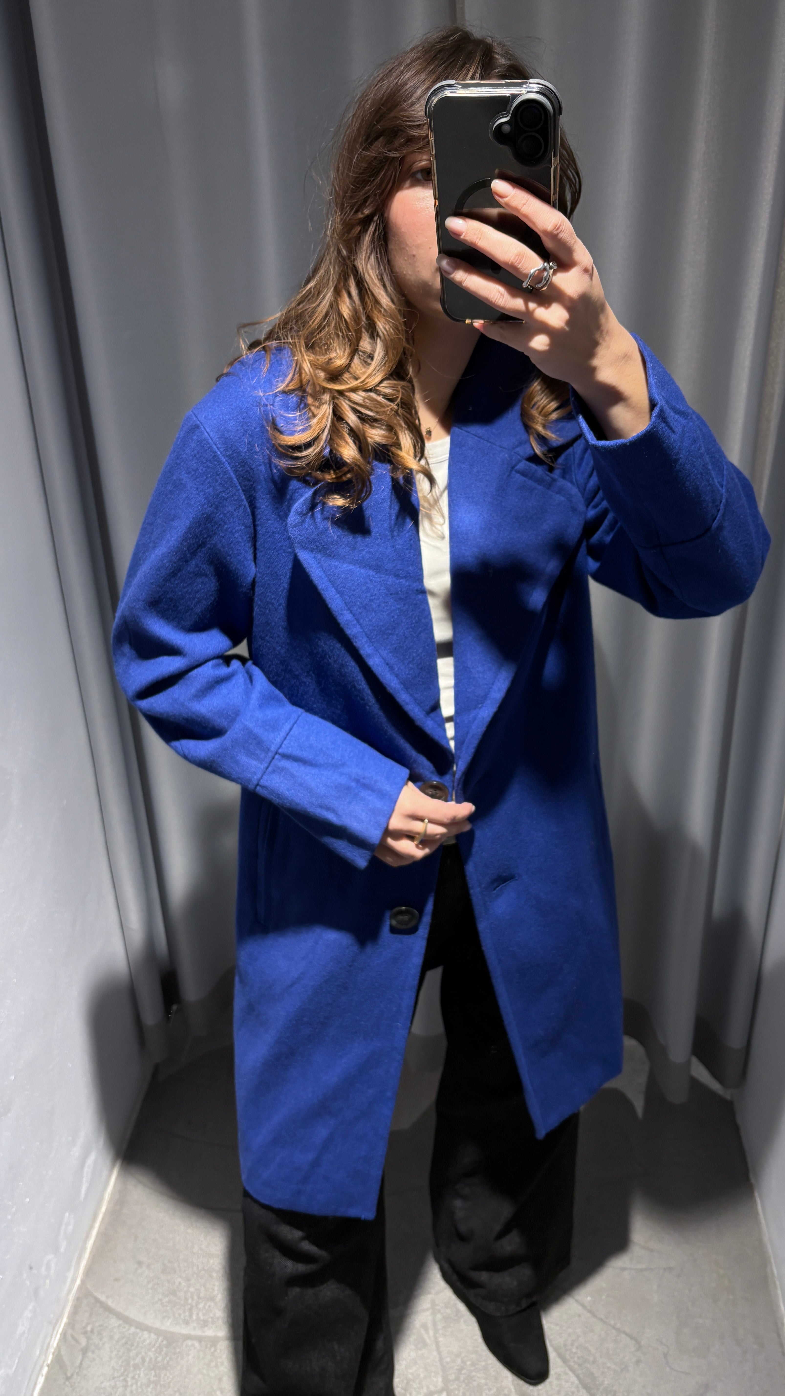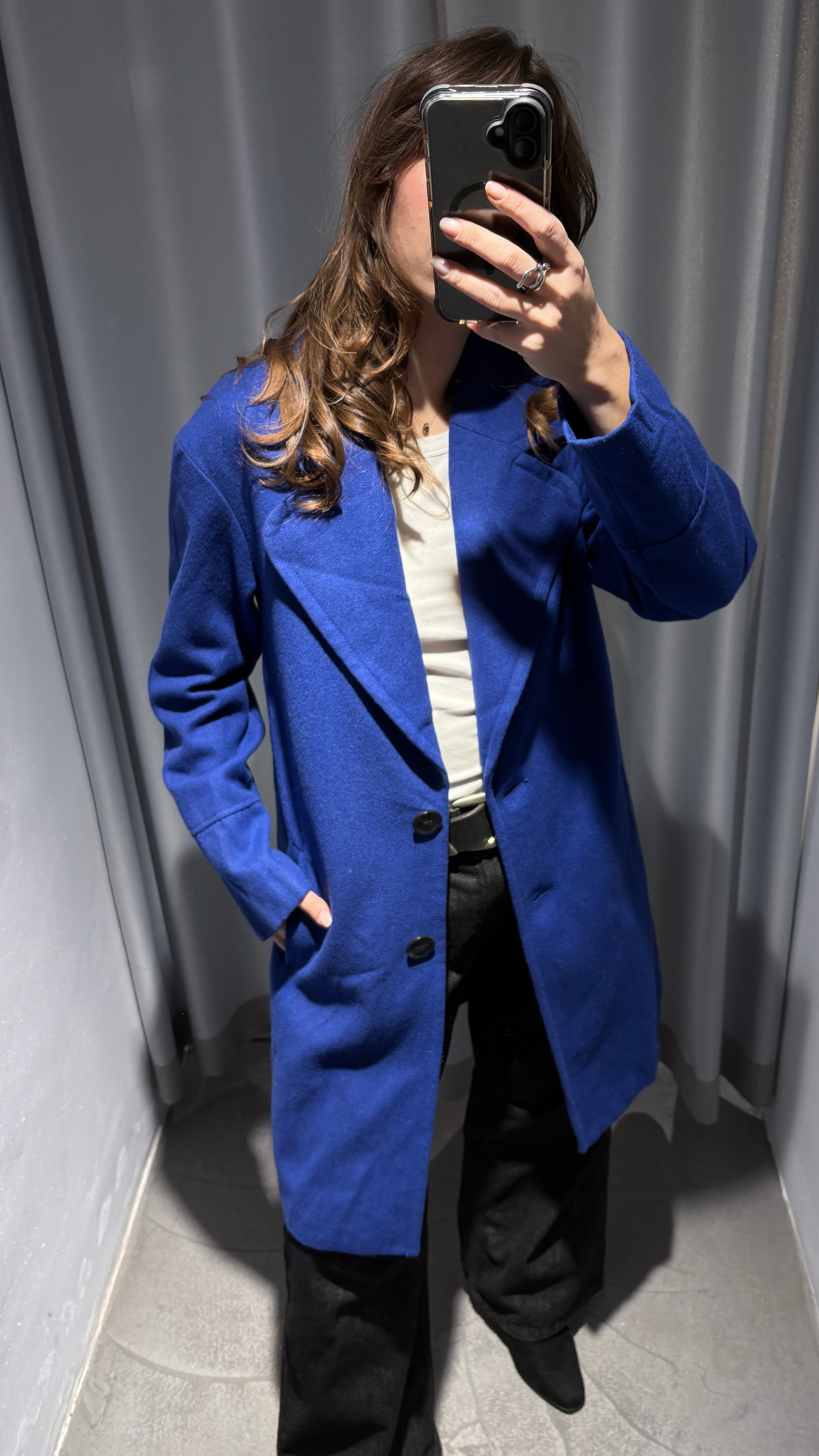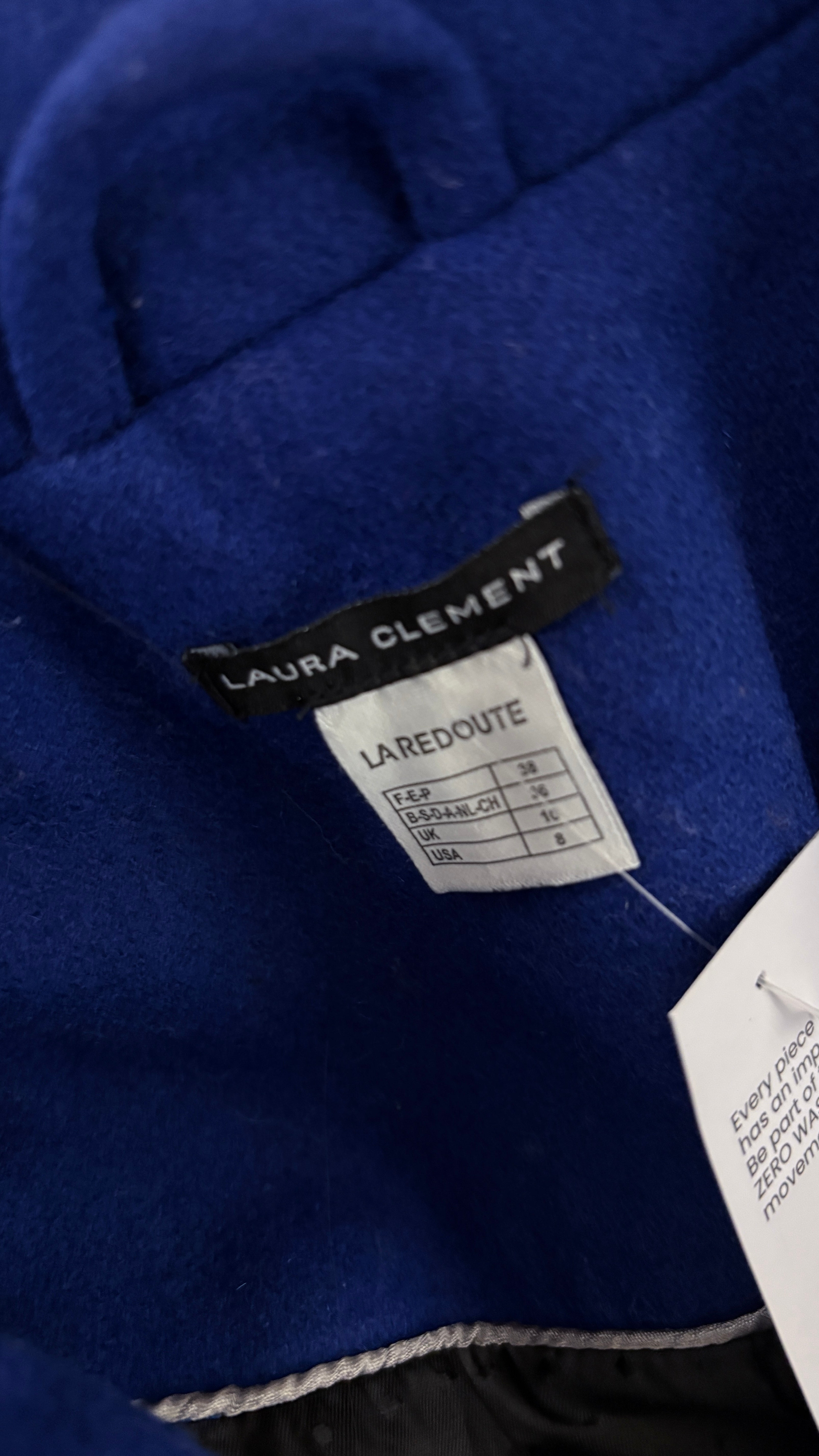 Mid-length coat in 60% wool, a beautiful electric blue/Klimt blue shade, a sophisticated alternative to classic black. It shows very little pilling, demonstrating the high quality of the material. The interior is also in impeccable condition, with a clean and well-preserved lining.