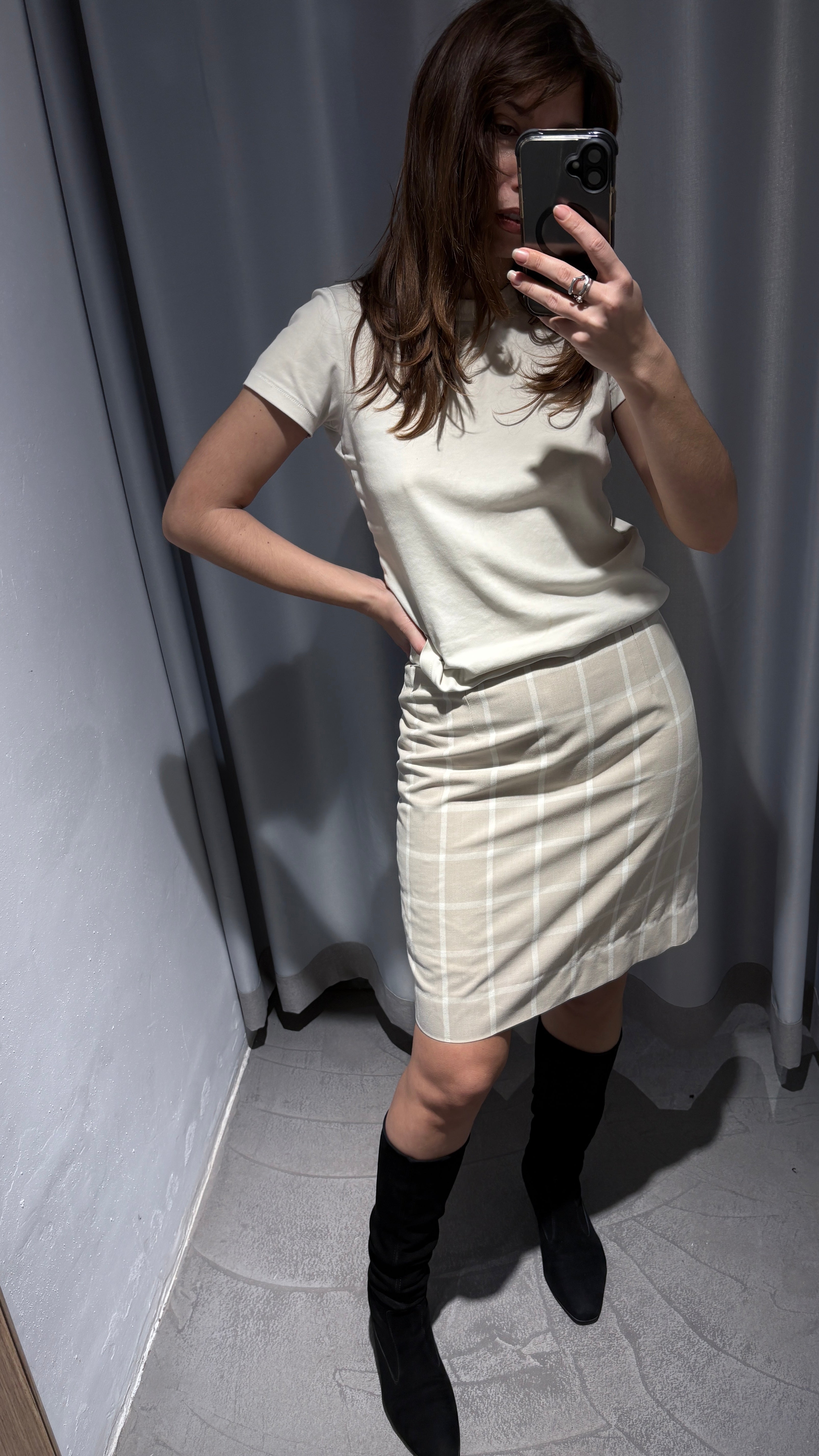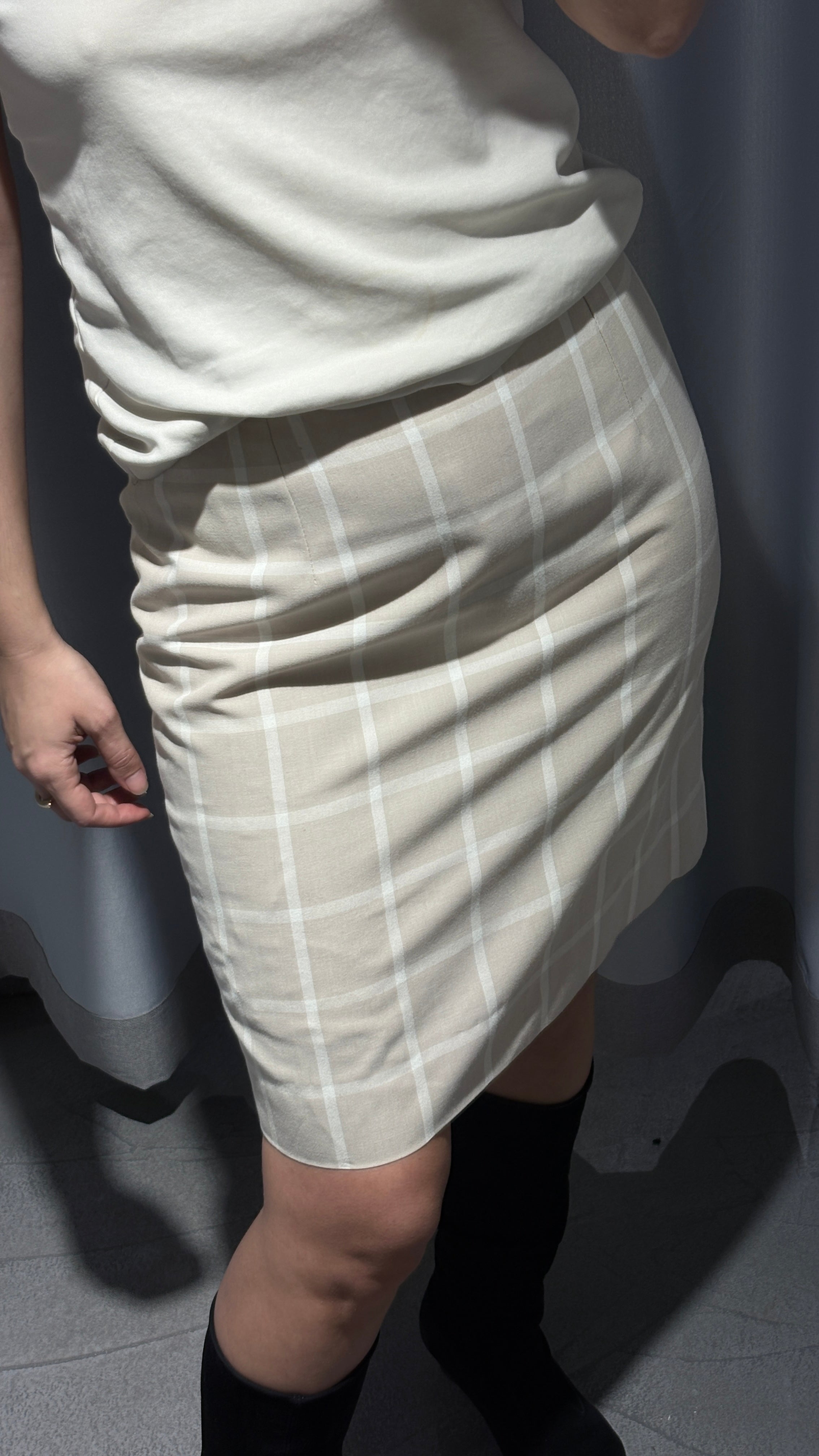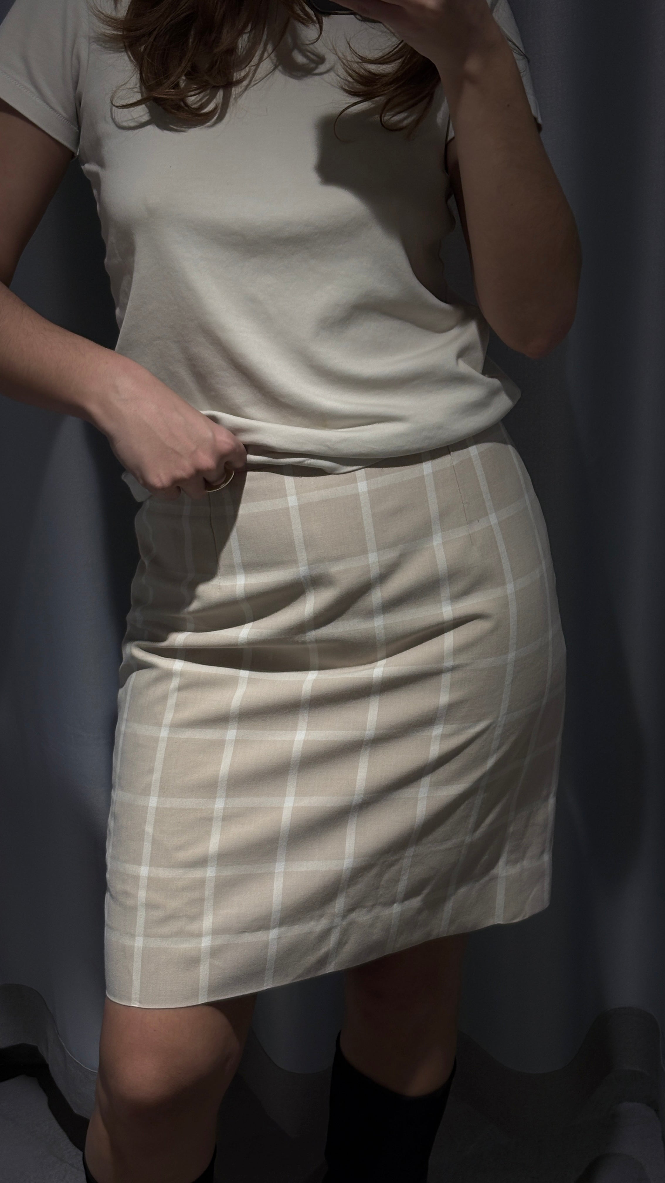 Straight skirt made from light beige cotton fabric with a white check pattern. It appears handmade due to the lack of any brand or composition labels.