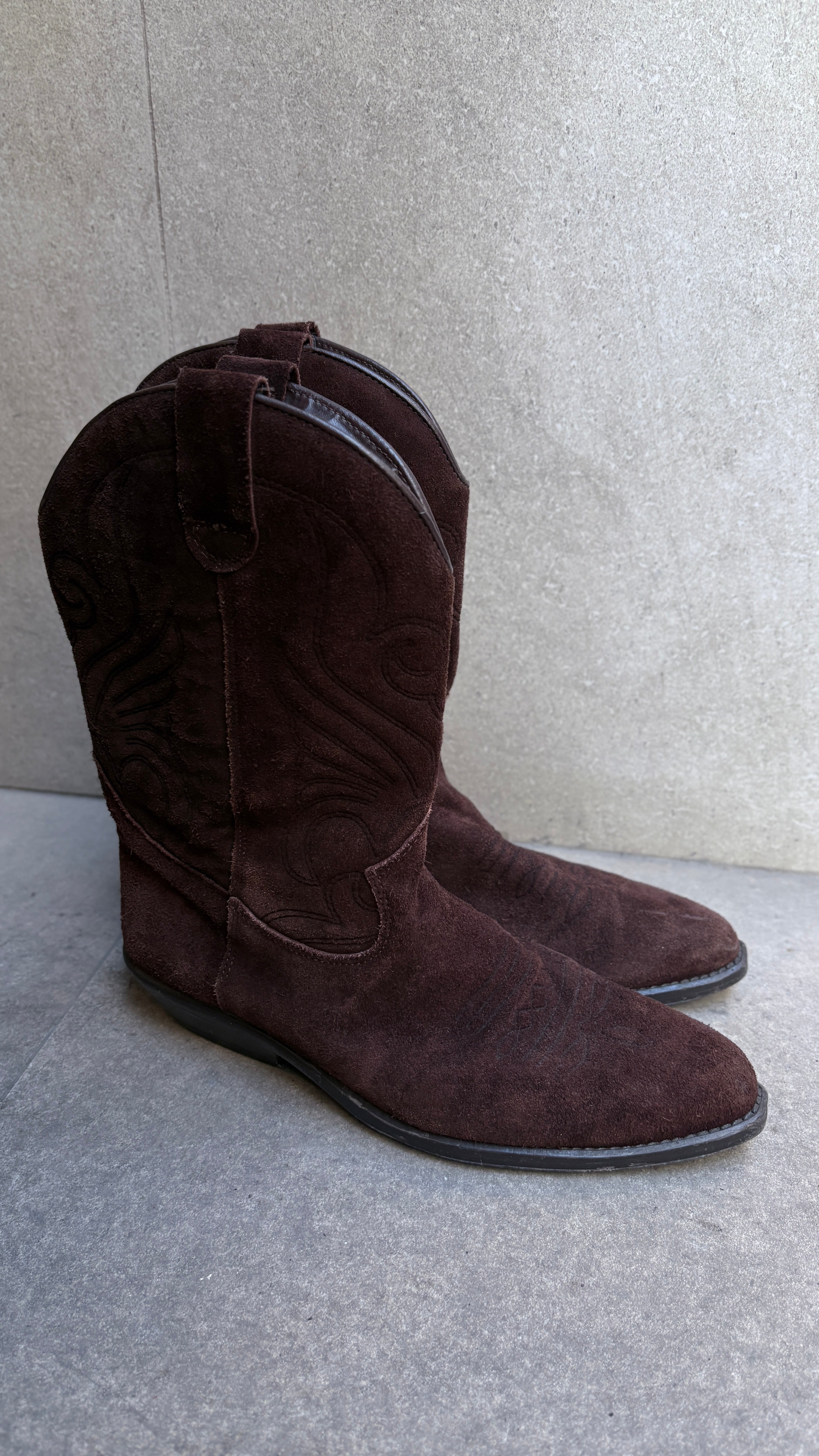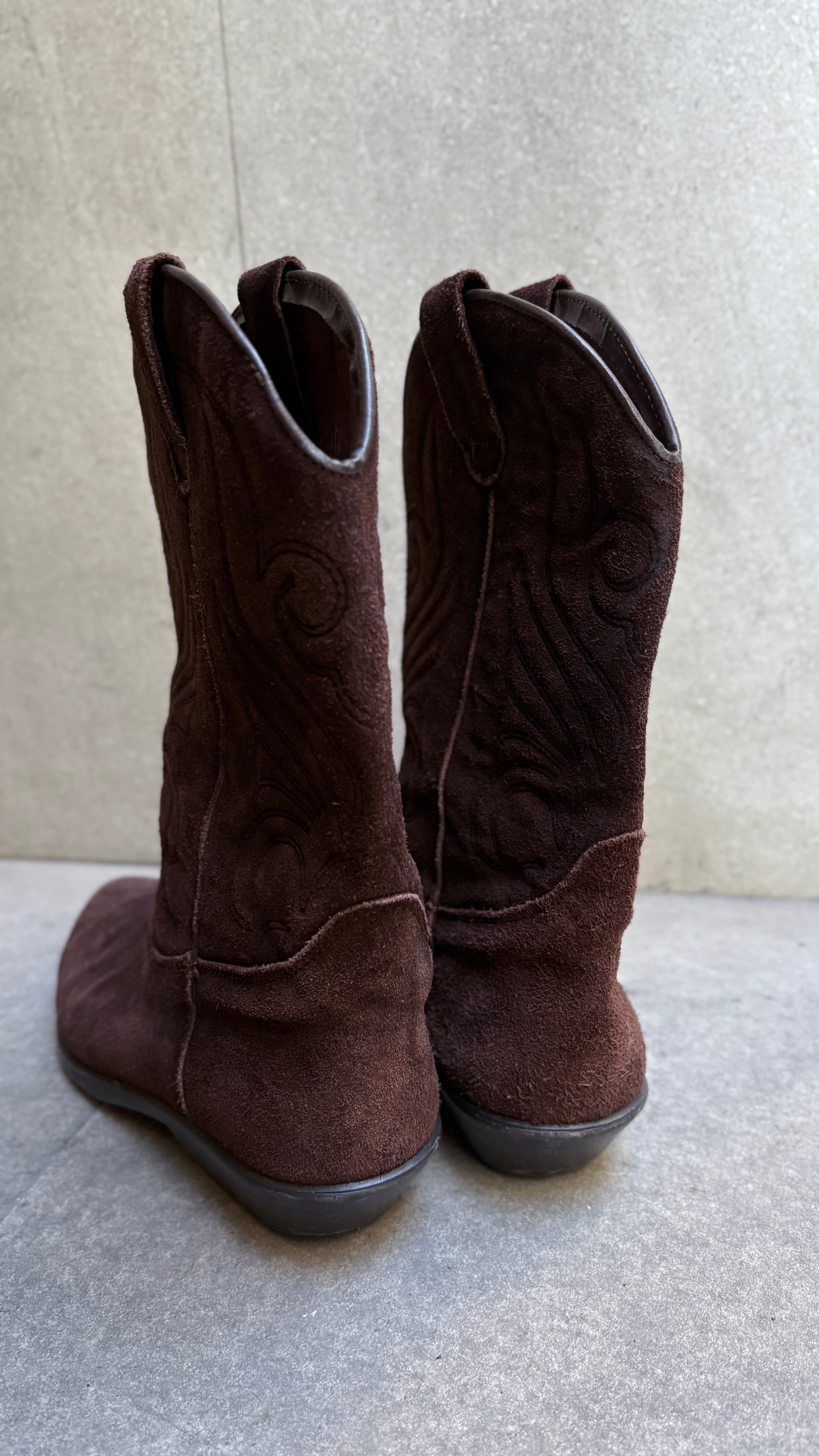 Deep chocolate brown suede cowboy boots with a soft, elegant, velvety texture. They feature traditional tonal embroidery on the shaft, adding dimension and the characteristic character of this type of footwear.