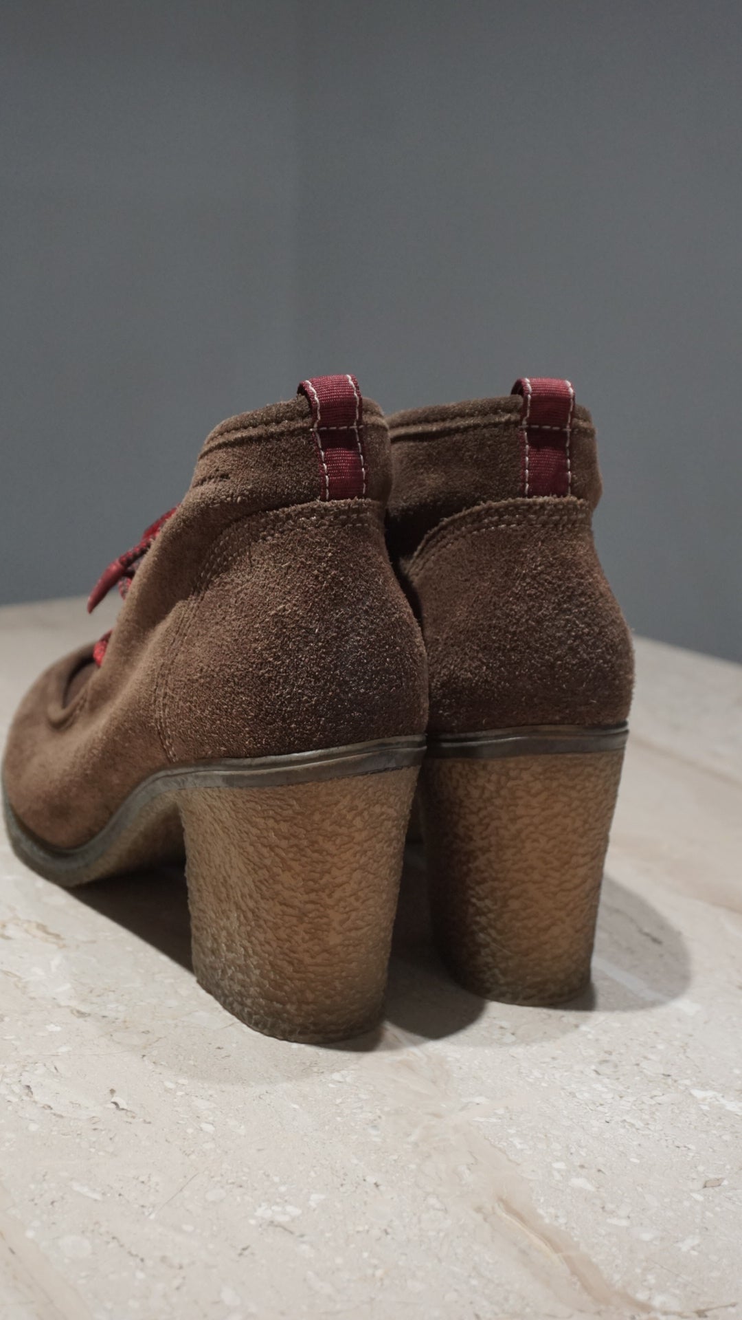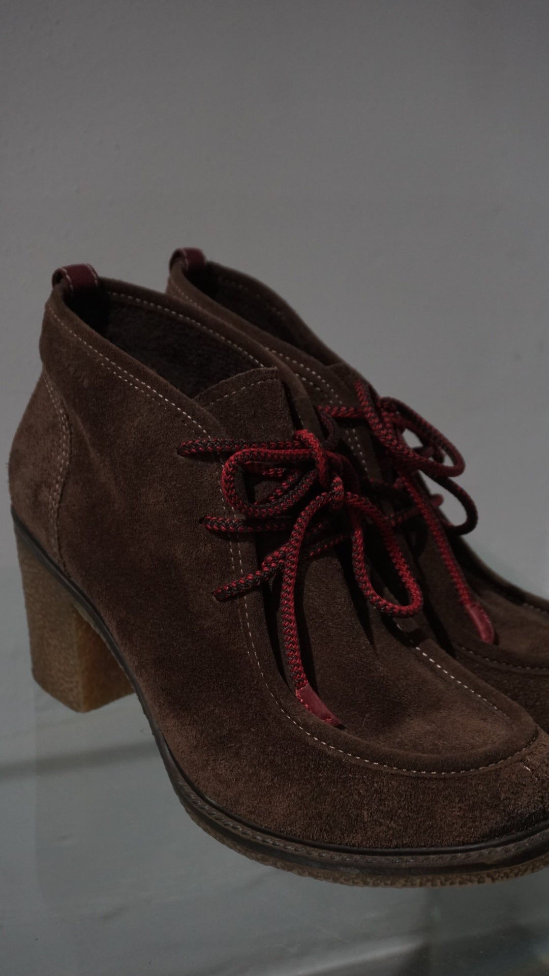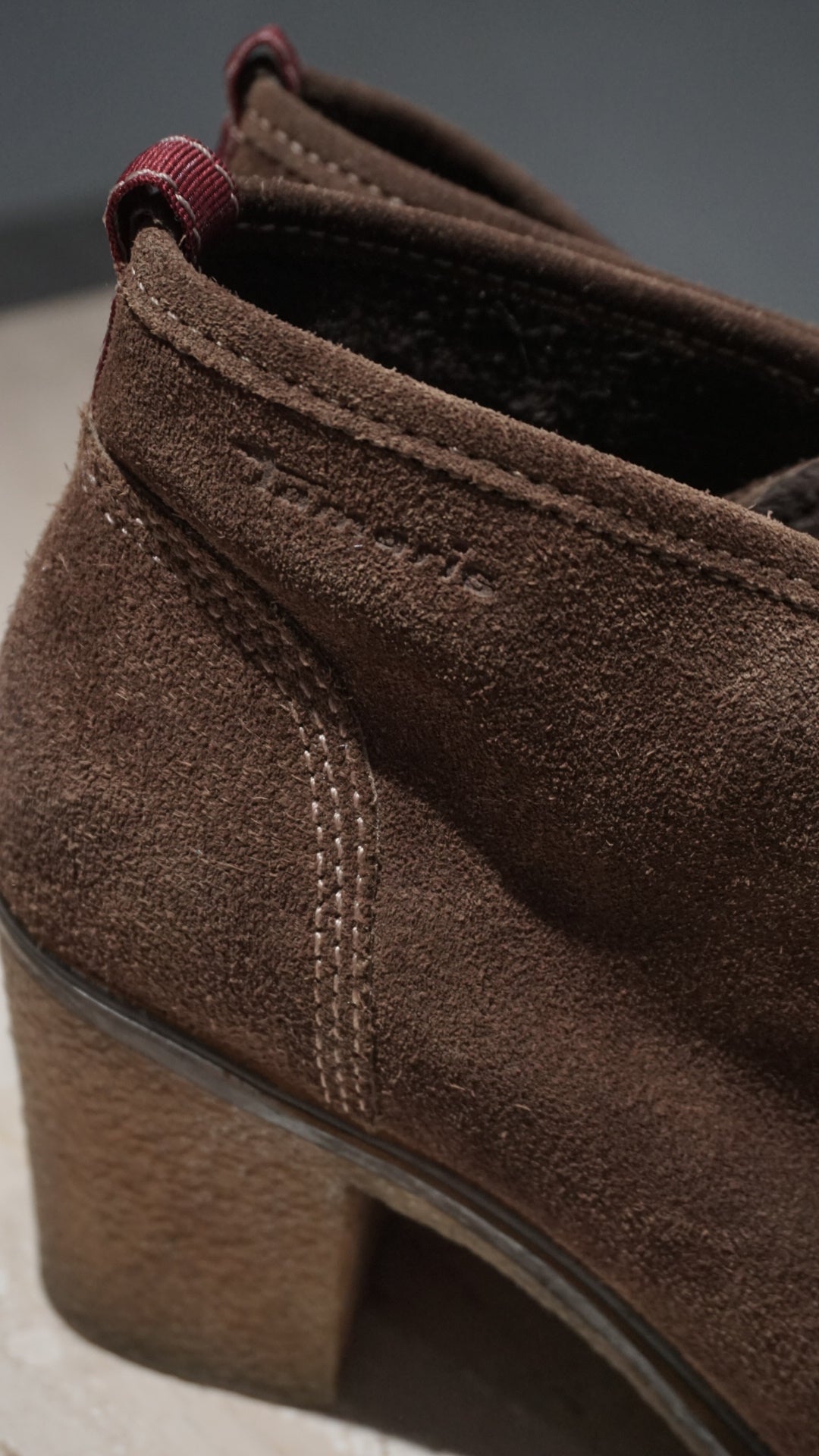 Natural suede ankle boots in a rich chocolate tone — high heel yet wonderfully comfortable, with a unique chunky loafer-inspired design. A rare and hard-to-find piece.