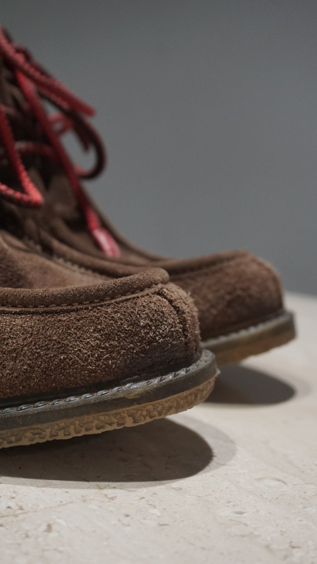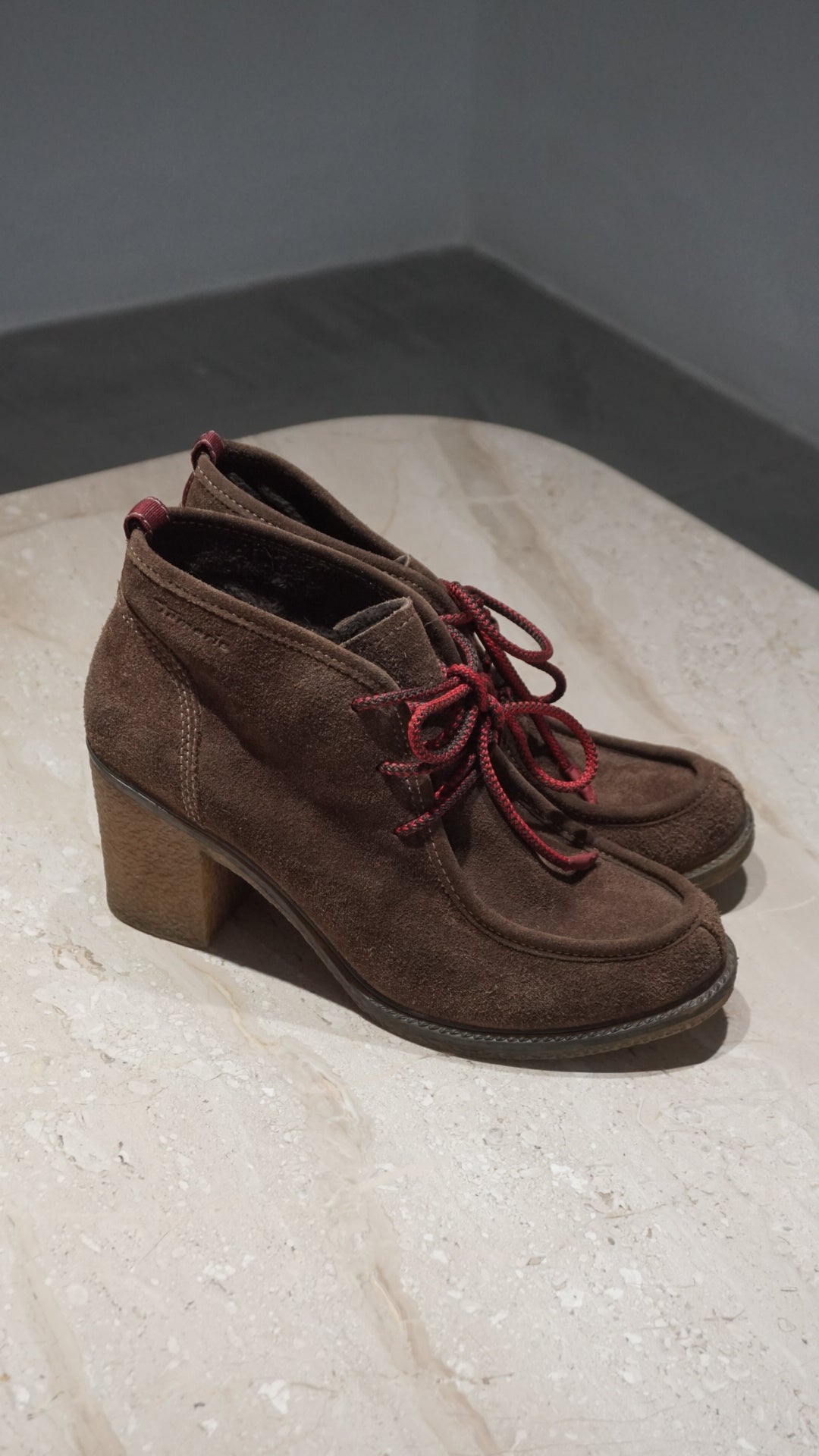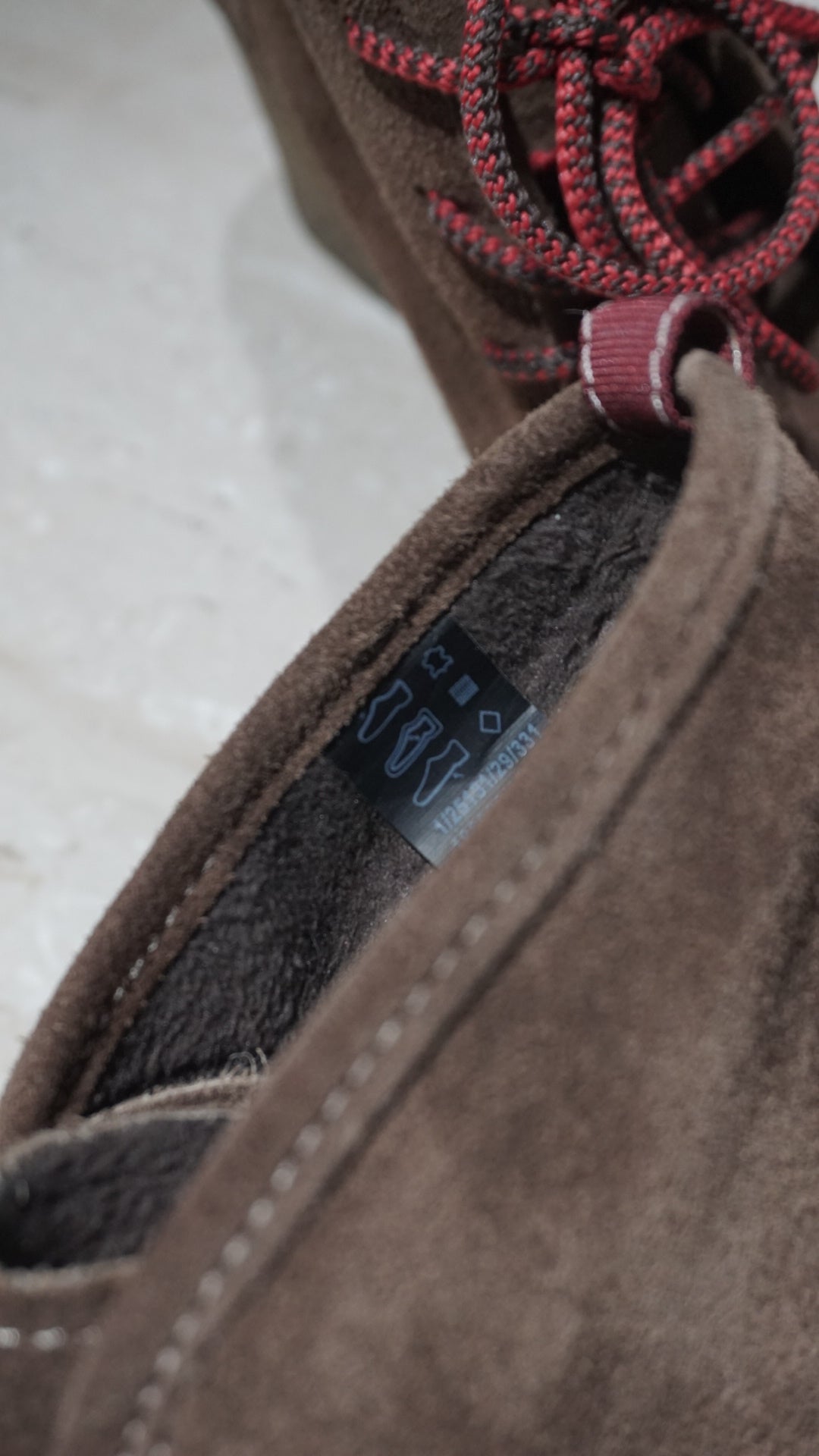 Natural suede ankle boots in a rich chocolate tone — high heel yet wonderfully comfortable, with a unique chunky loafer-inspired design. A rare and hard-to-find piece.