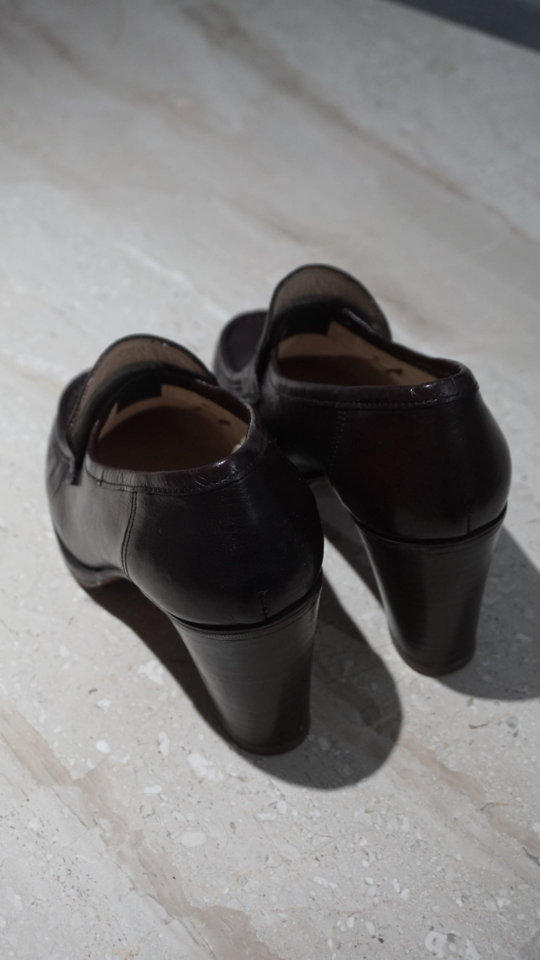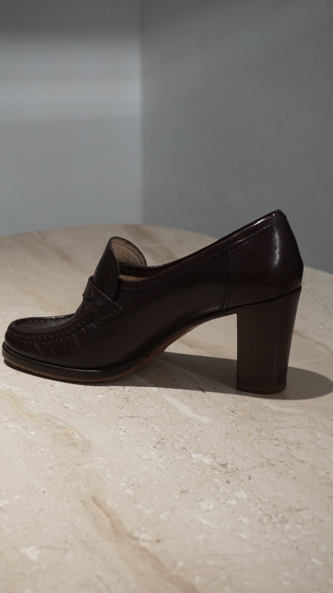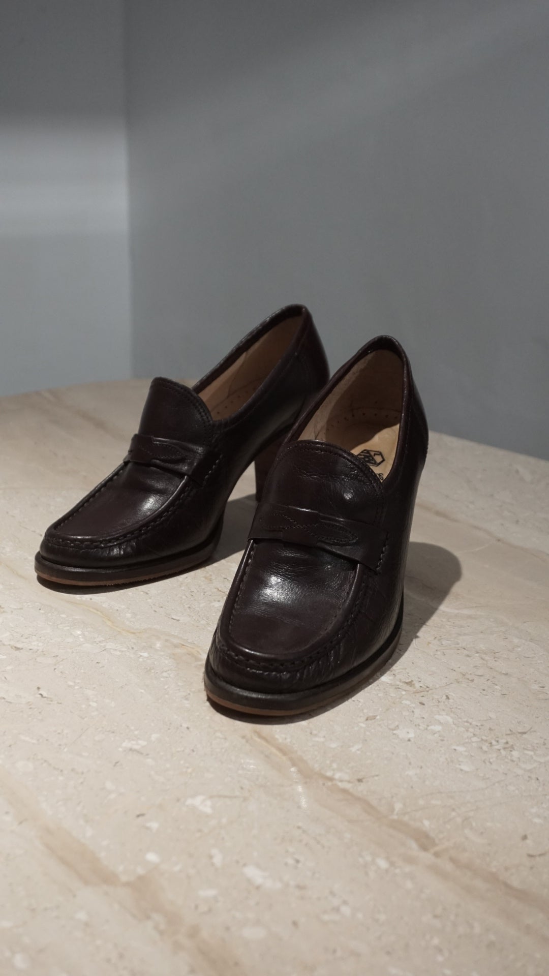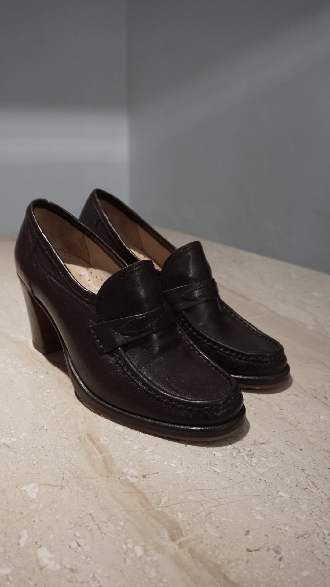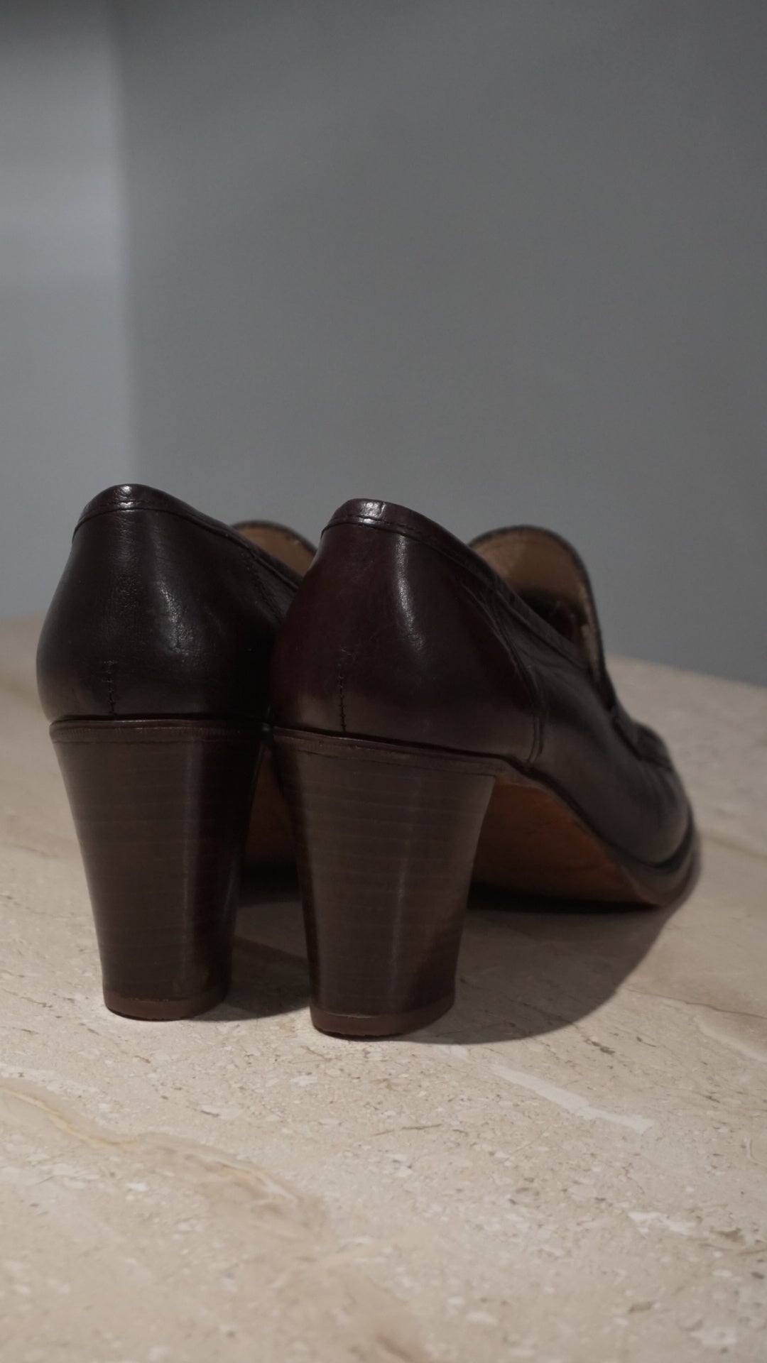 High-quality natural leather heeled loafers in a chocolate-brown tone