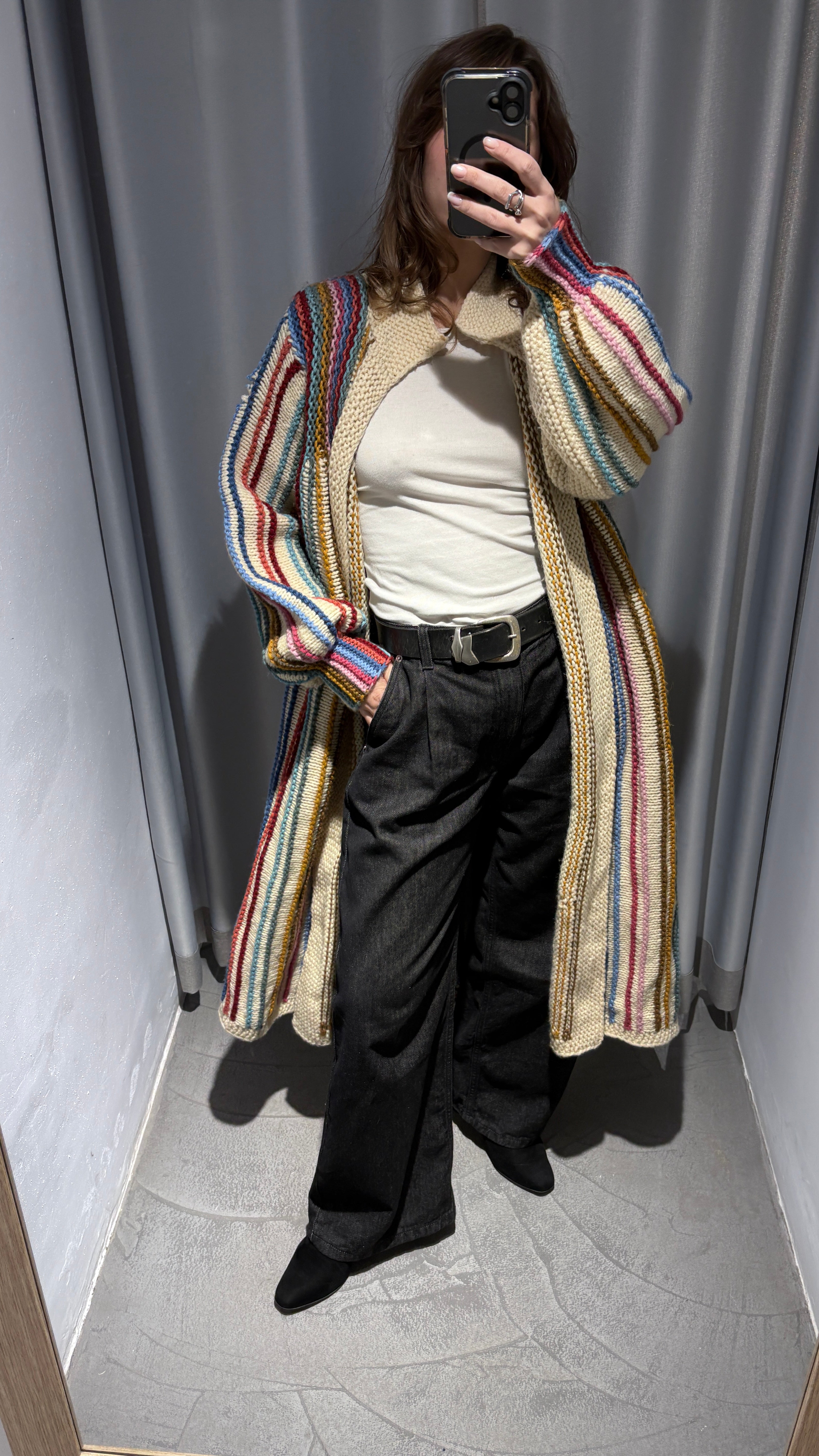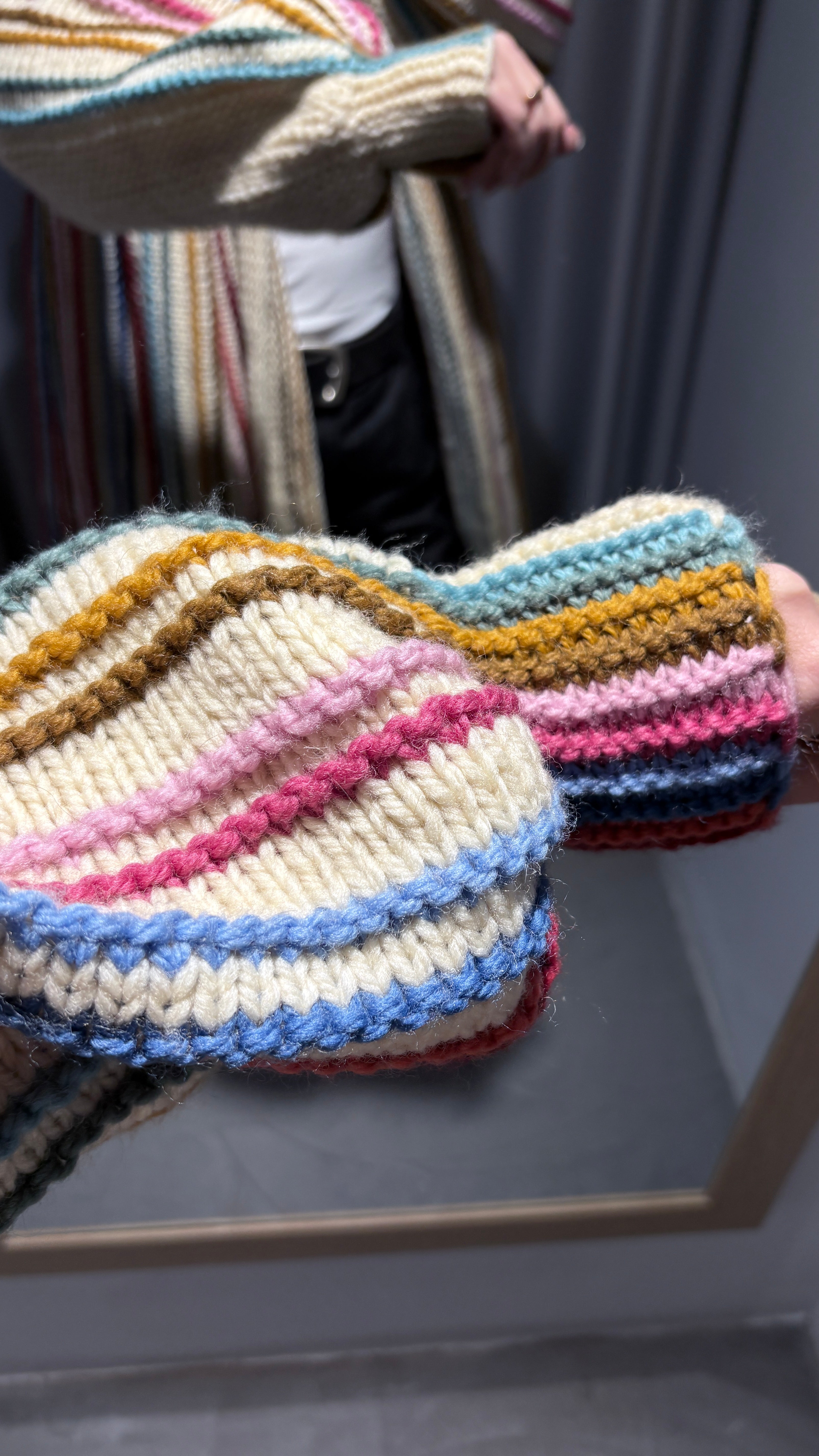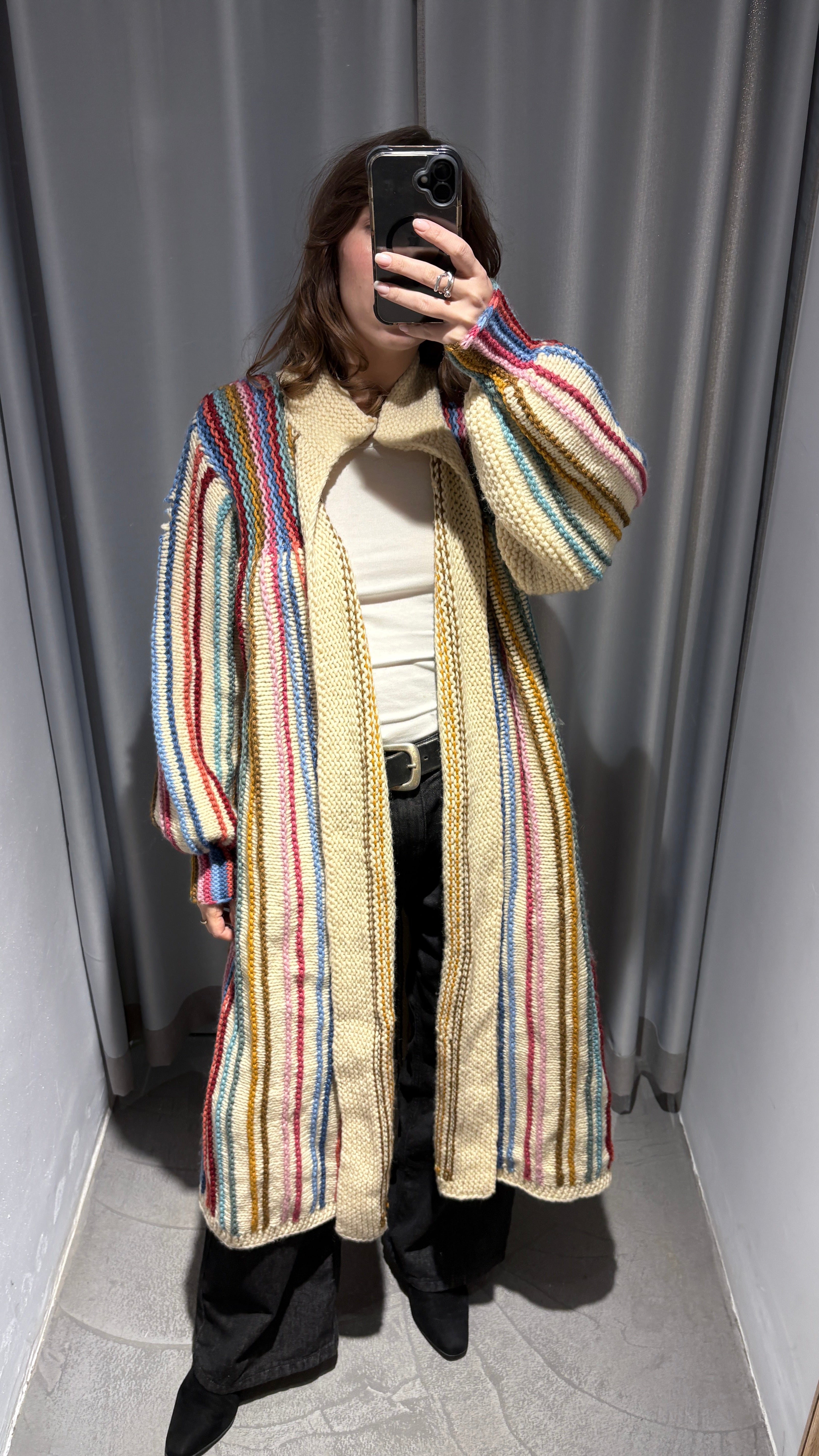 Vintage long cardigan, typical of Scandinavian style. Handmade in chunky knit, with multicolored vertical stripes on a cream background. From Denmark.