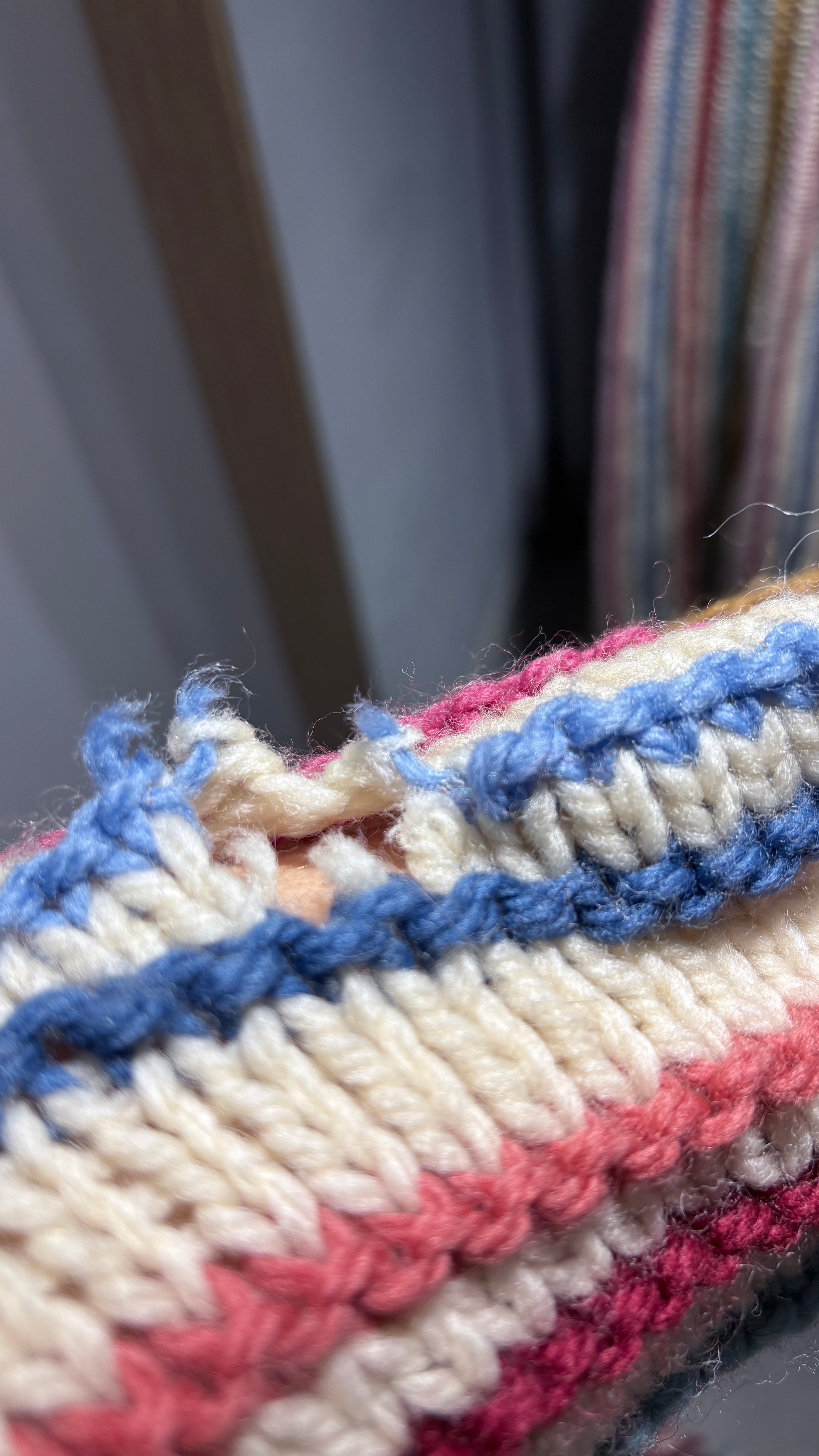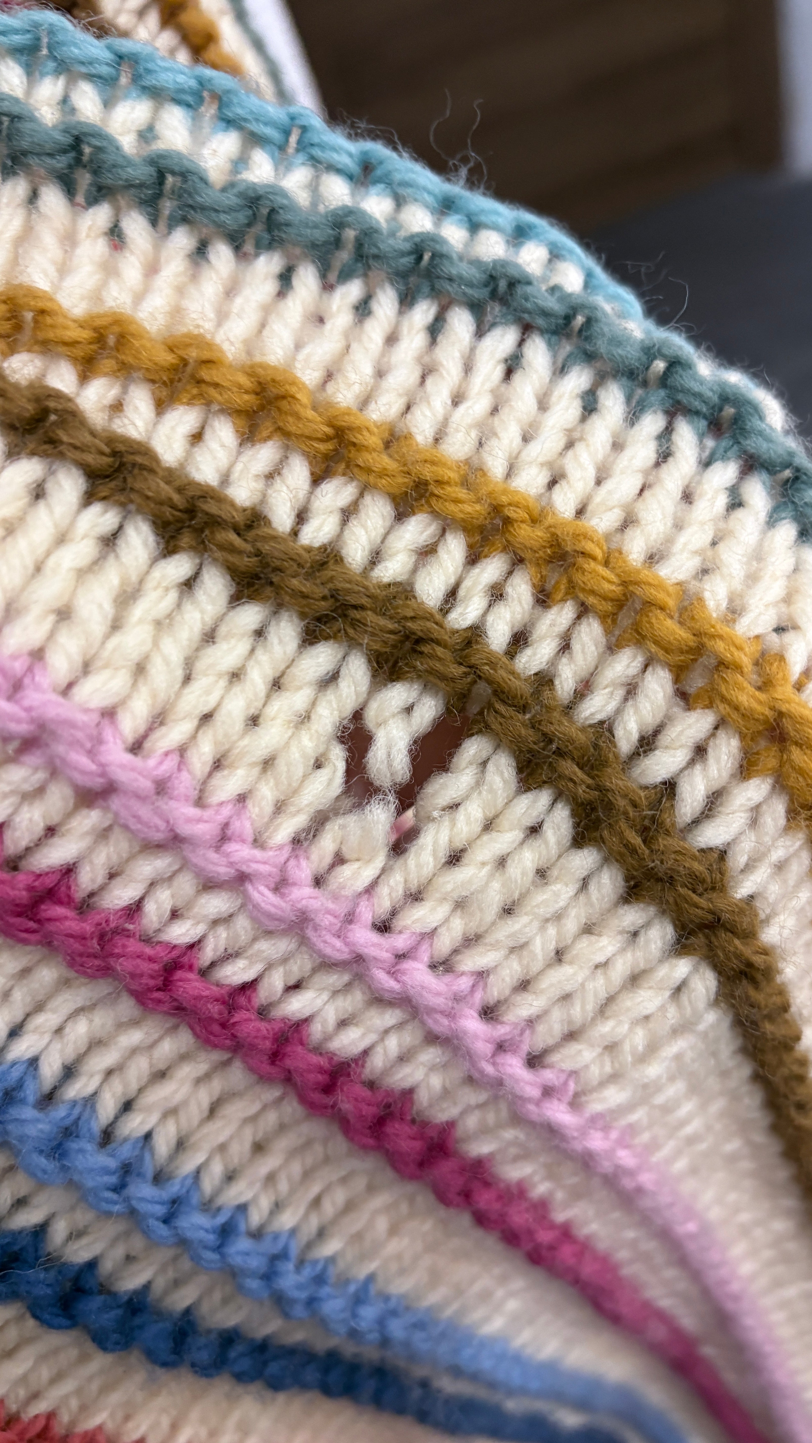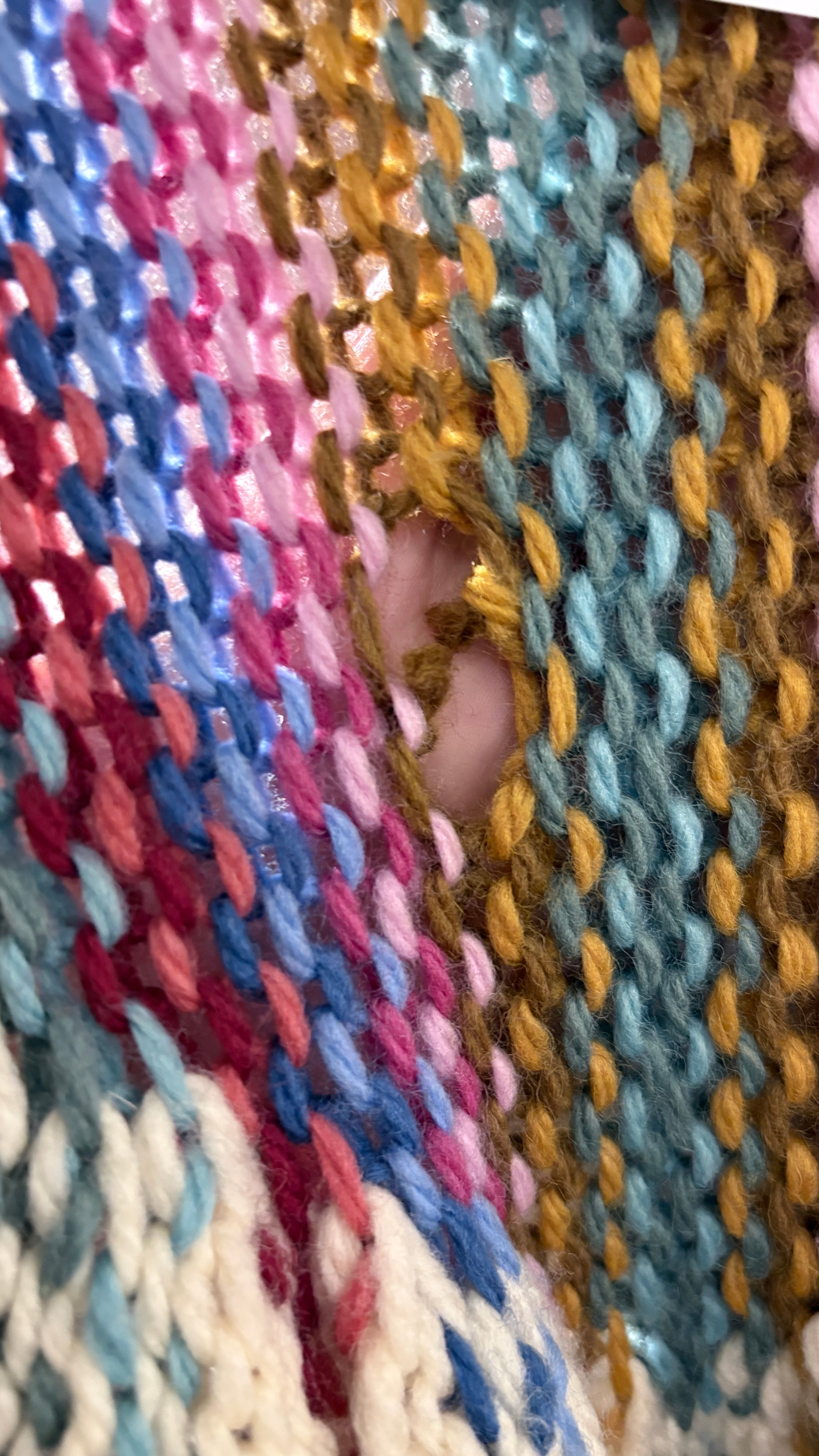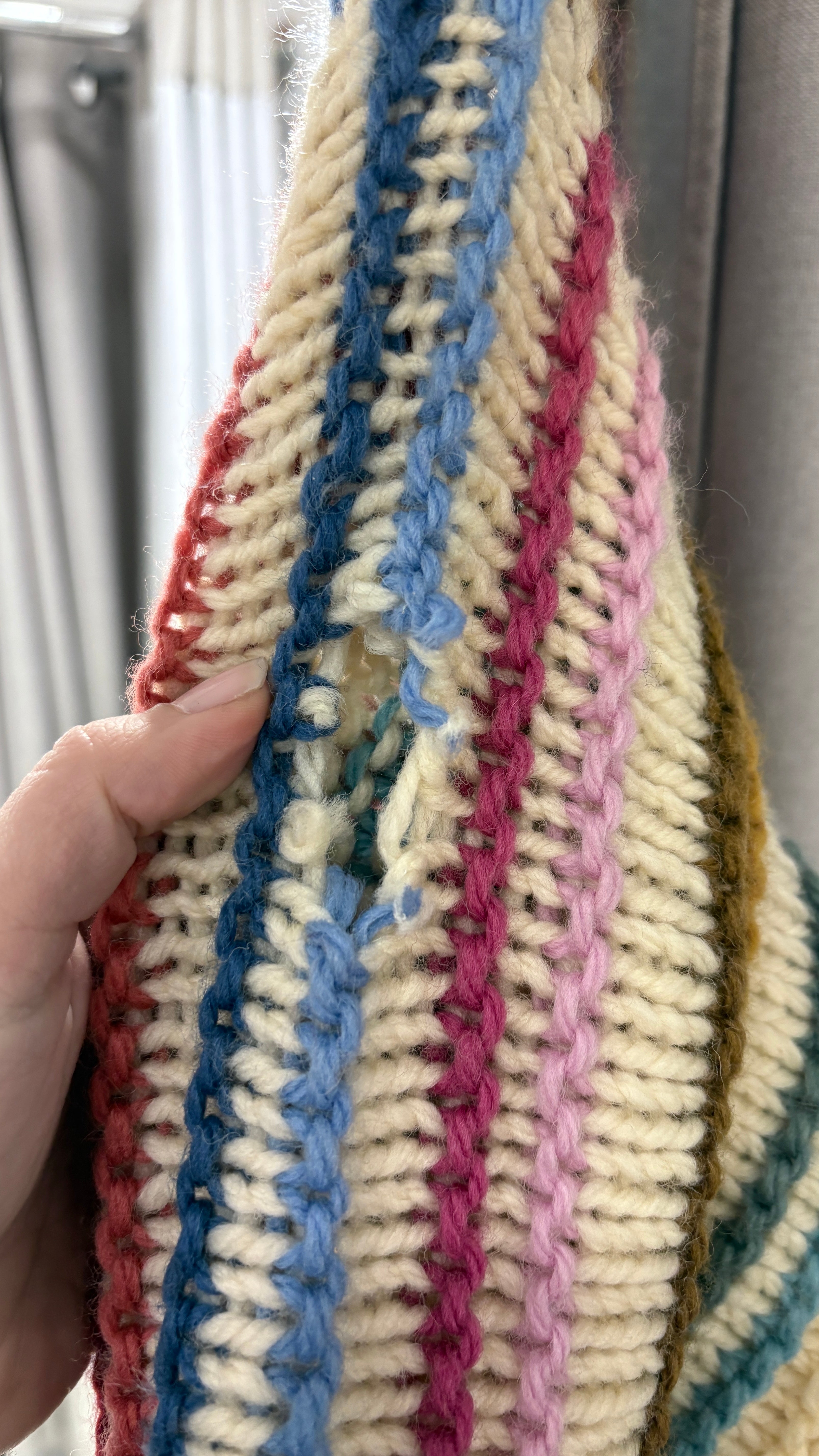 Vintage long cardigan, typical of Scandinavian style. Handmade in chunky knit, with multicolored vertical stripes on a cream background. From Denmark.