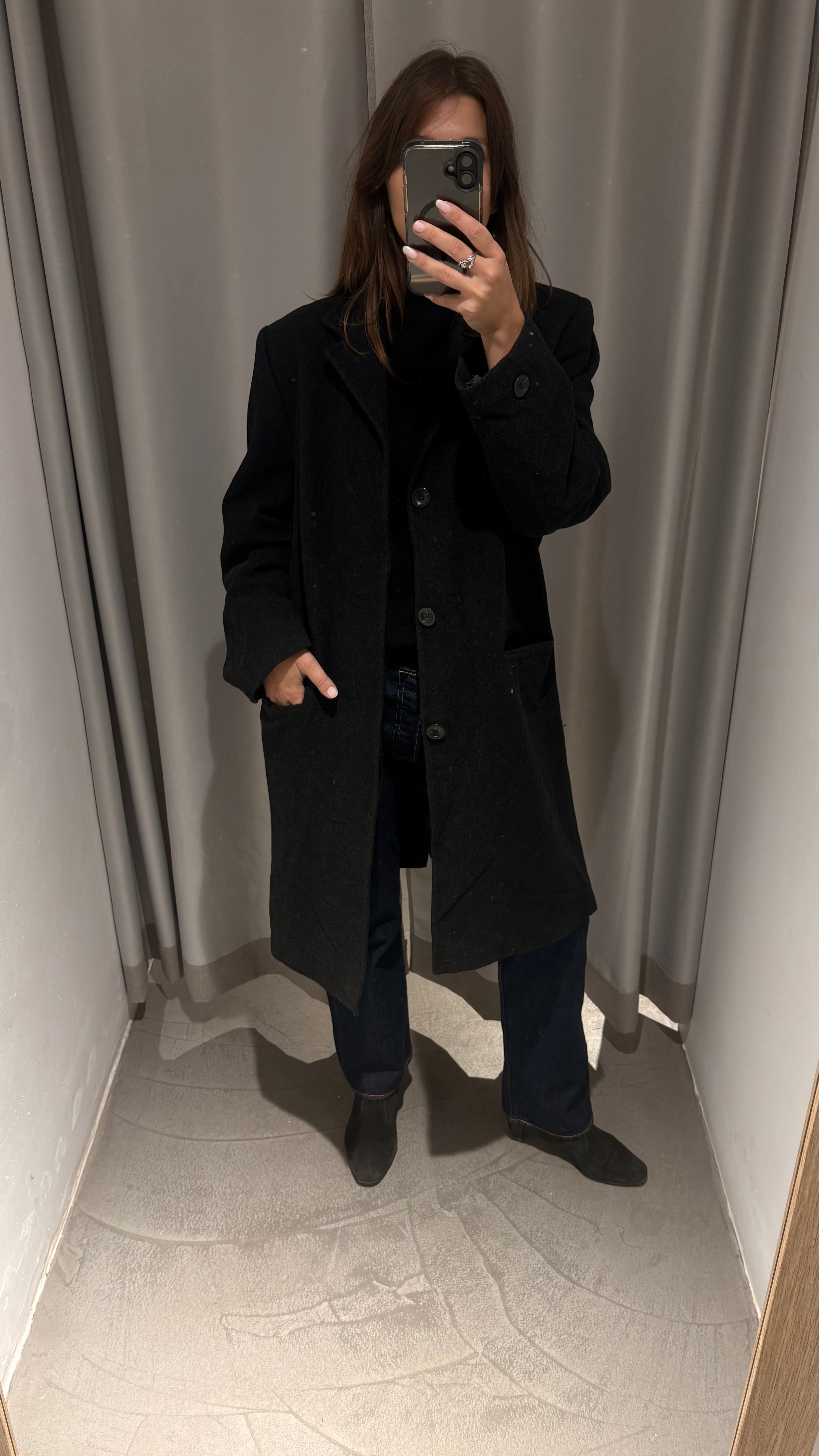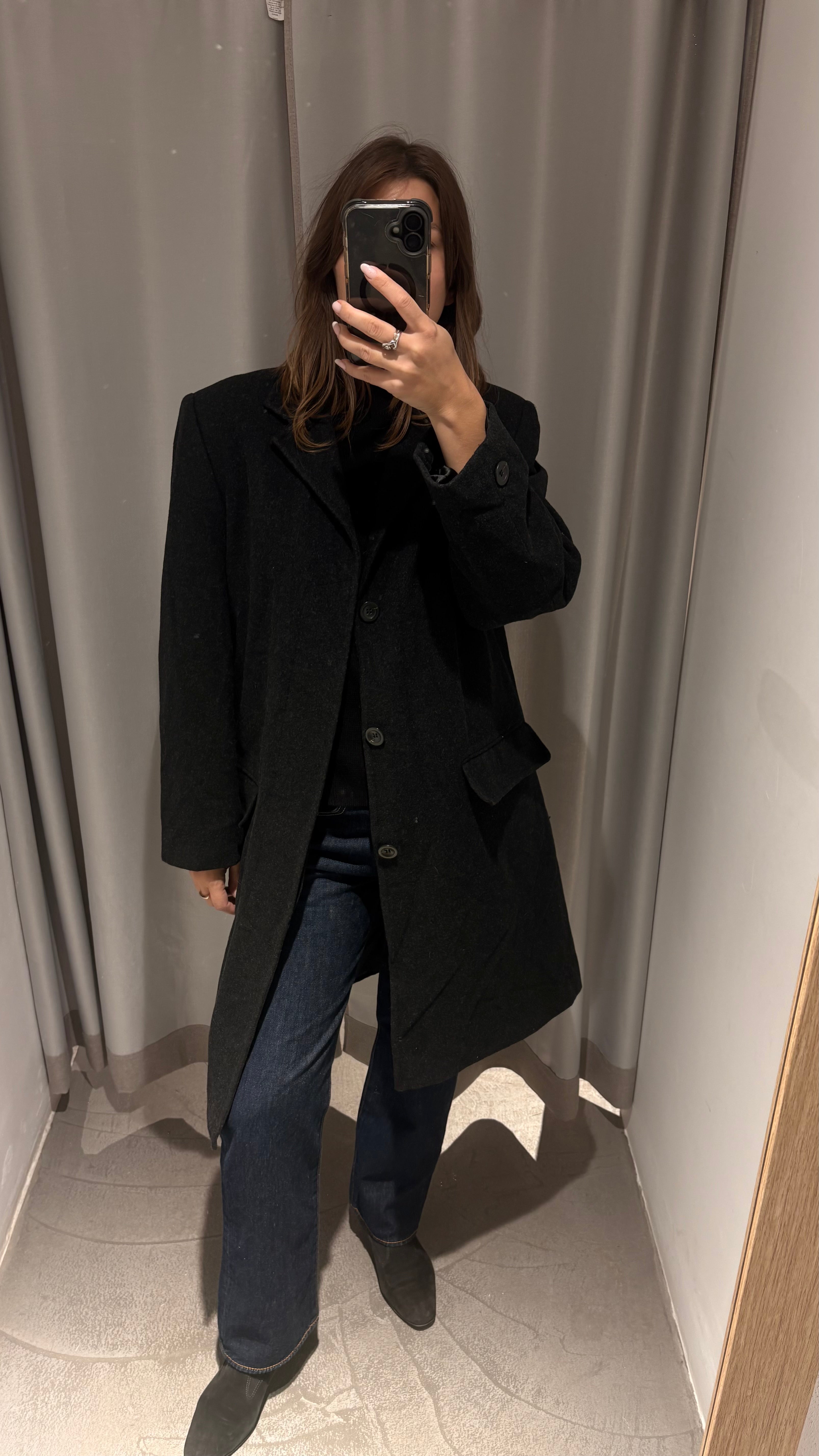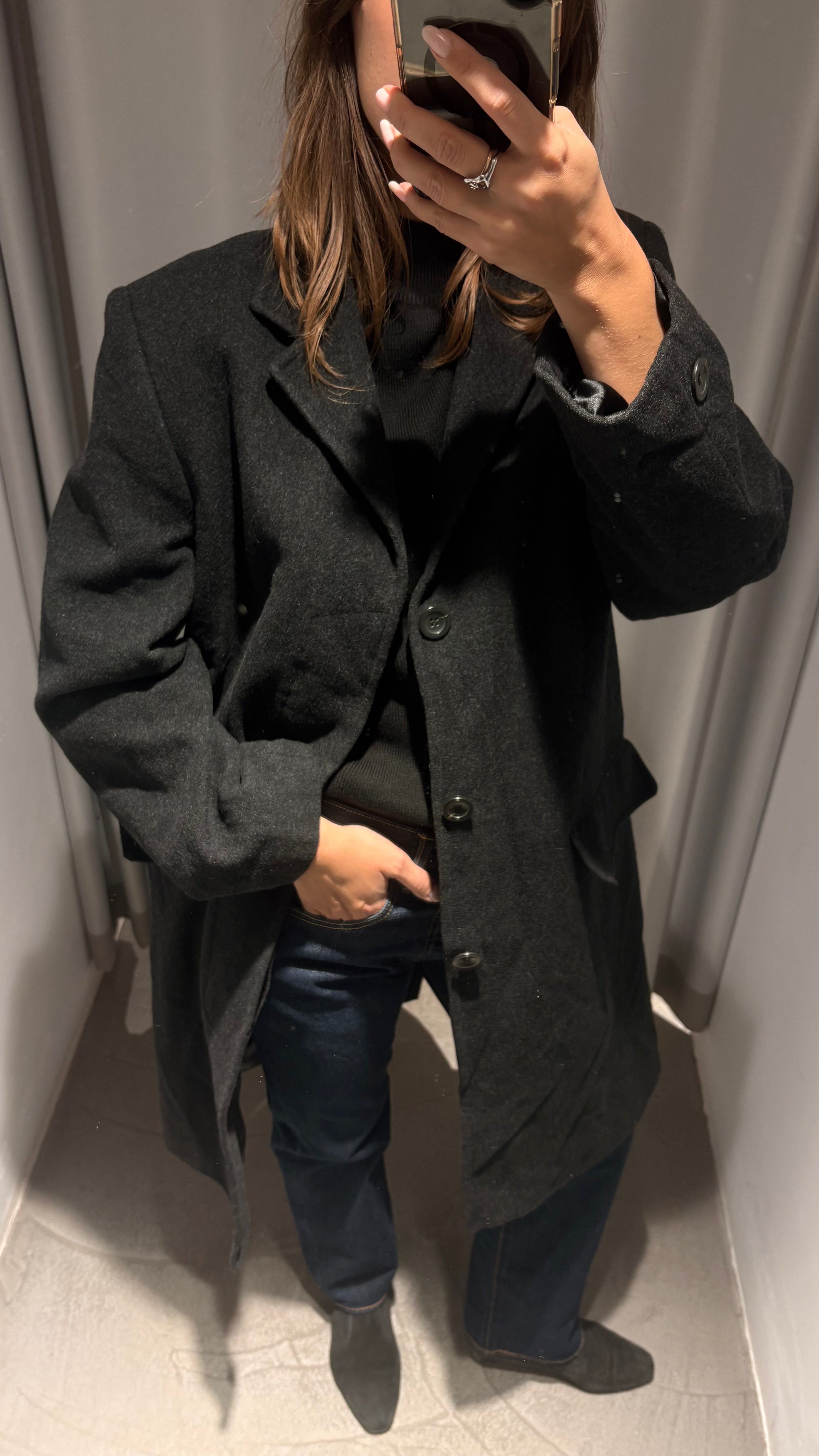 Abrigo gris de corte clásico y ligeramente masculino, estilo oversize. 80% lana, muy calentito y suave. Largo medio, elegante pero también perfecto para looks casual con vaqueros y zapatillas. Estado impecable. Un básico imprescindible en cualquier armario