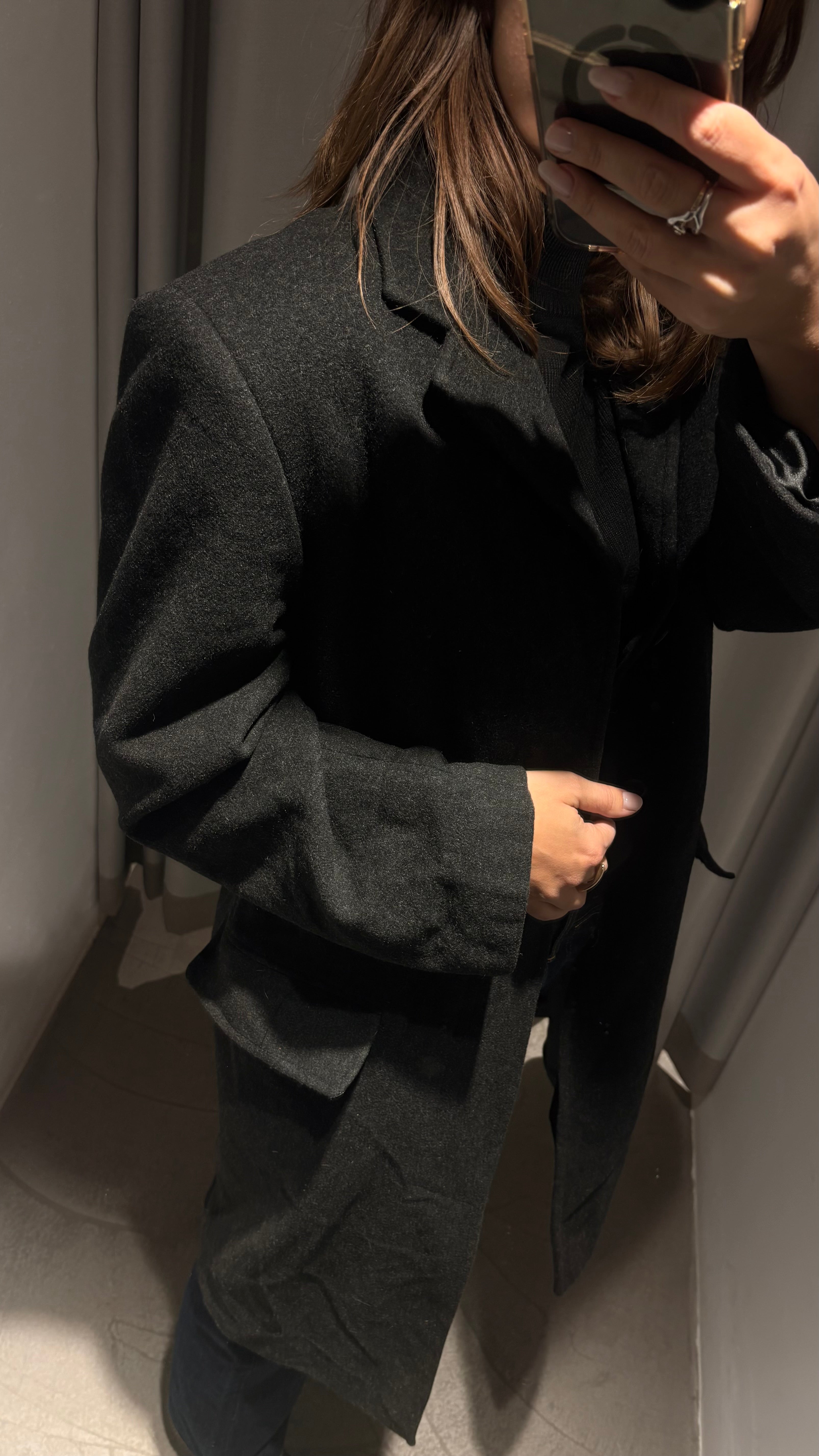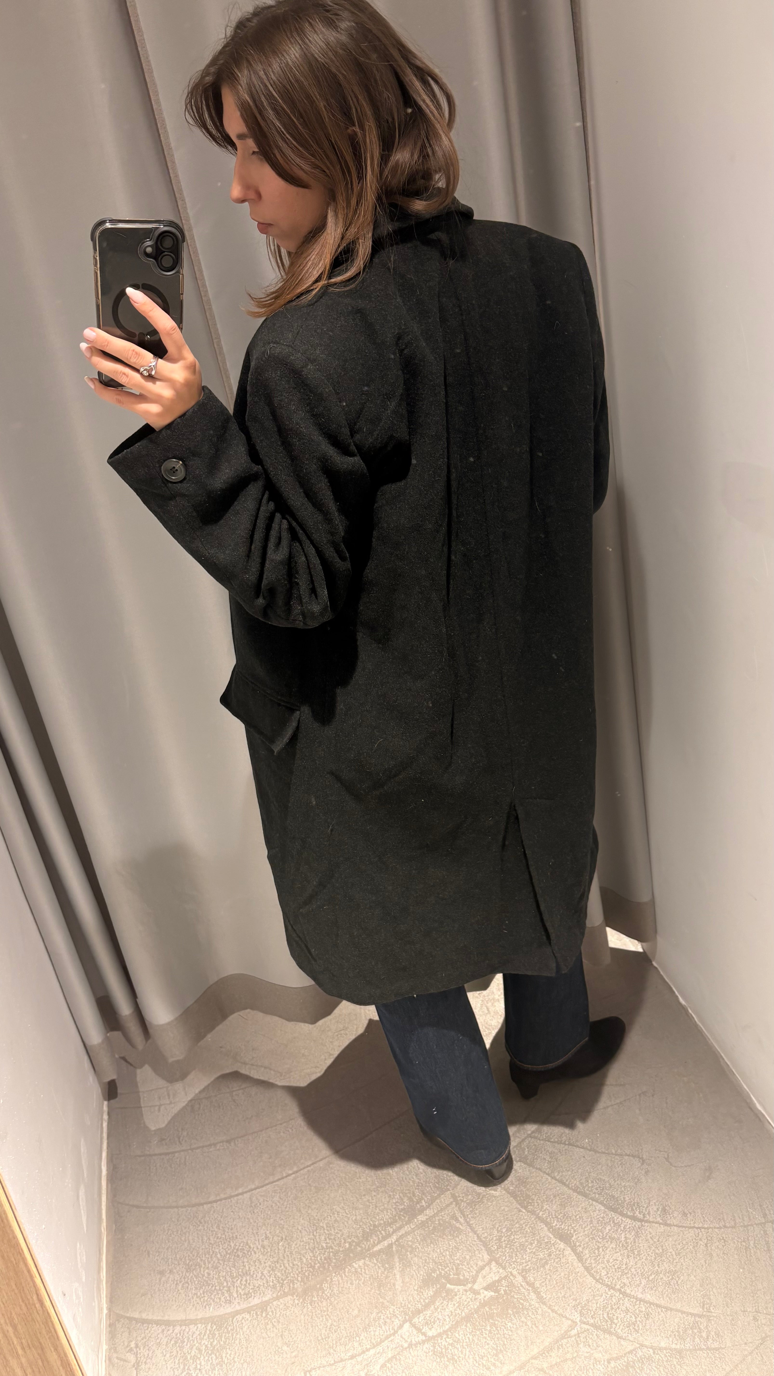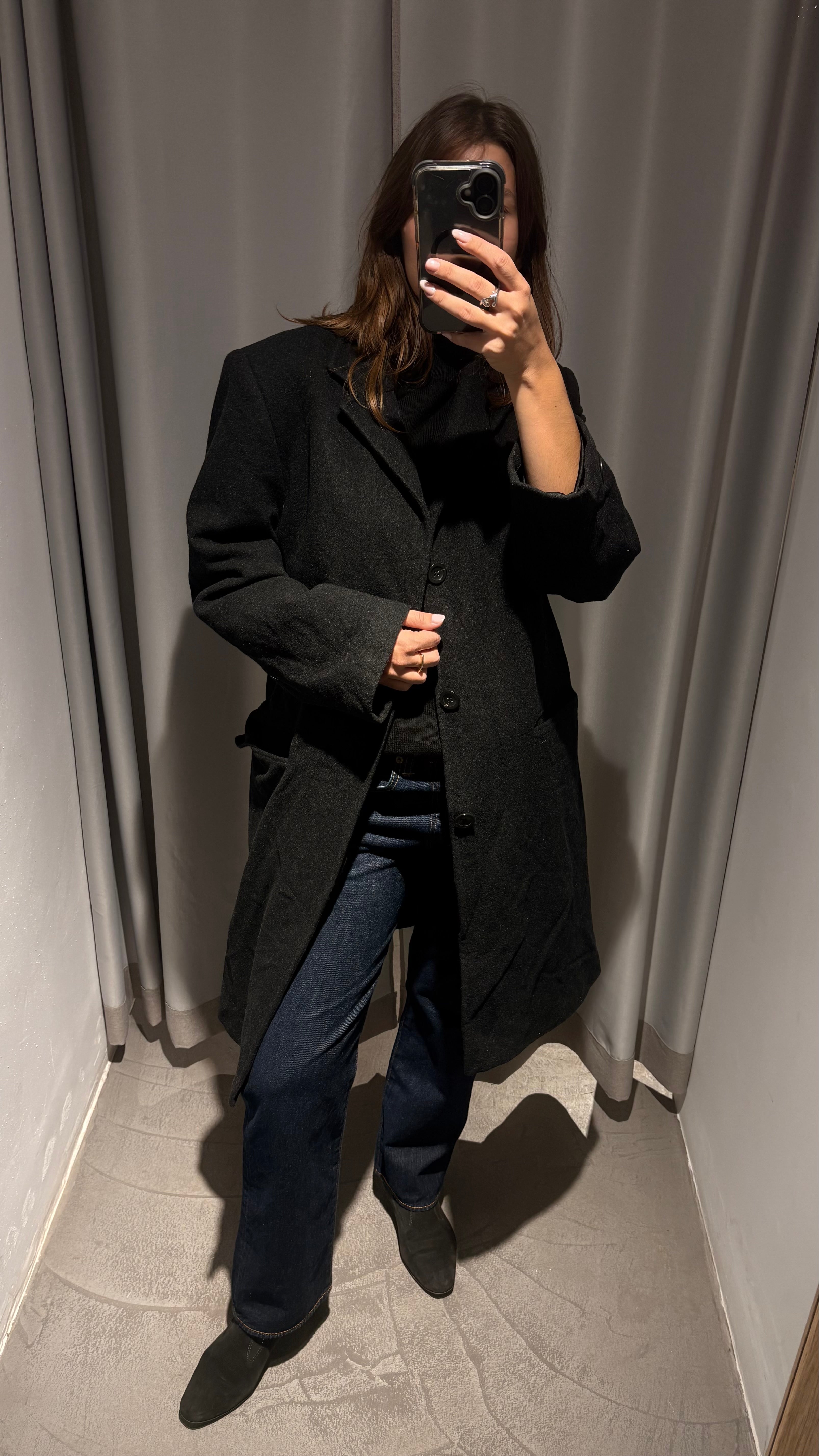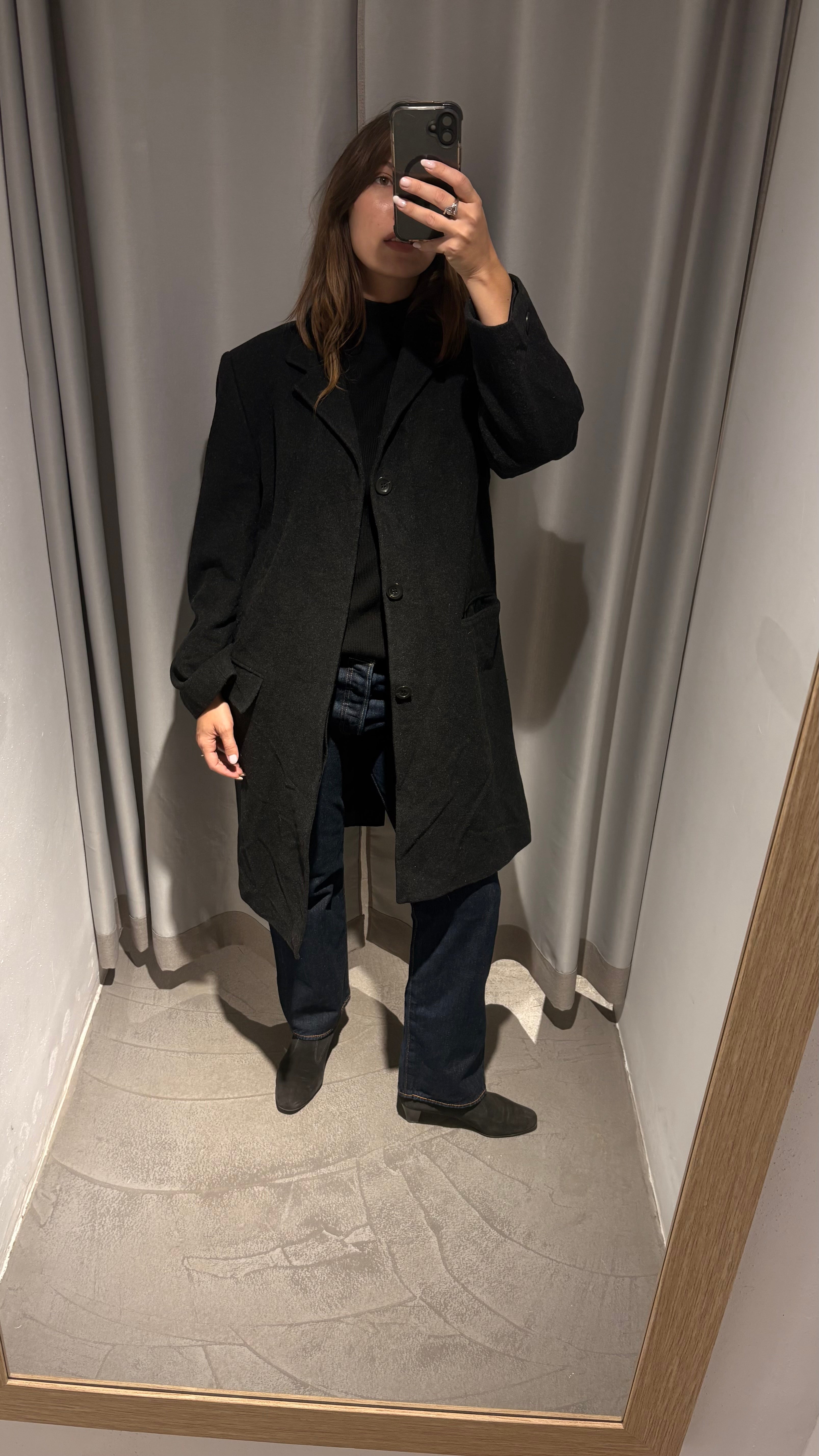 Abrigo gris de corte clásico y ligeramente masculino, estilo oversize. 80% lana, muy calentito y suave. Largo medio, elegante pero también perfecto para looks casual con vaqueros y zapatillas. Estado impecable. Un básico imprescindible en cualquier armario