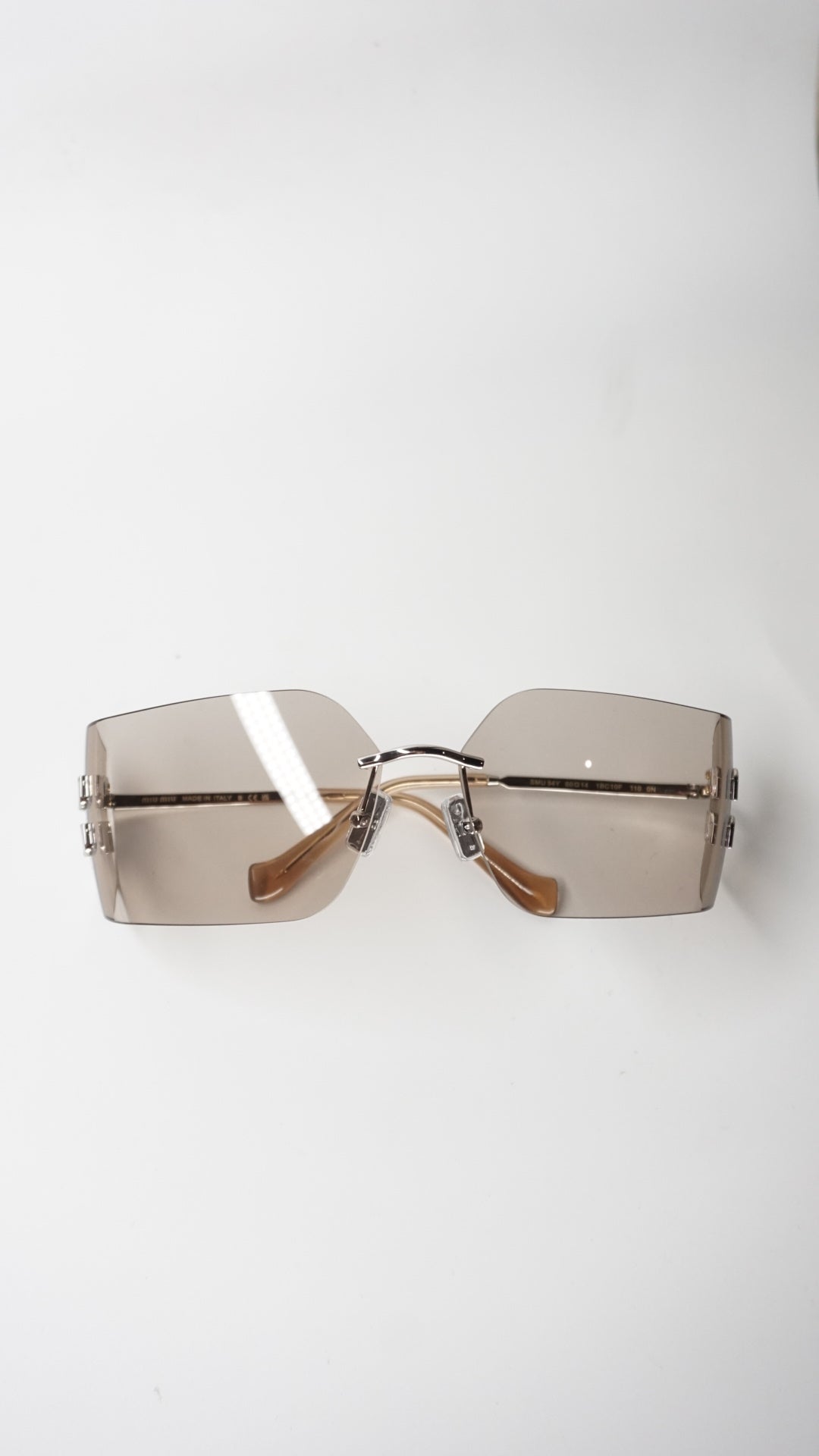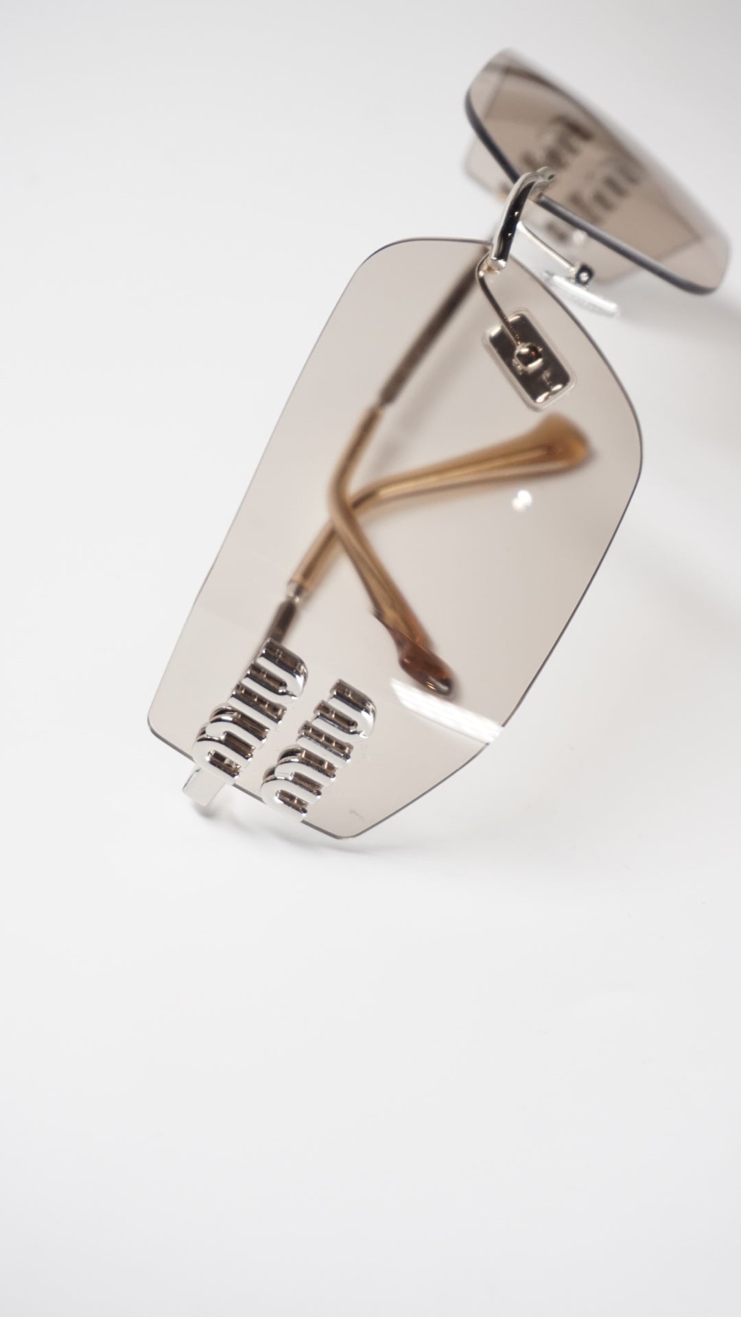 Featuring striking cut-out Miu Miu logos directly on the lenses, gradient light brown oversized shields, and sleek silver temples with beige acetate tips, they are both glamorous and unapologetically statement-making.