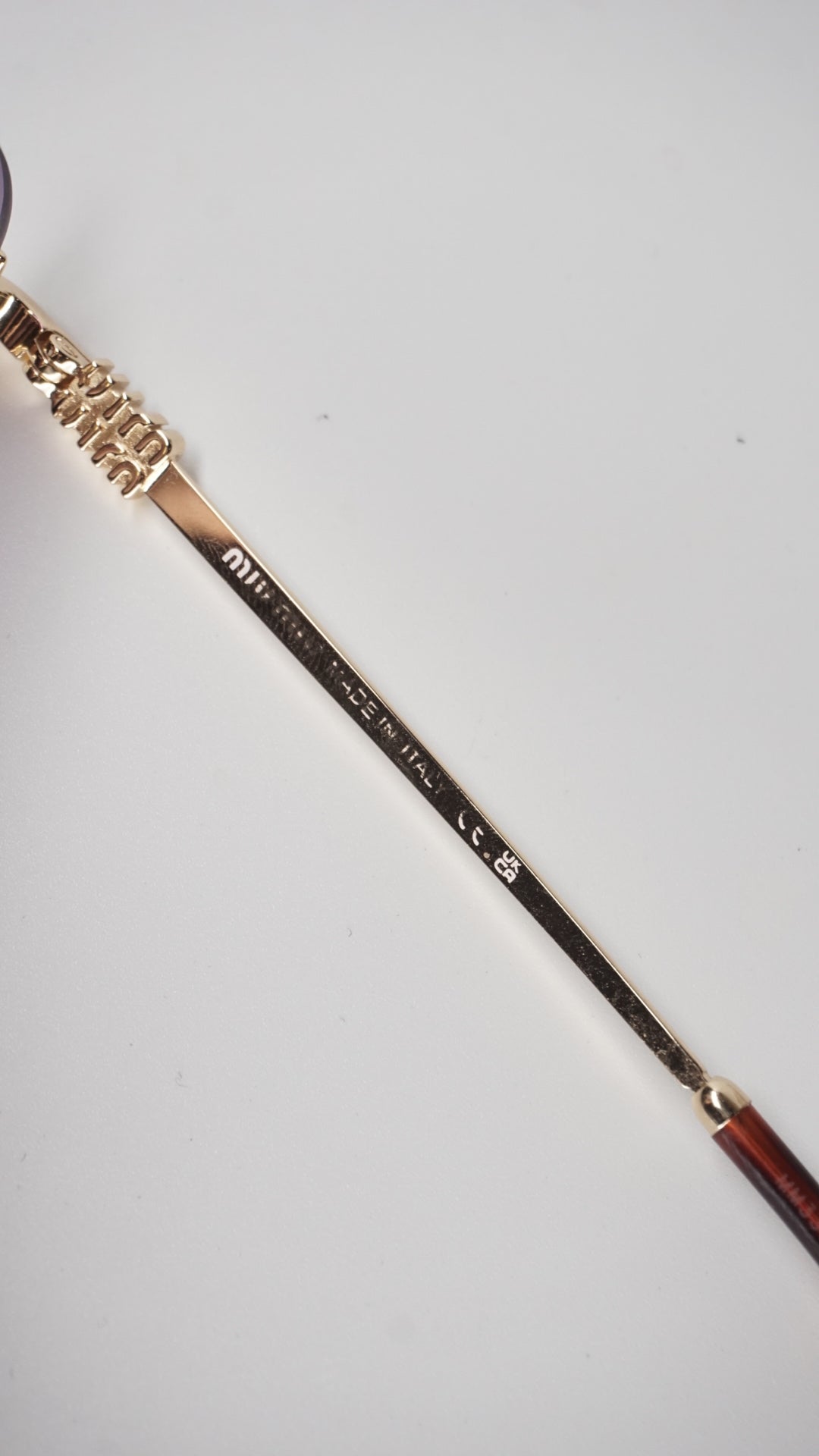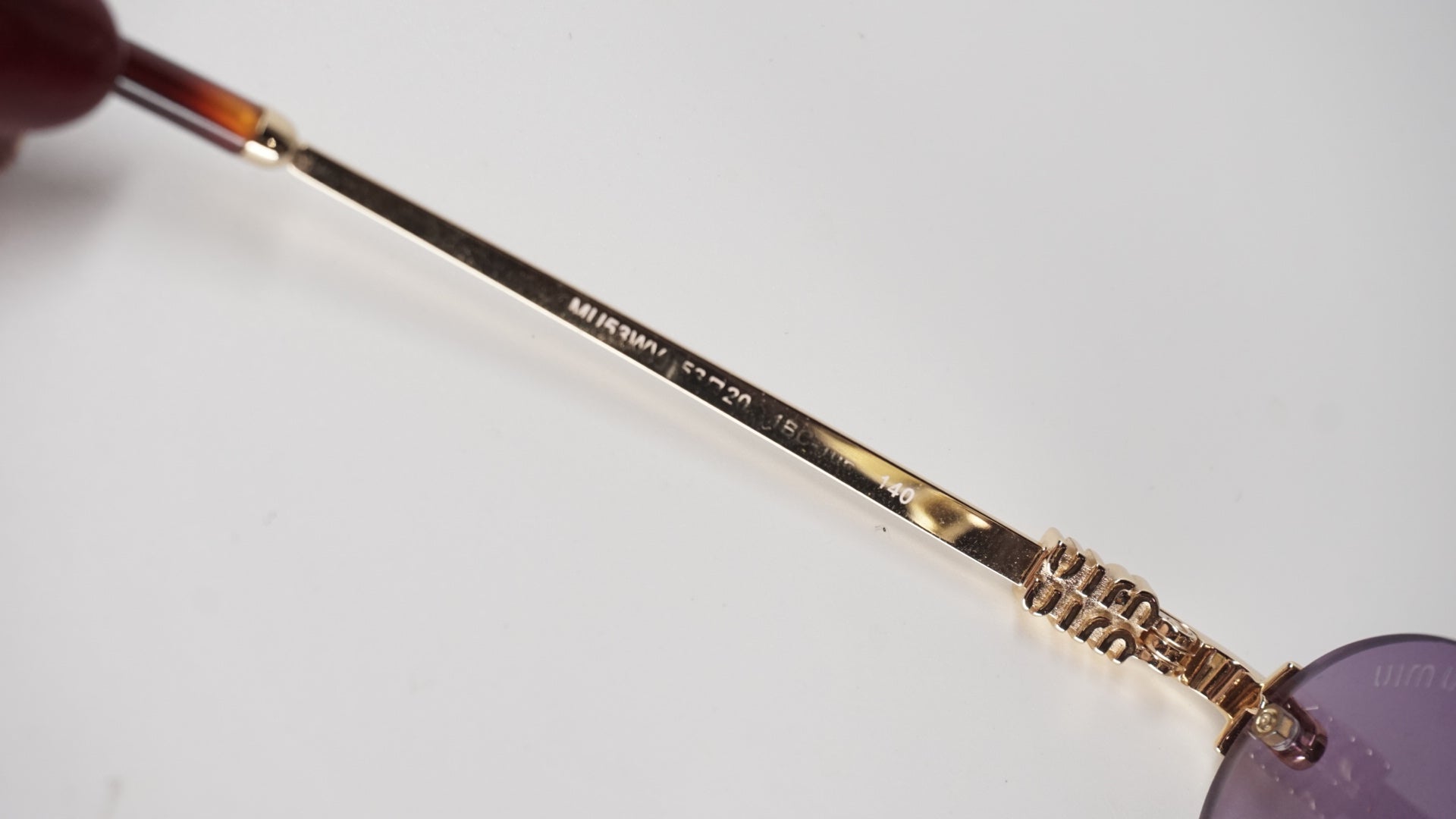 Not your average rimless shades. These vintage Miu Miu MU 53W sunglasses are all about playful minimalism and bold colour. The oval purple gradient lenses feel distinctly Y2K, while the slim golden arms feature the iconic cut-out “Miu Miu” detailing — delicate yet instantly recognizable.