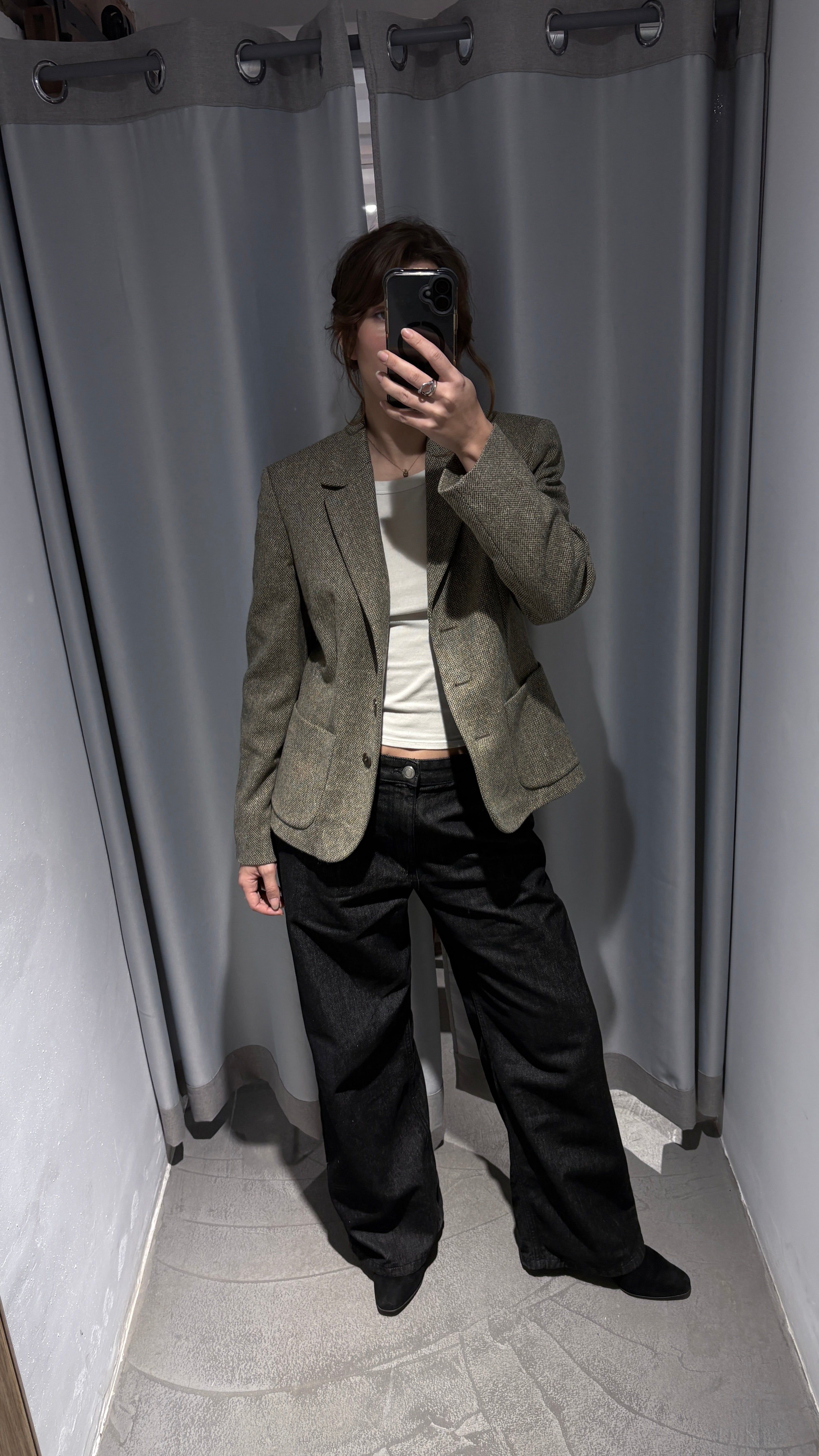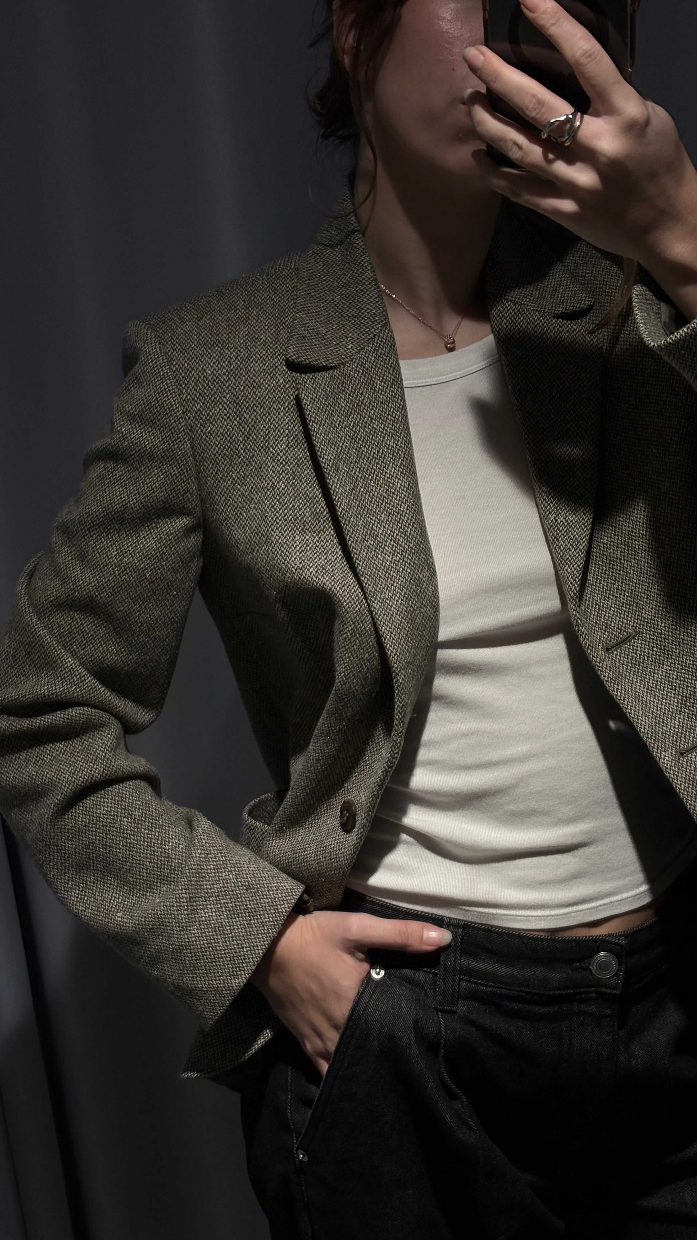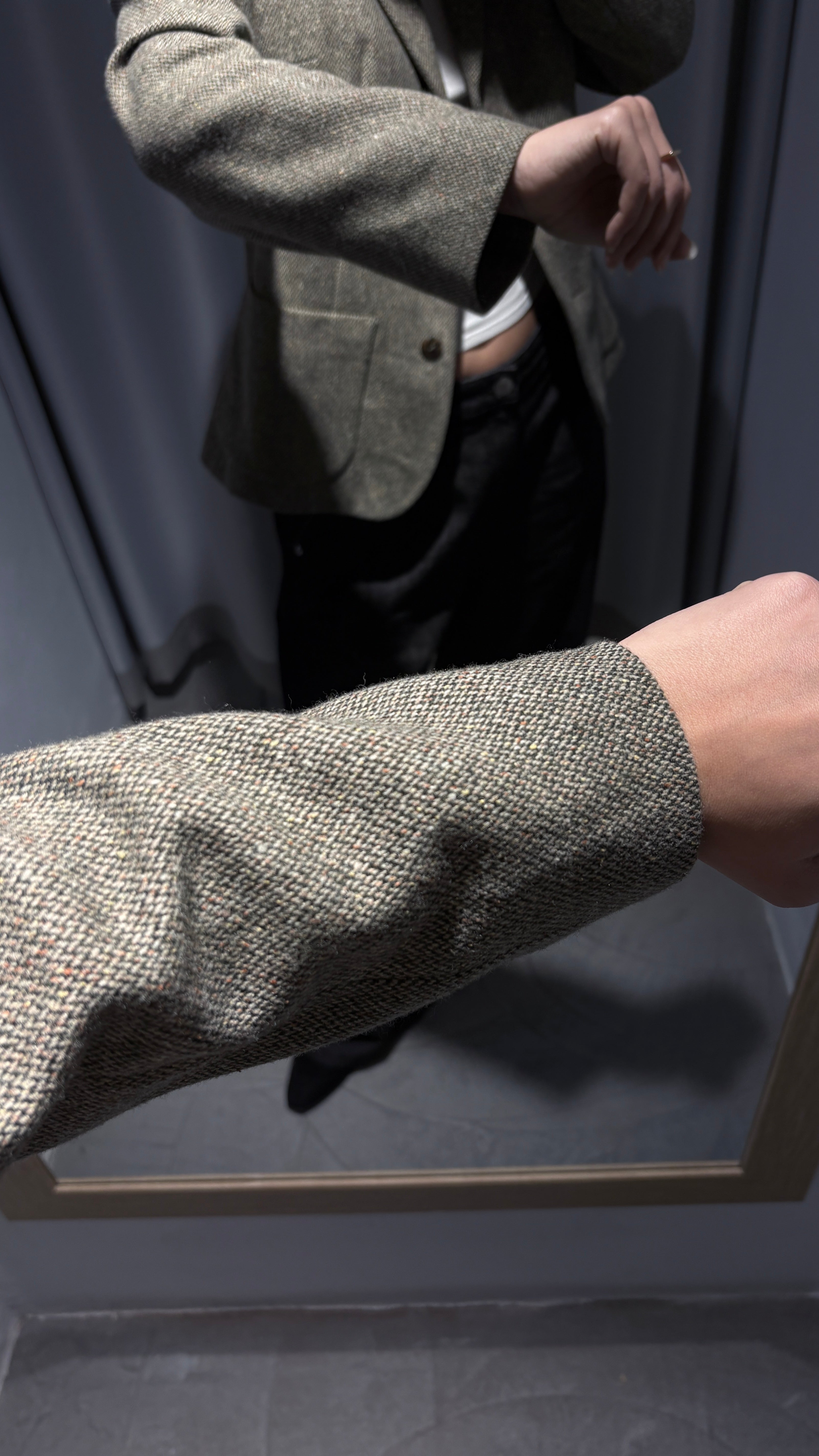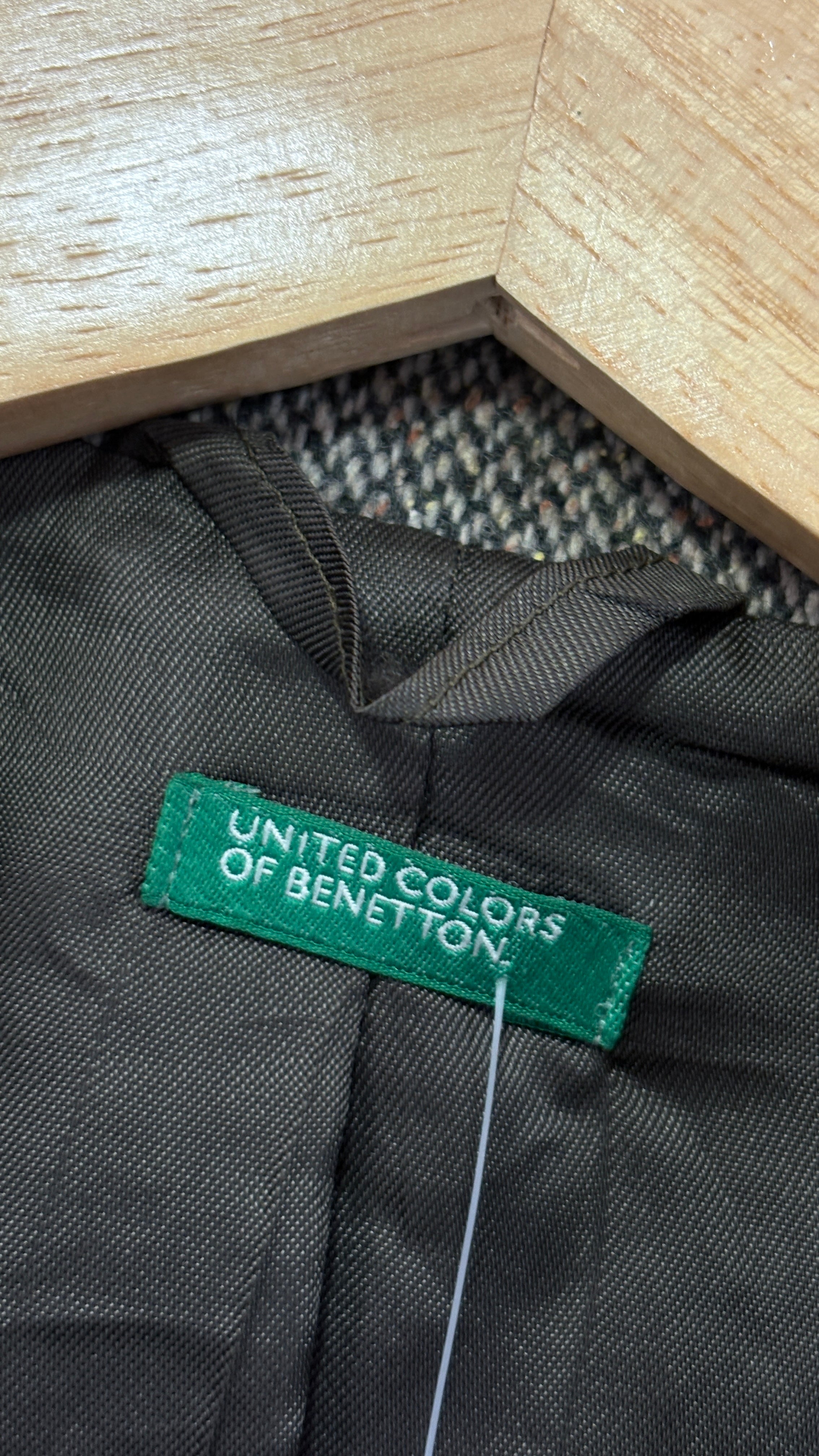 Short, fitted blazer in a soft and warm tweed-type wool fabric. Delicate pistachio green/khaki melange color, easy to style and perfect for everyday office or casual looks. Slightly tailored cut, flattering and comfortable. In excellent condition.