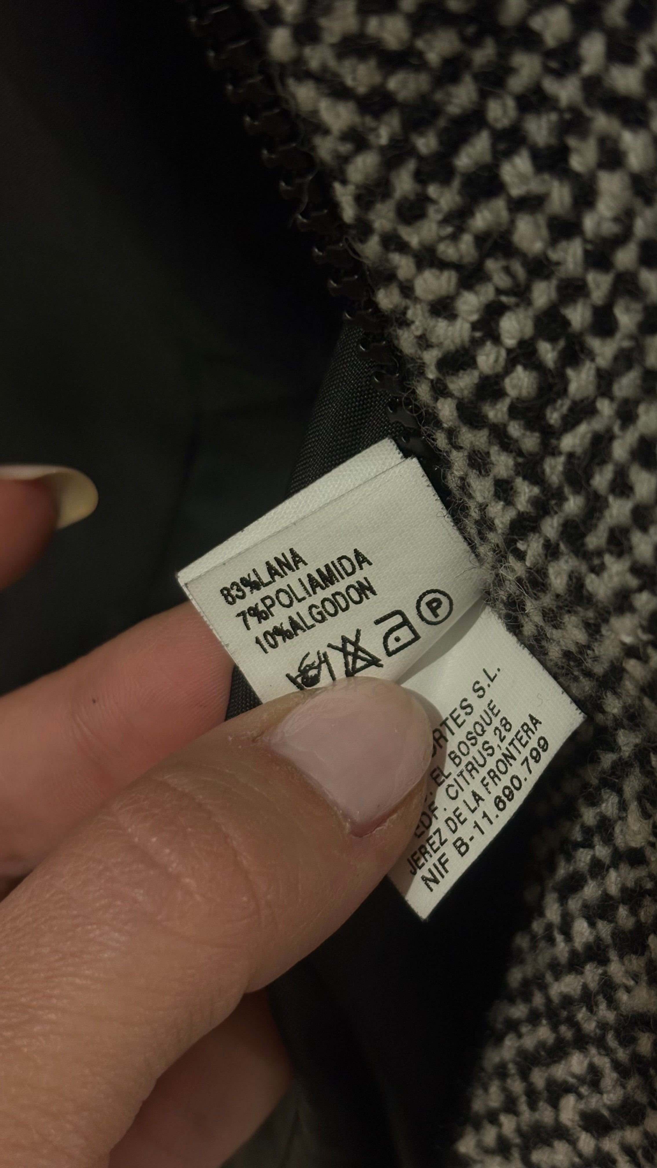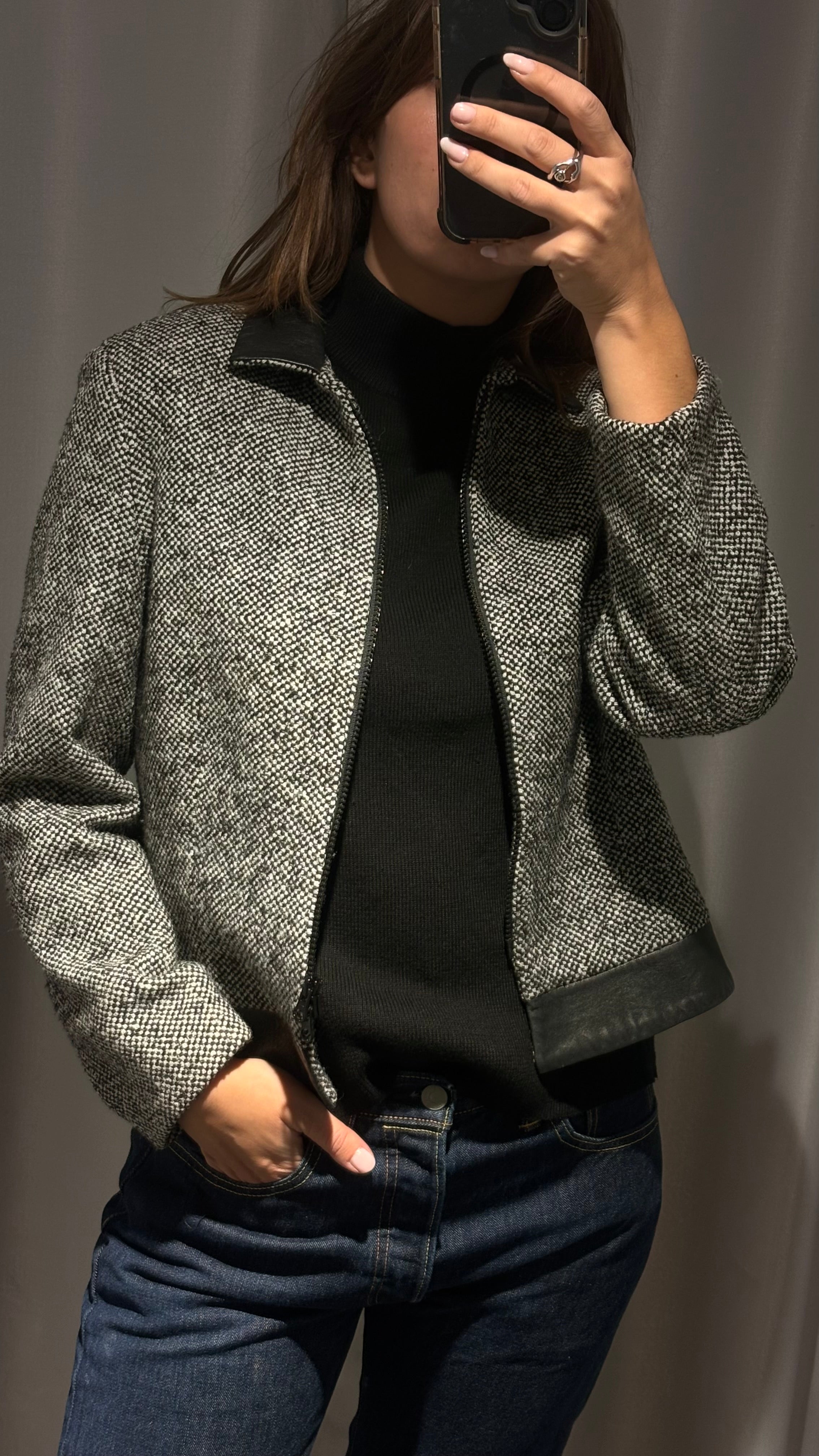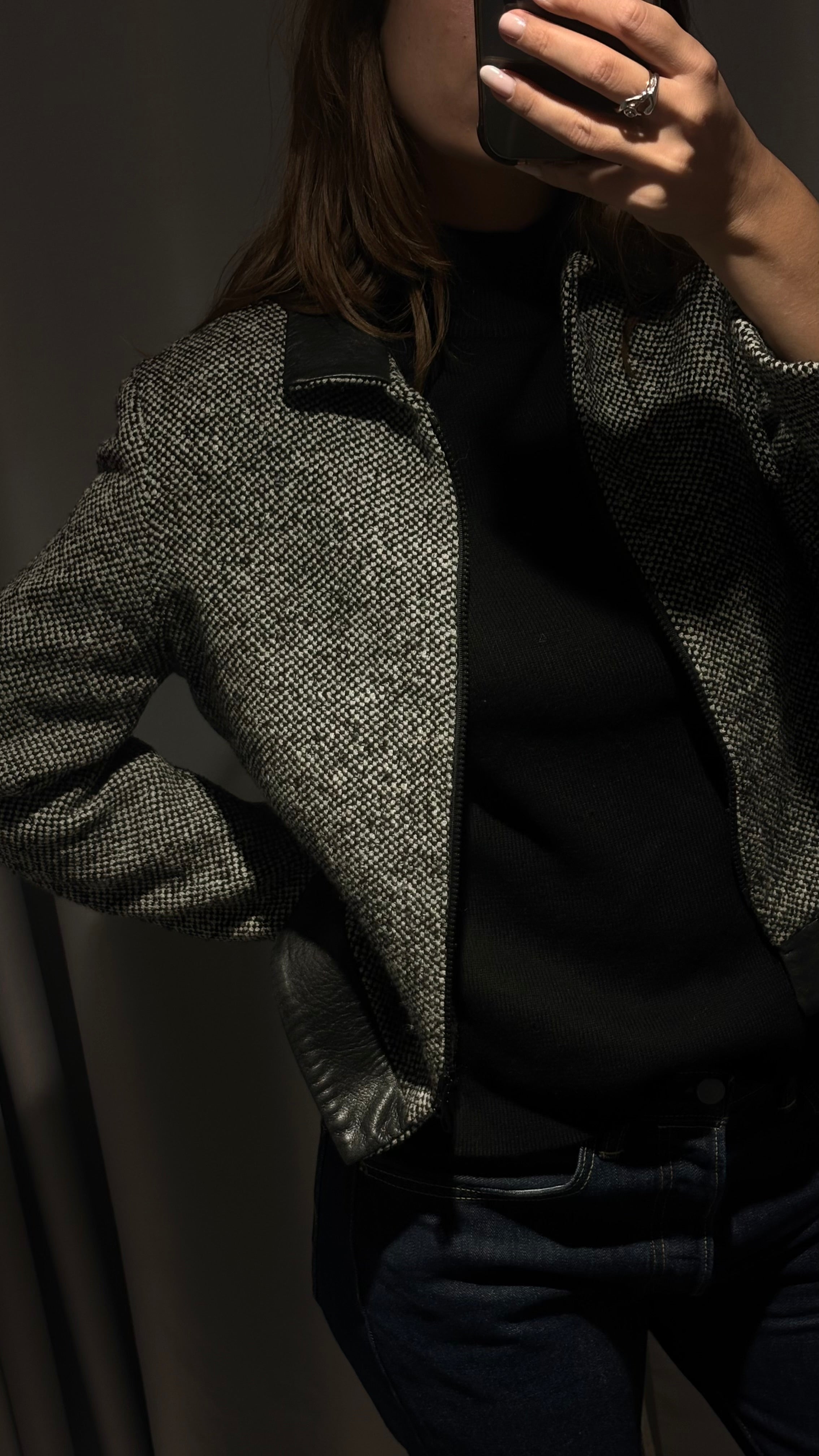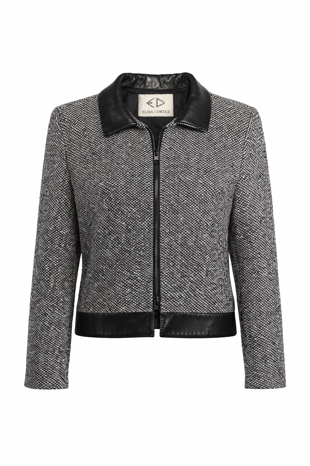Tweed wool jacket with natural sheepskin finishes premium quality, minimalist aesthetic.
