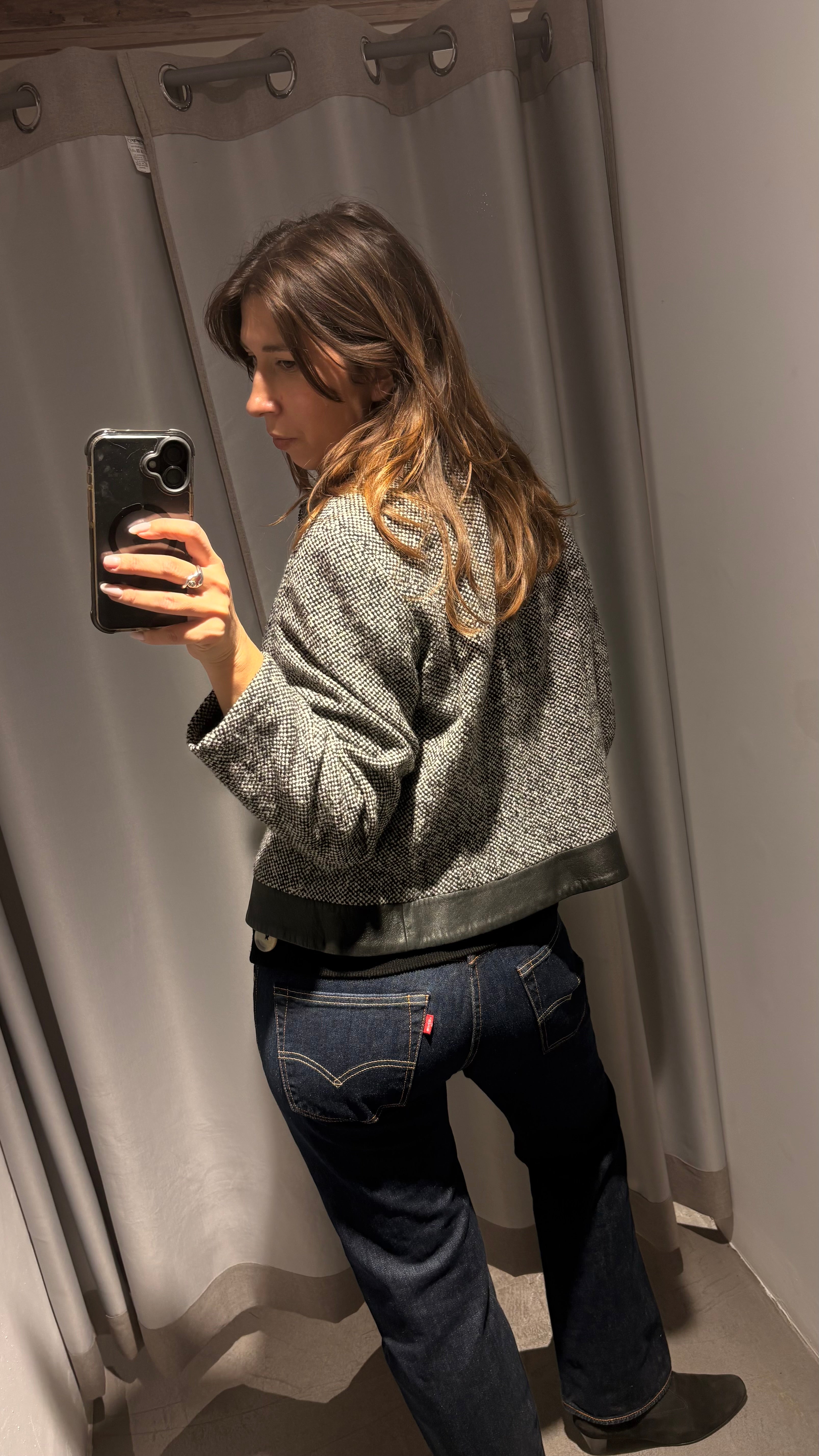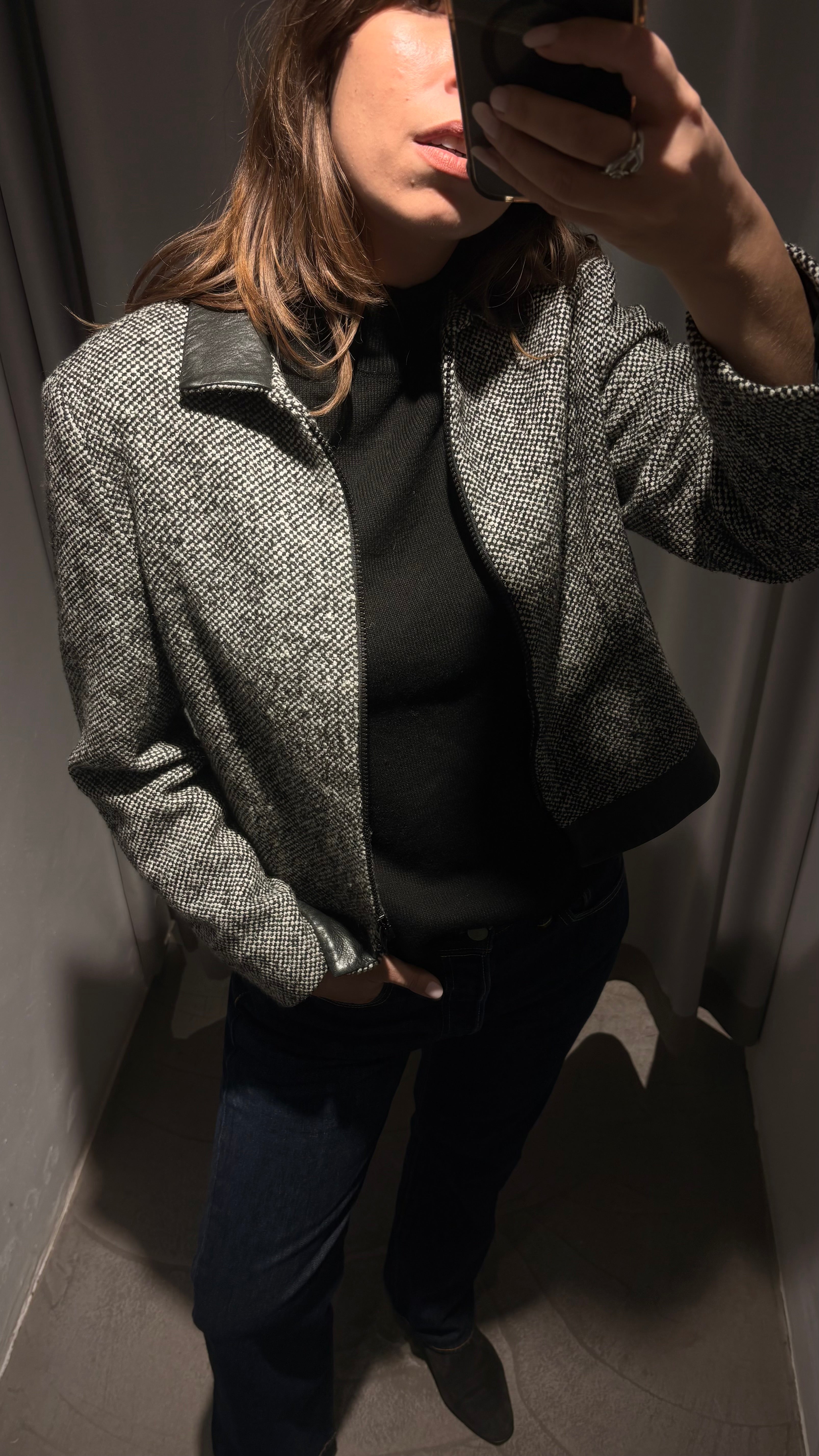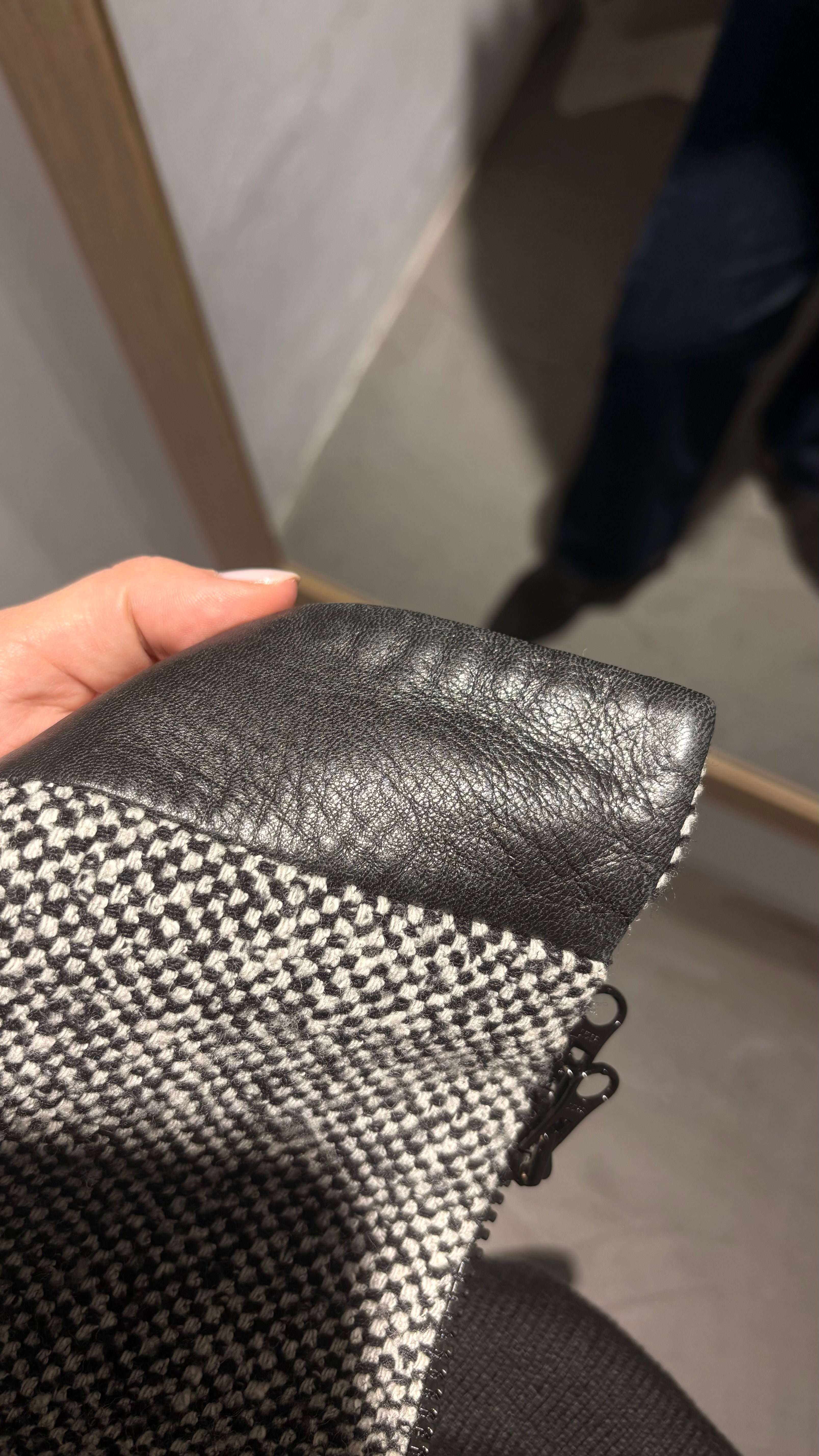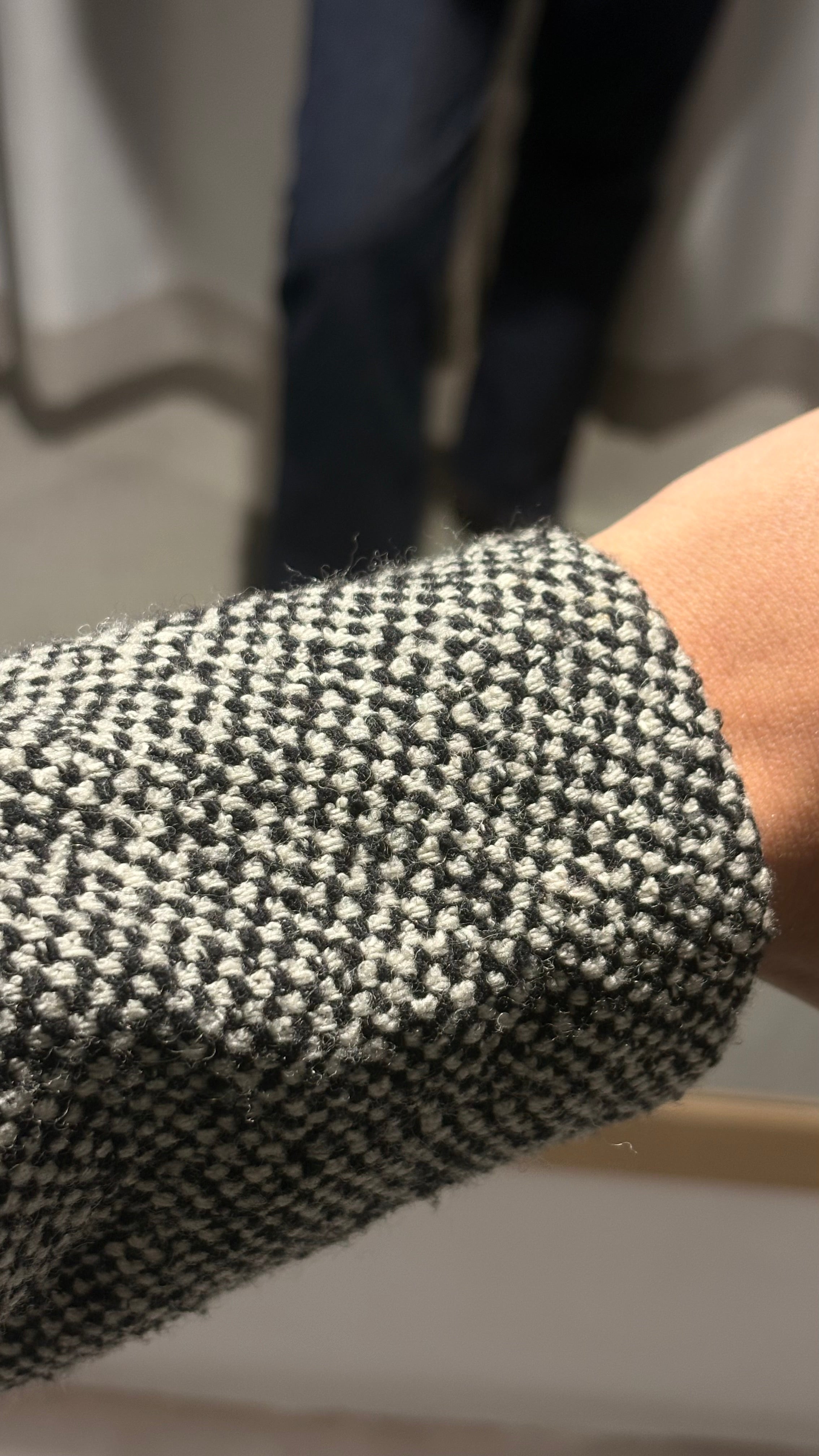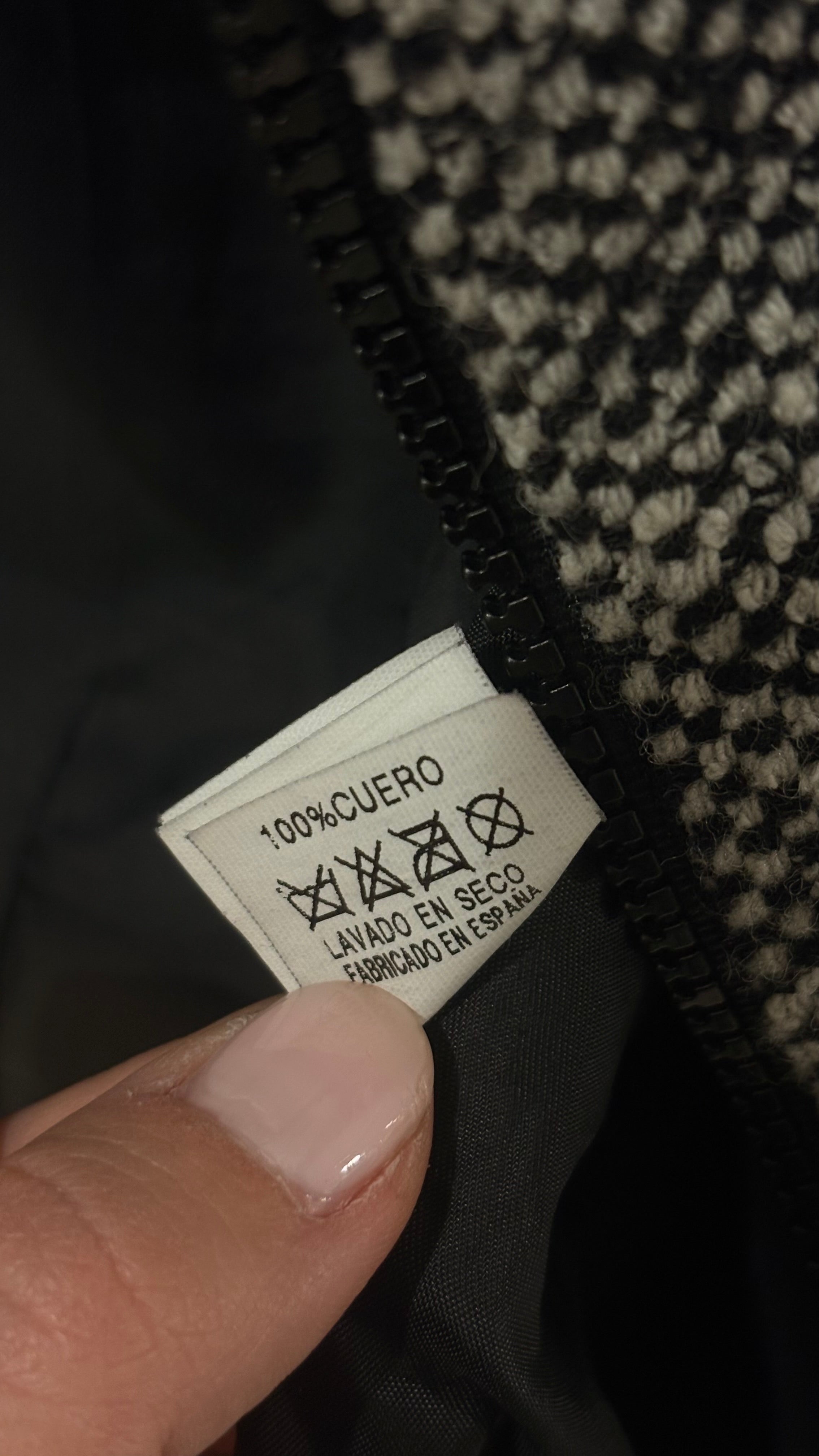 Tweed wool jacket with natural sheepskin finishes premium quality, minimalist aesthetic.