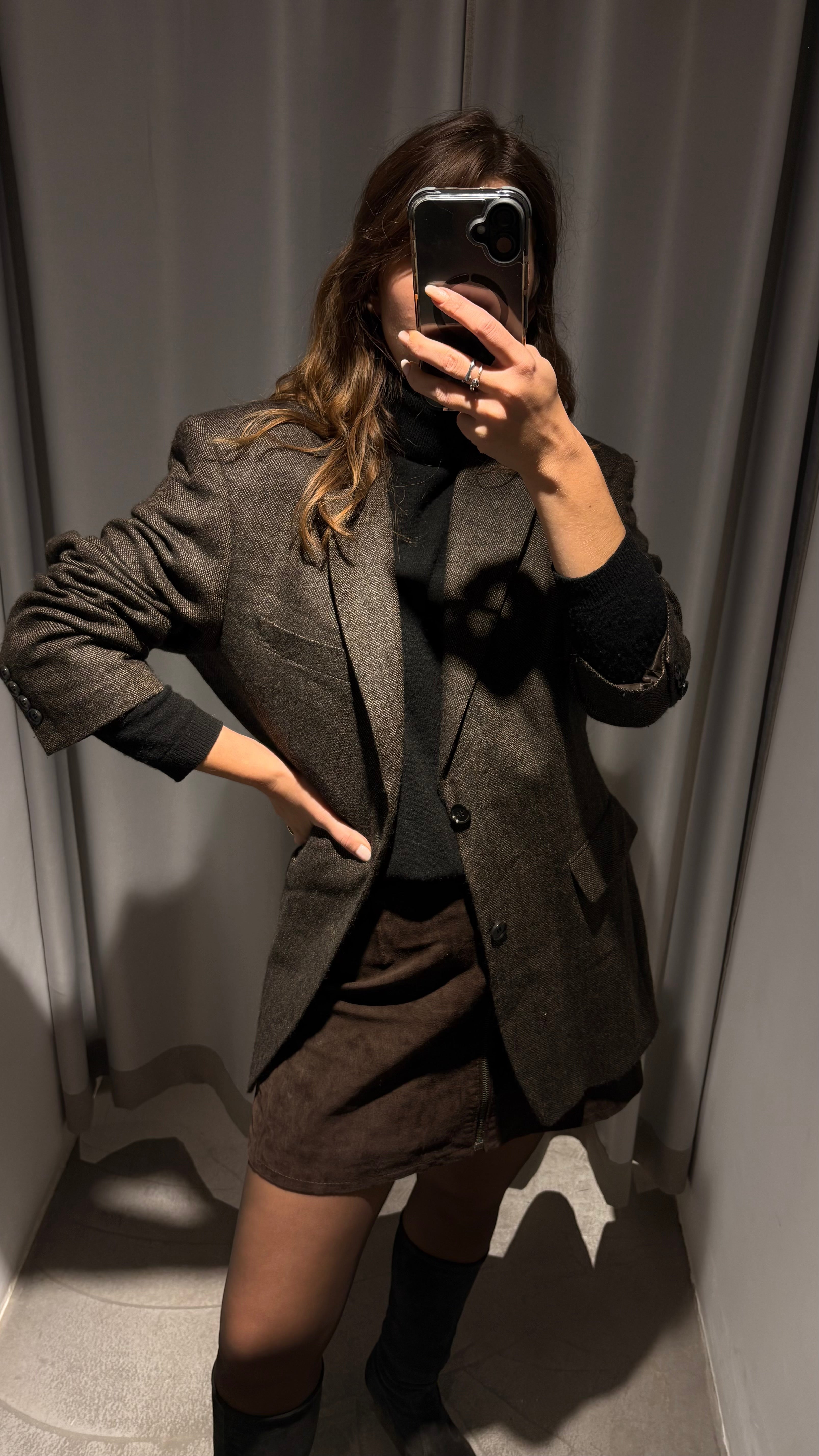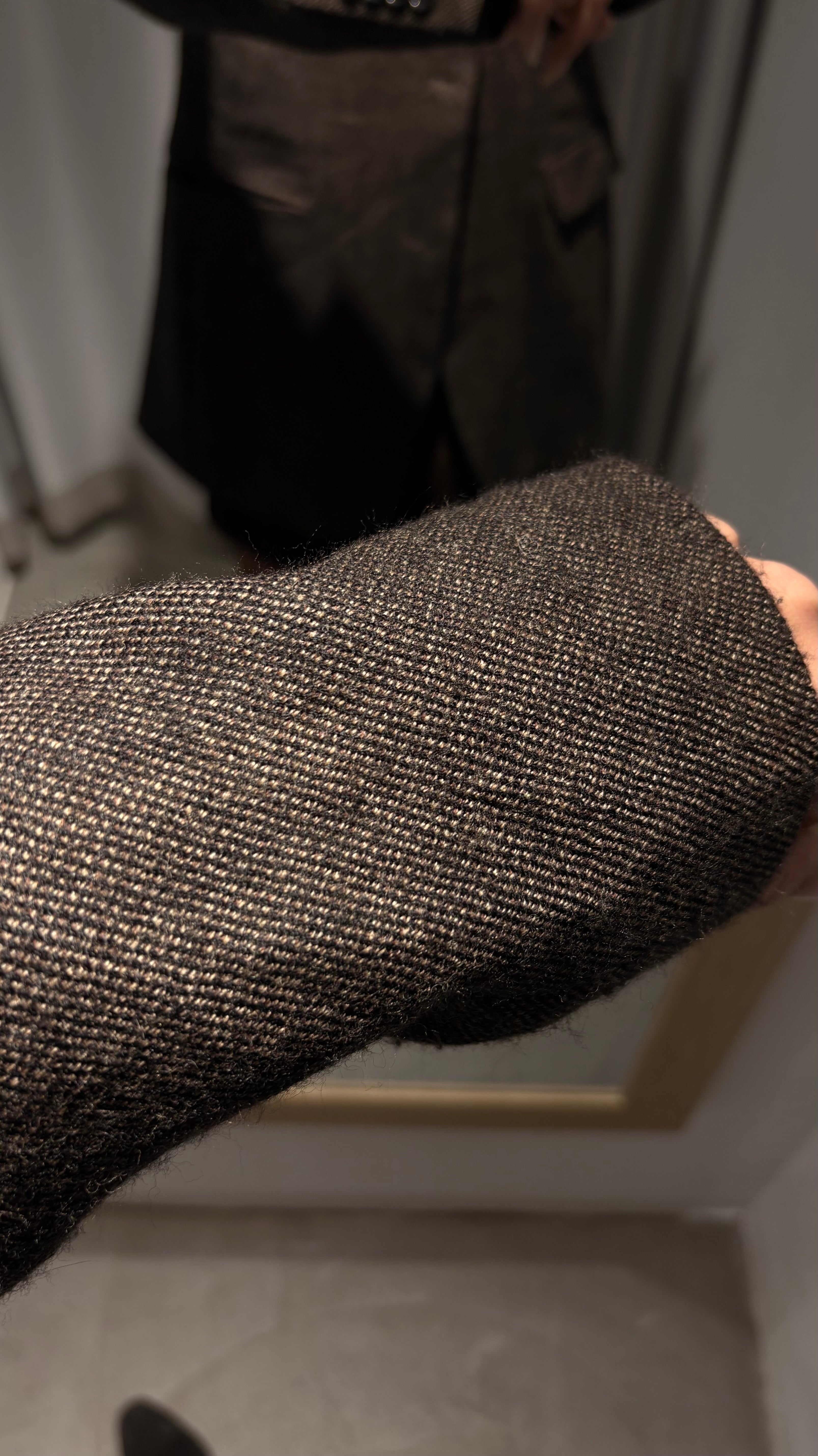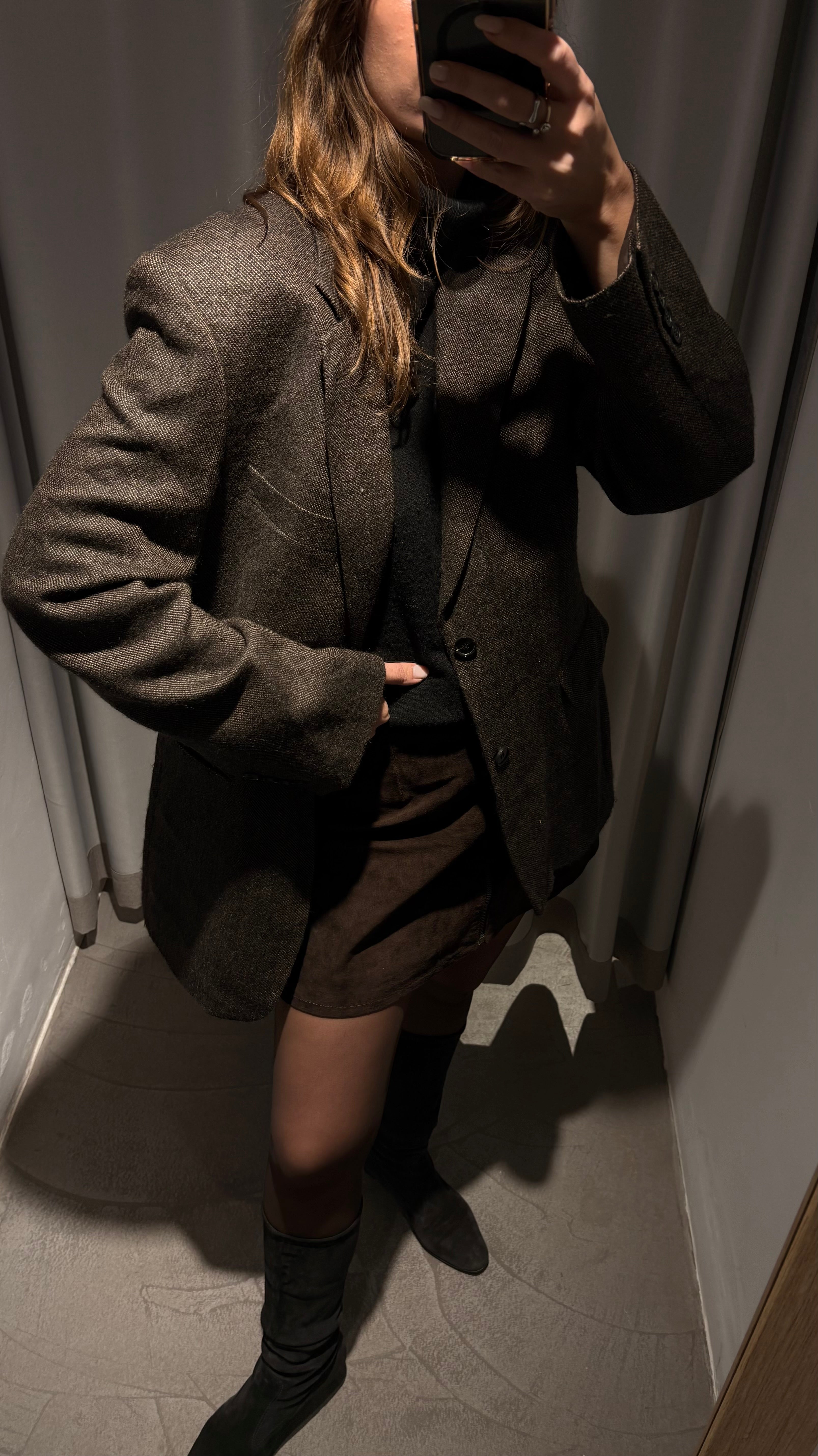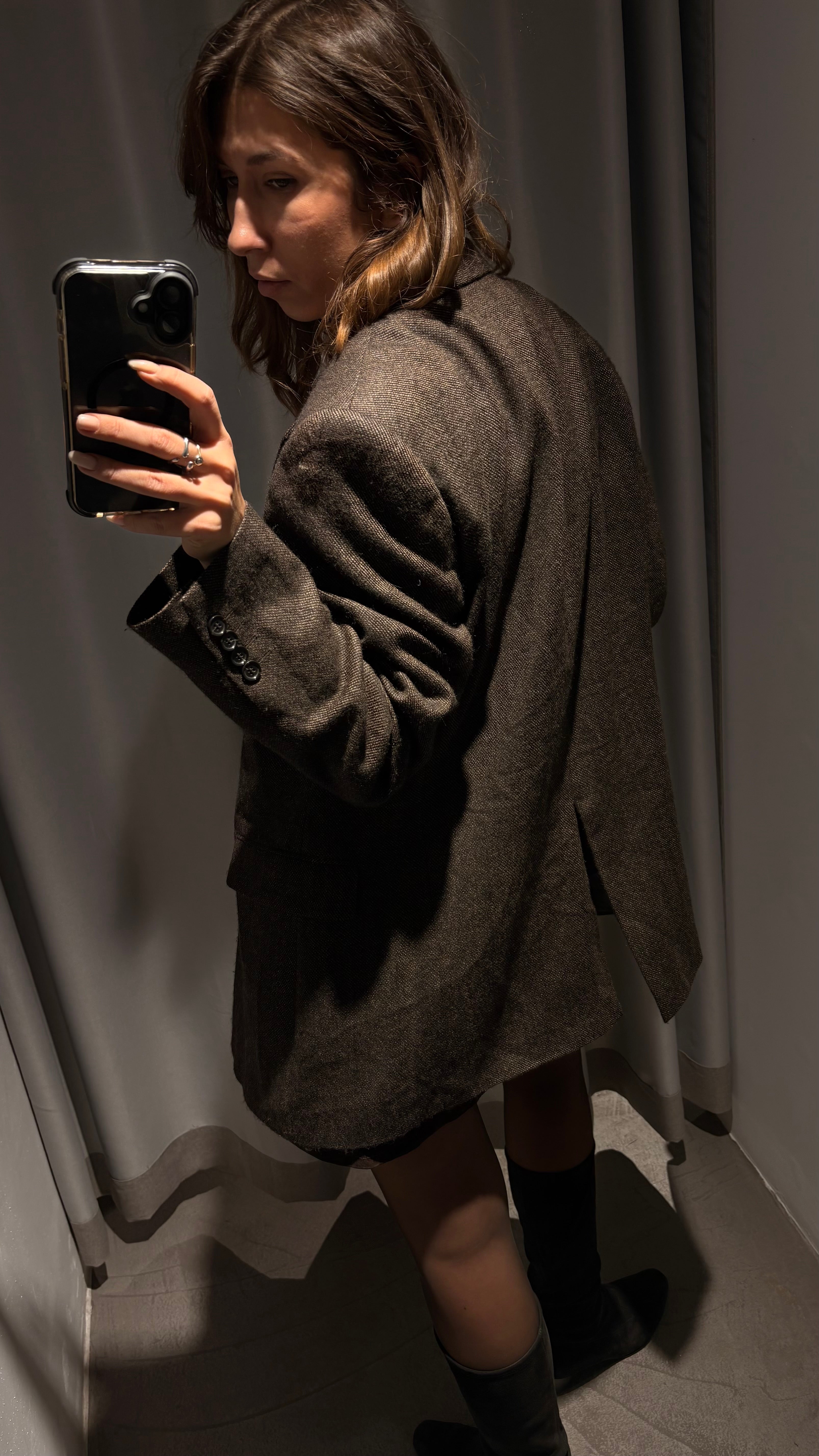 Slightly oversized and long cut, with a masculine structure yet perfect to wear in a feminine way (as shown in the photos). It’s not stiff: the wool is soft, high-quality, and drapes beautifully.