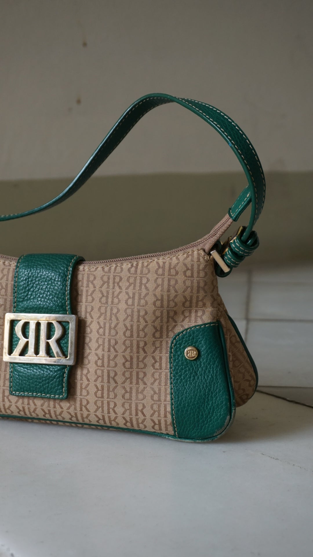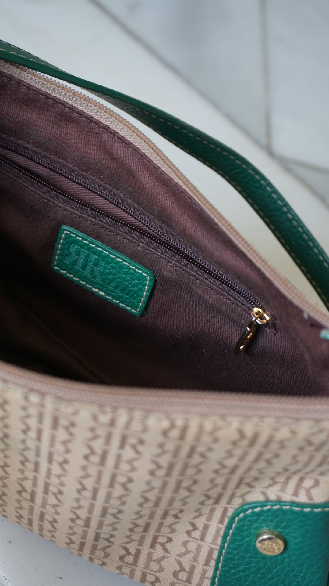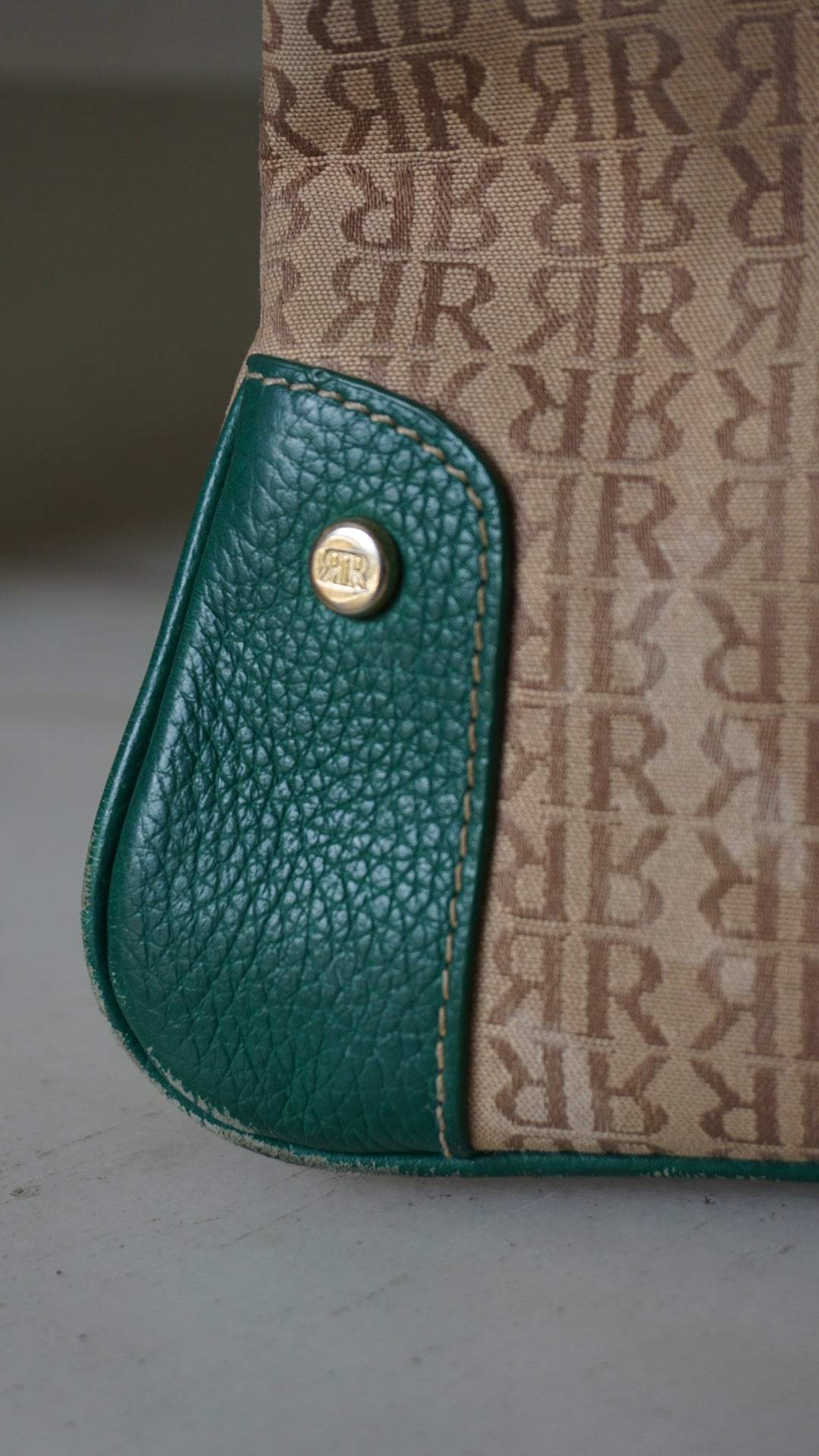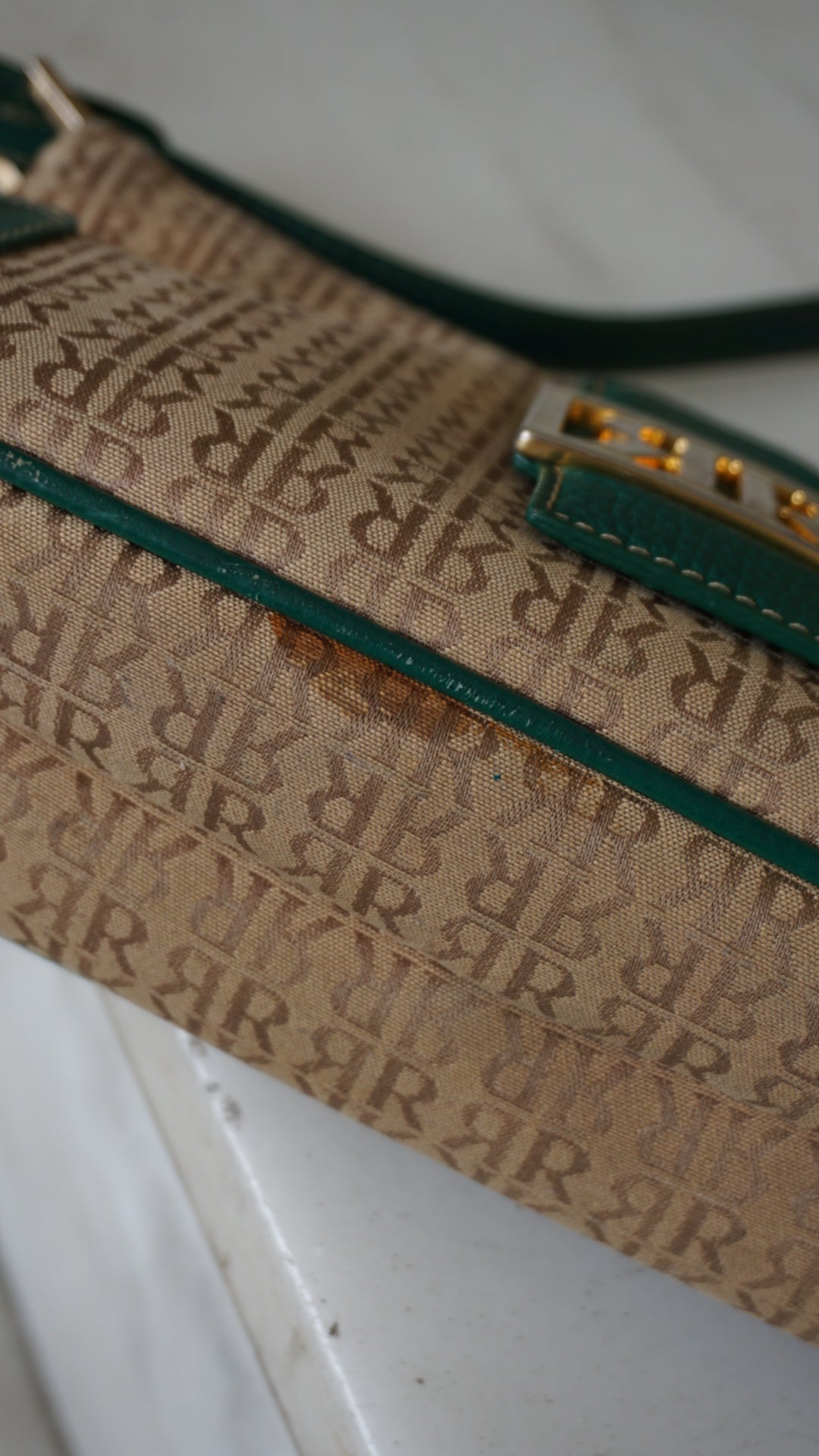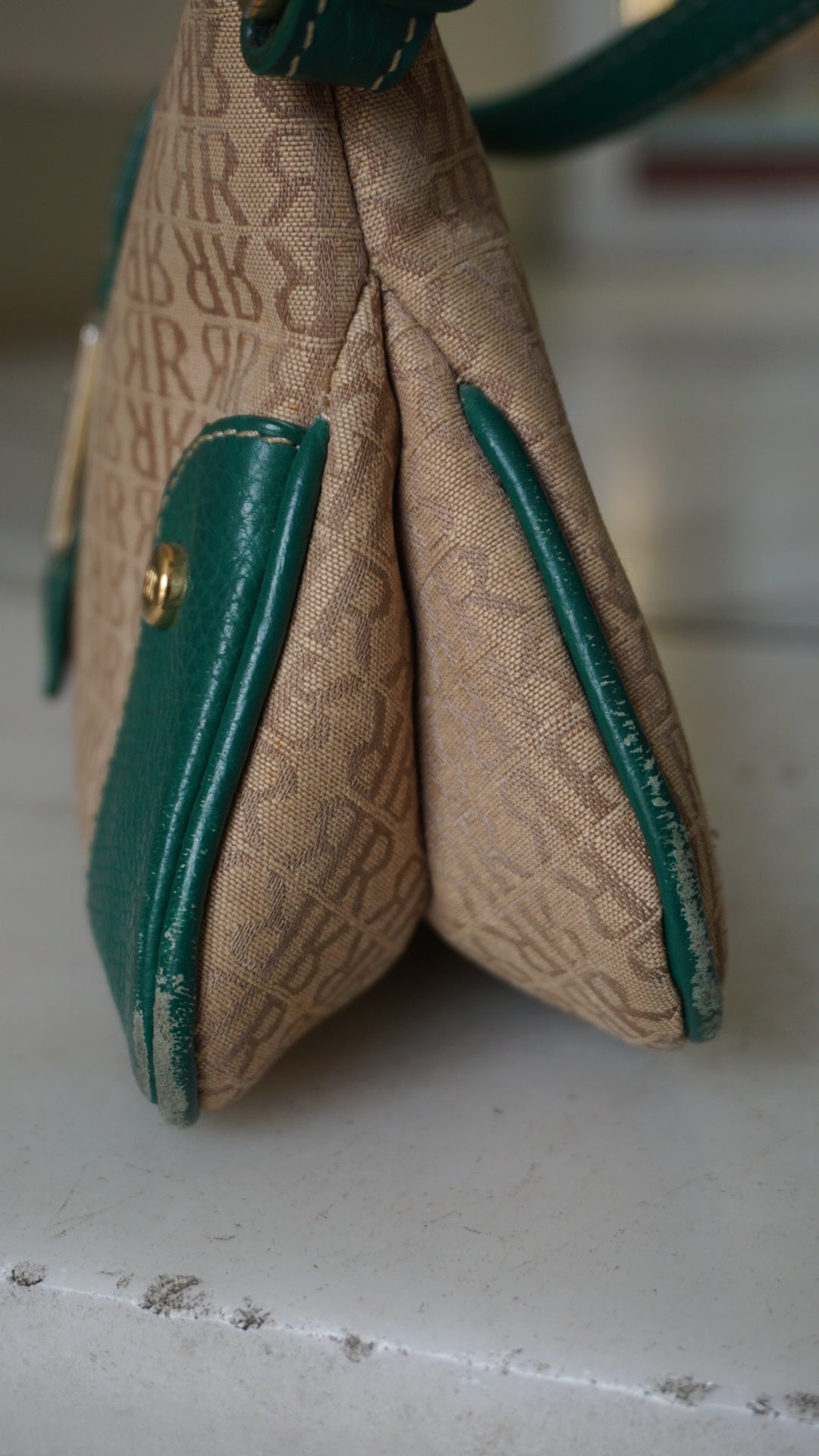 Vintage baguette-style canvas bag with a beige logo, combined with green natural leather.