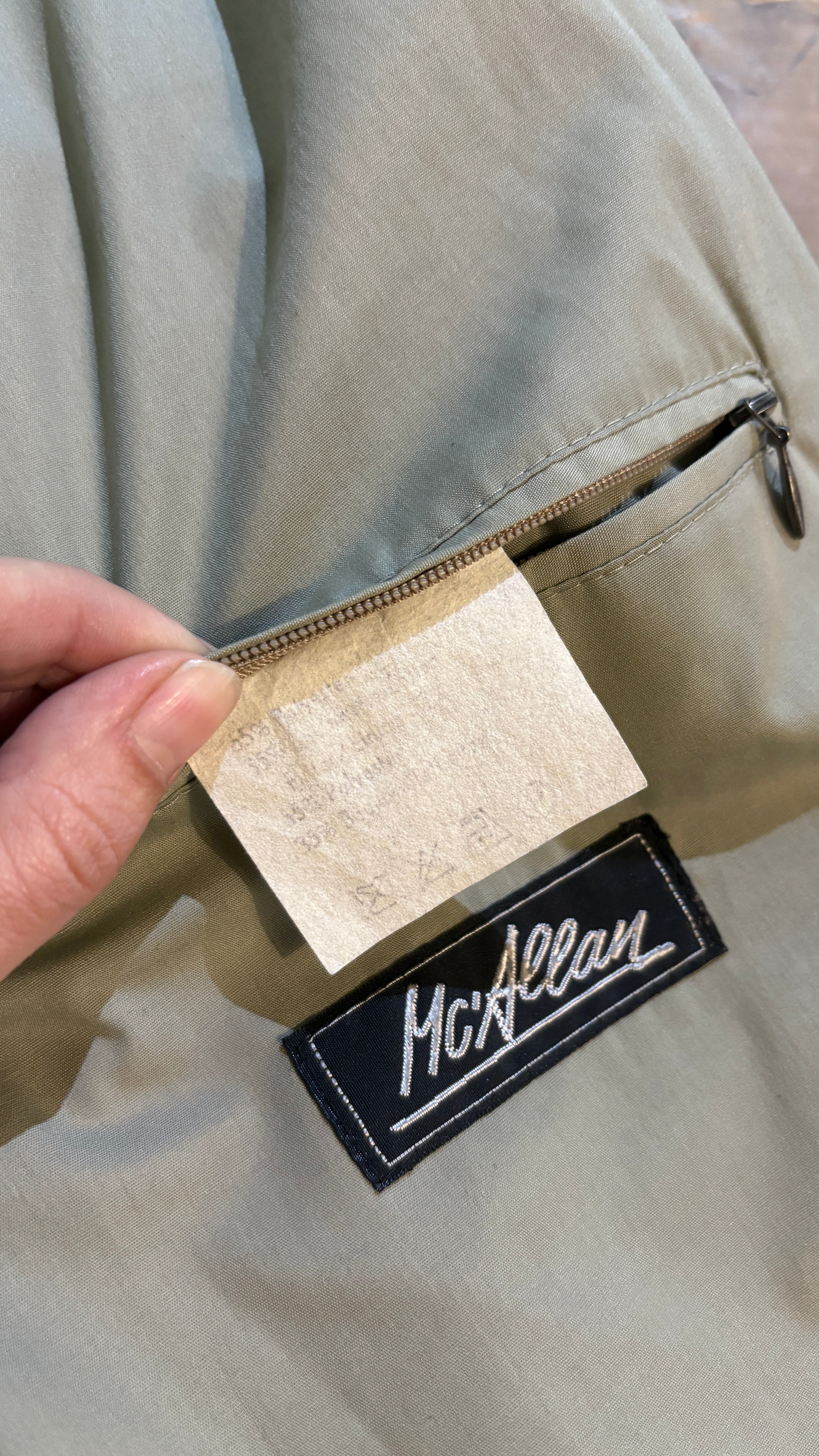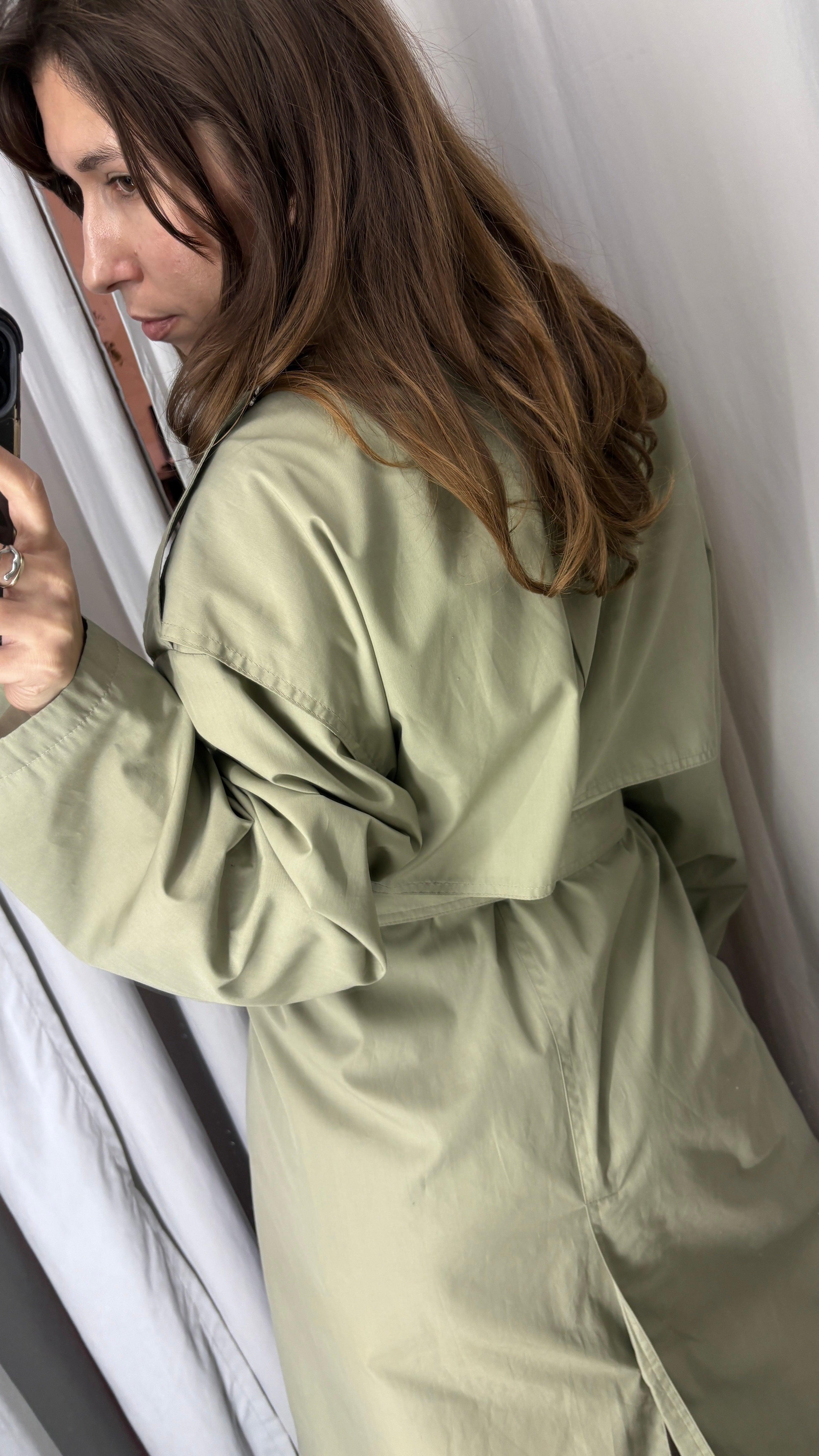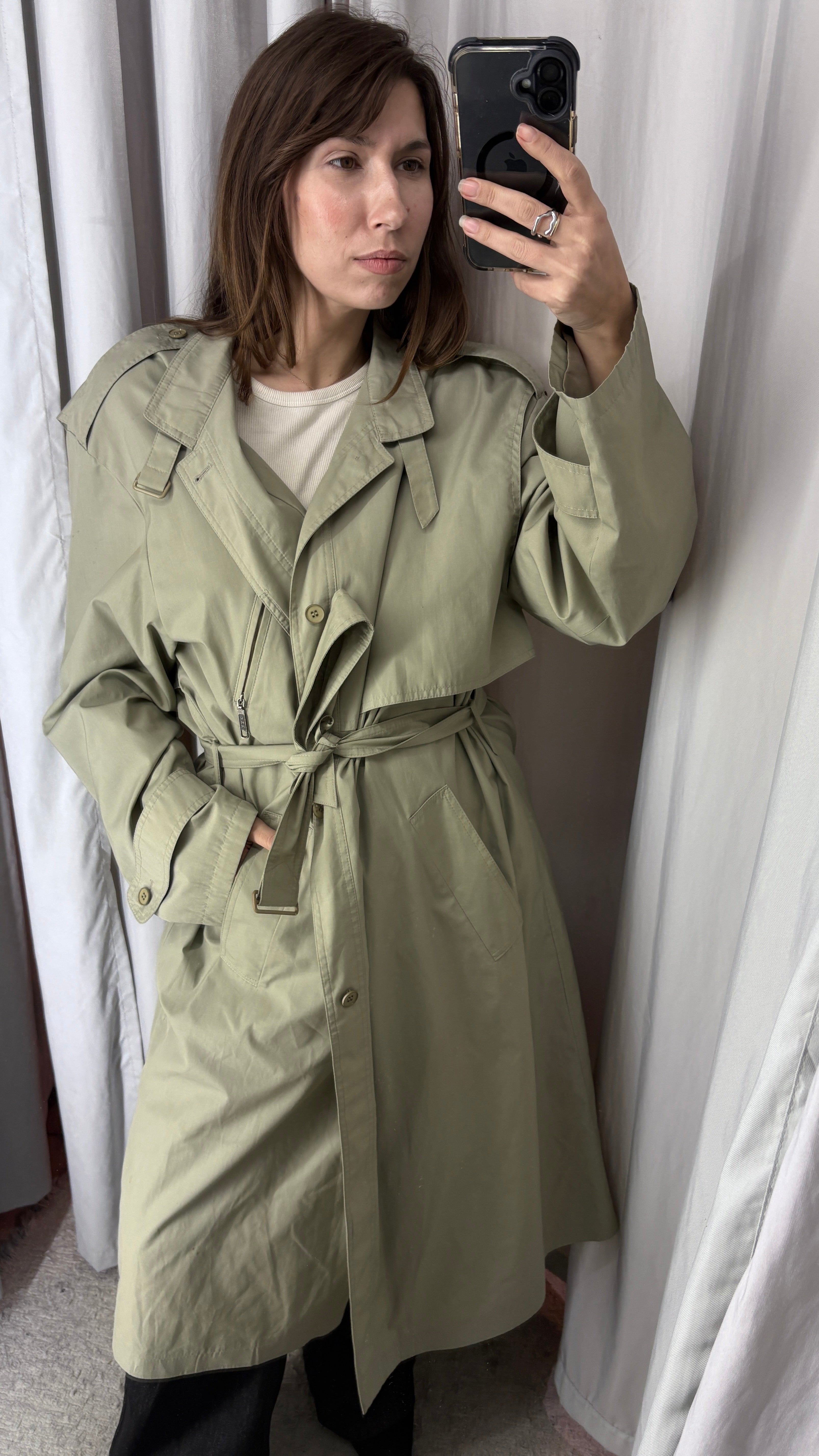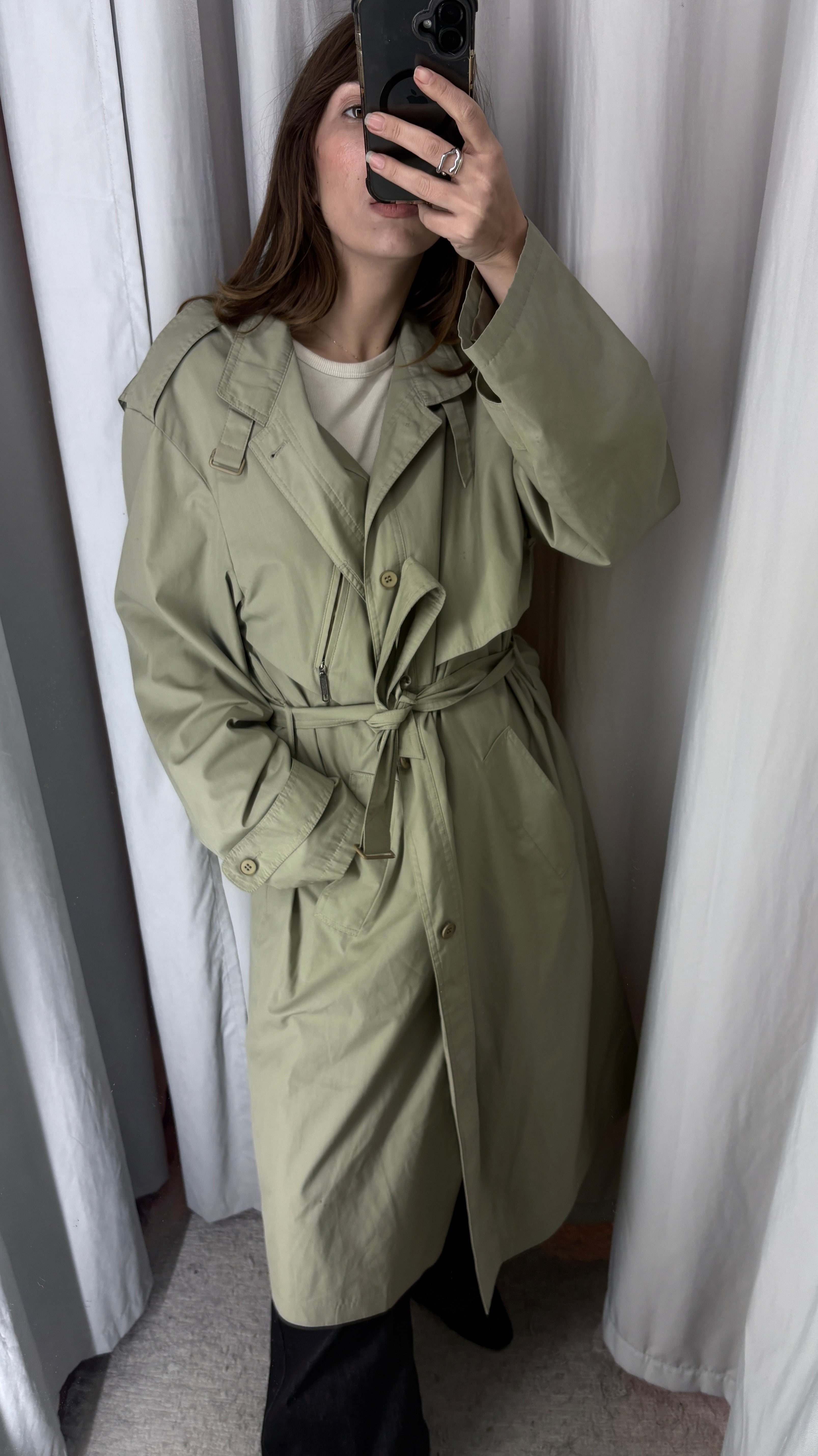 Vintage trench coat in a classic beige color that fades to light green, with a belt to adjust the waist. It has a zippered chest pocket. It's in perfect condition. It has a slightly oversized fit, ideal for sizes S-M.