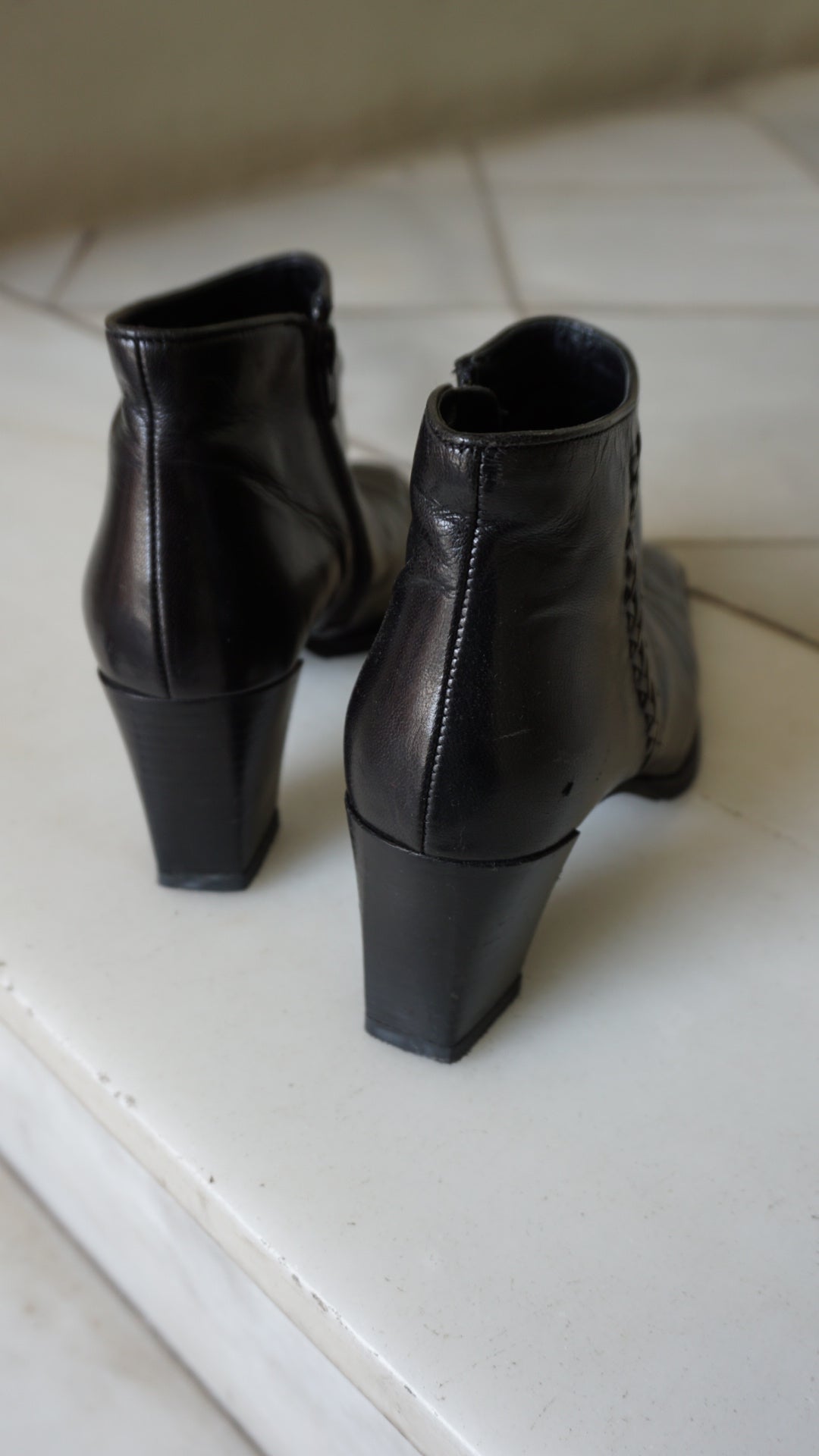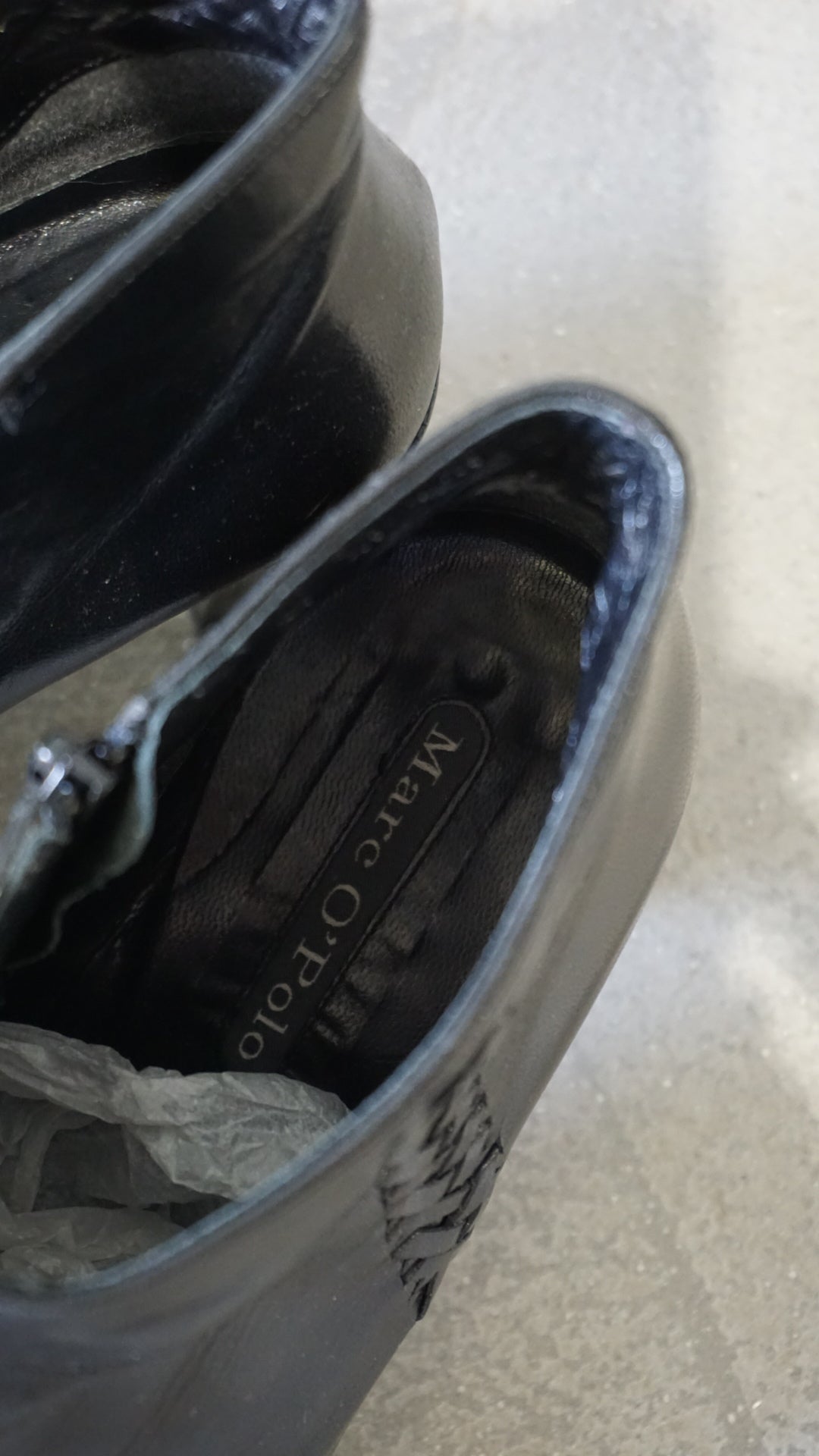 These Marco Polo ankle boots are made of genuine leather, inside and out. They feature an elegant and feminine design with a slightly elongated square toe that flatters the silhouette and adds a minimalist, 90s touch. They are in perfect condition apart from some minor surface marks on one side. Size: 39 EU