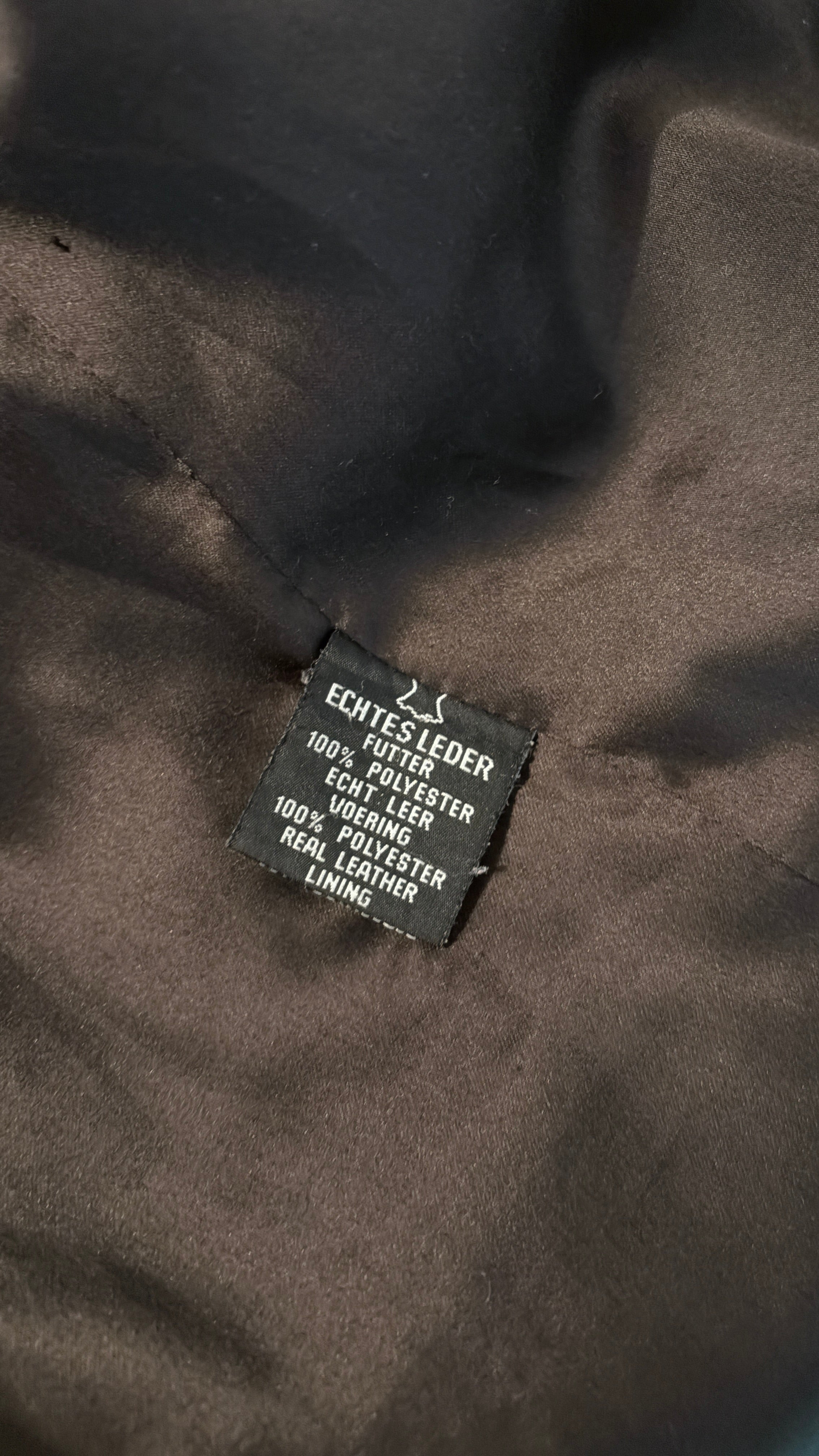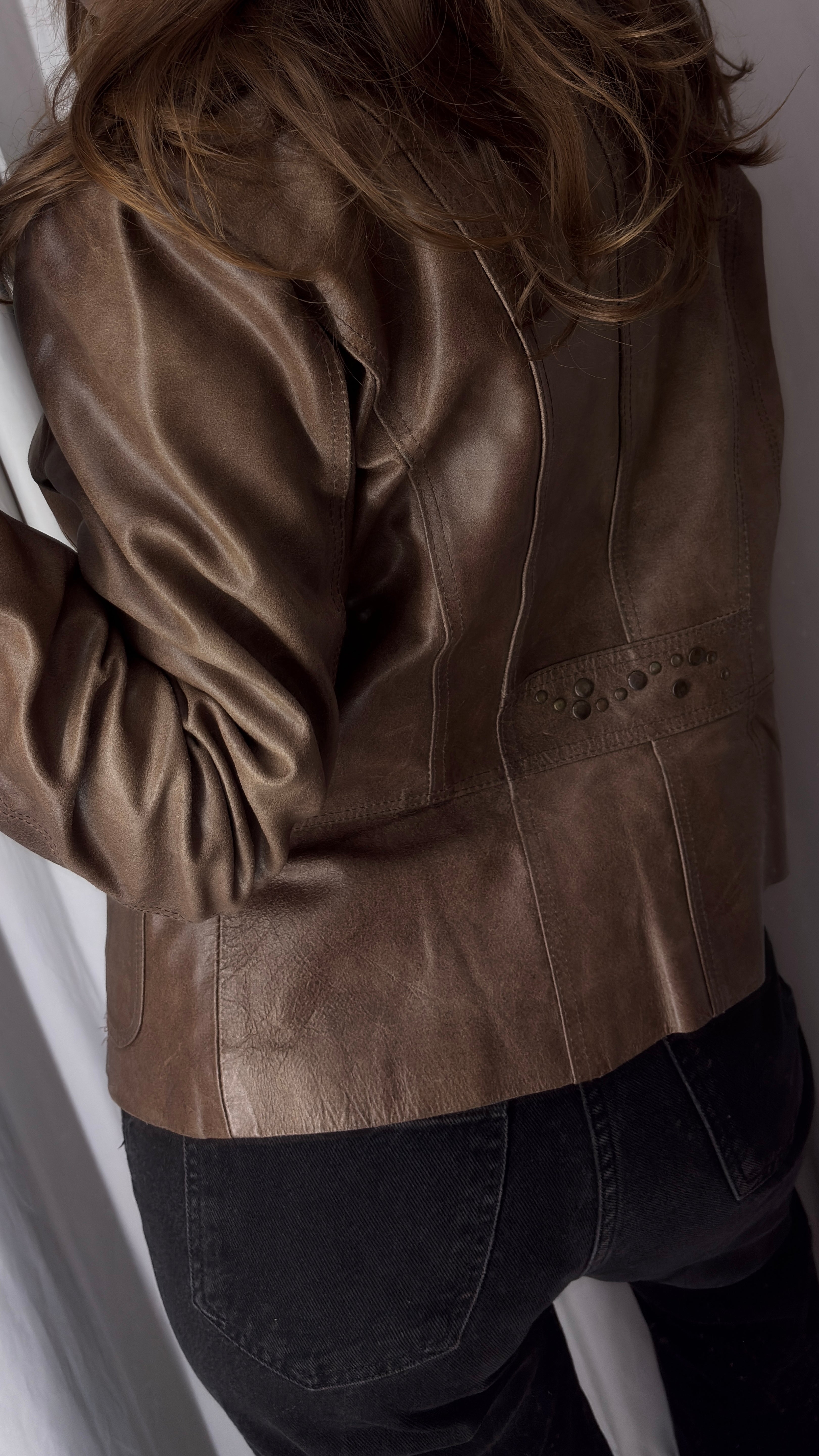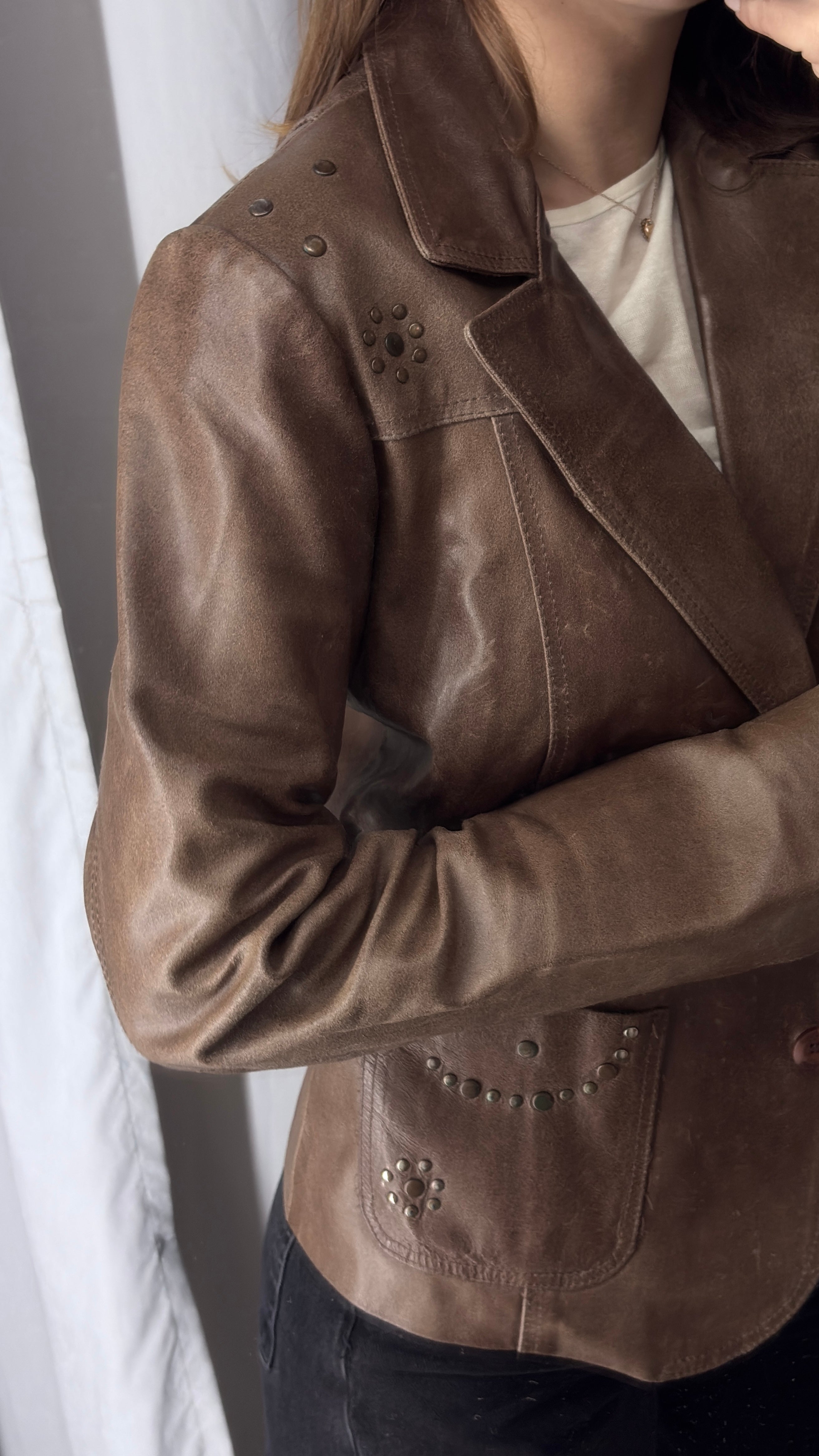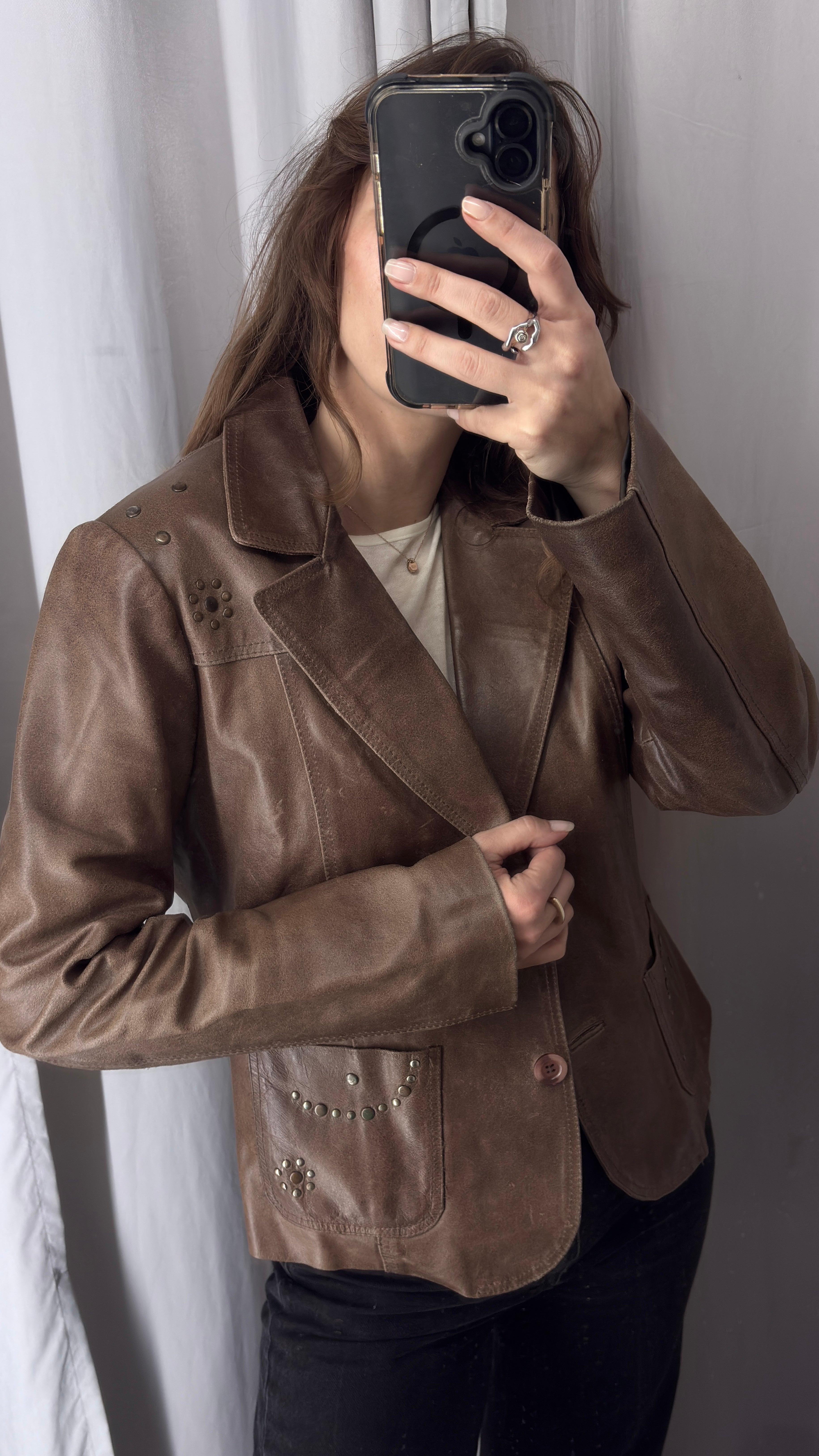 Vintage leather blazer in a beautiful light beige-brown shade, very elegant and easy to style. It has a classic, slightly tailored cut and decorative studs on the shoulders and pockets.