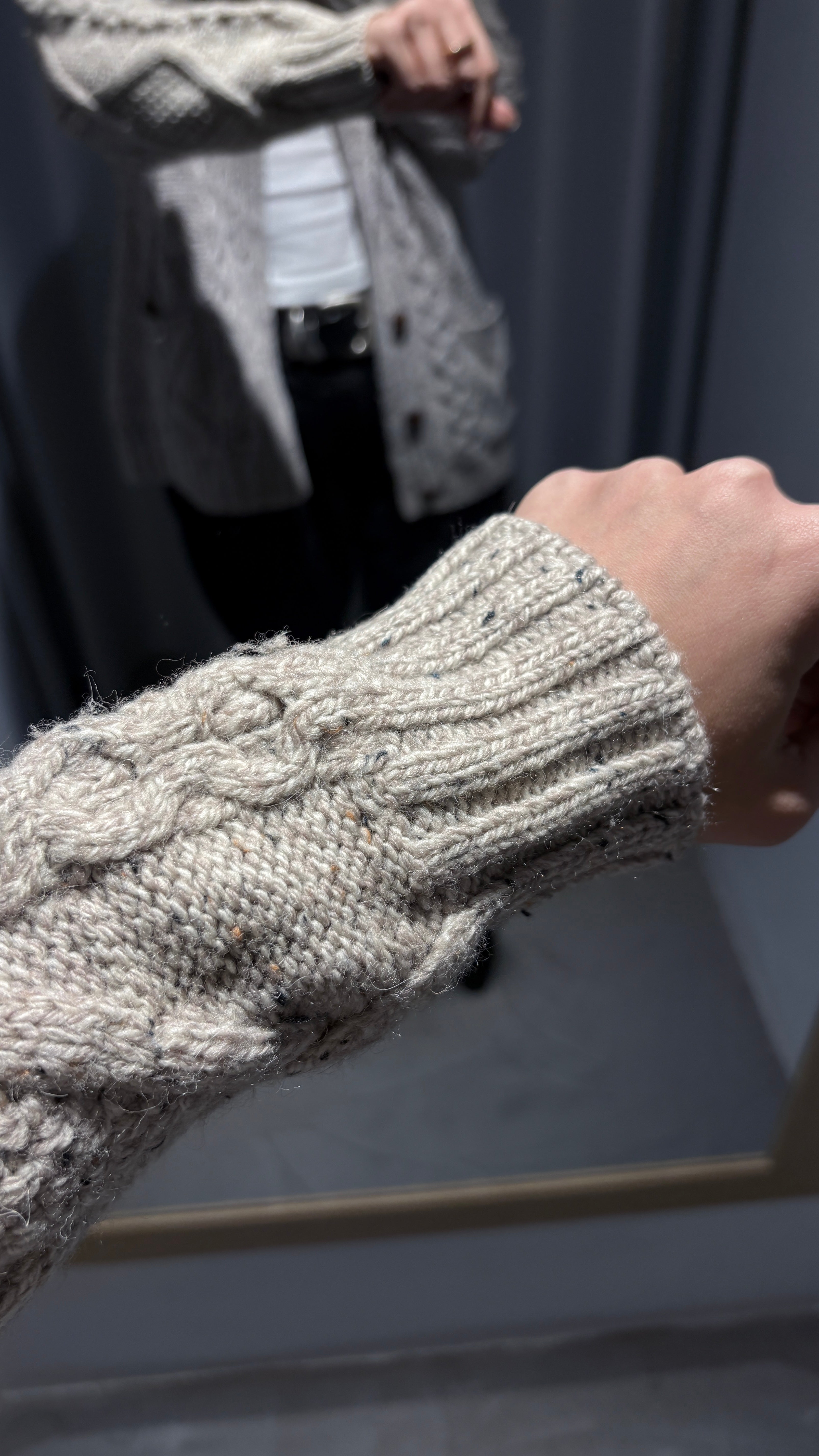 Vintage beige Merino wool cardigan with a beautiful cable knit, a warm and timeless piece. Its classic, handcrafted design adds texture and character to any outfit.