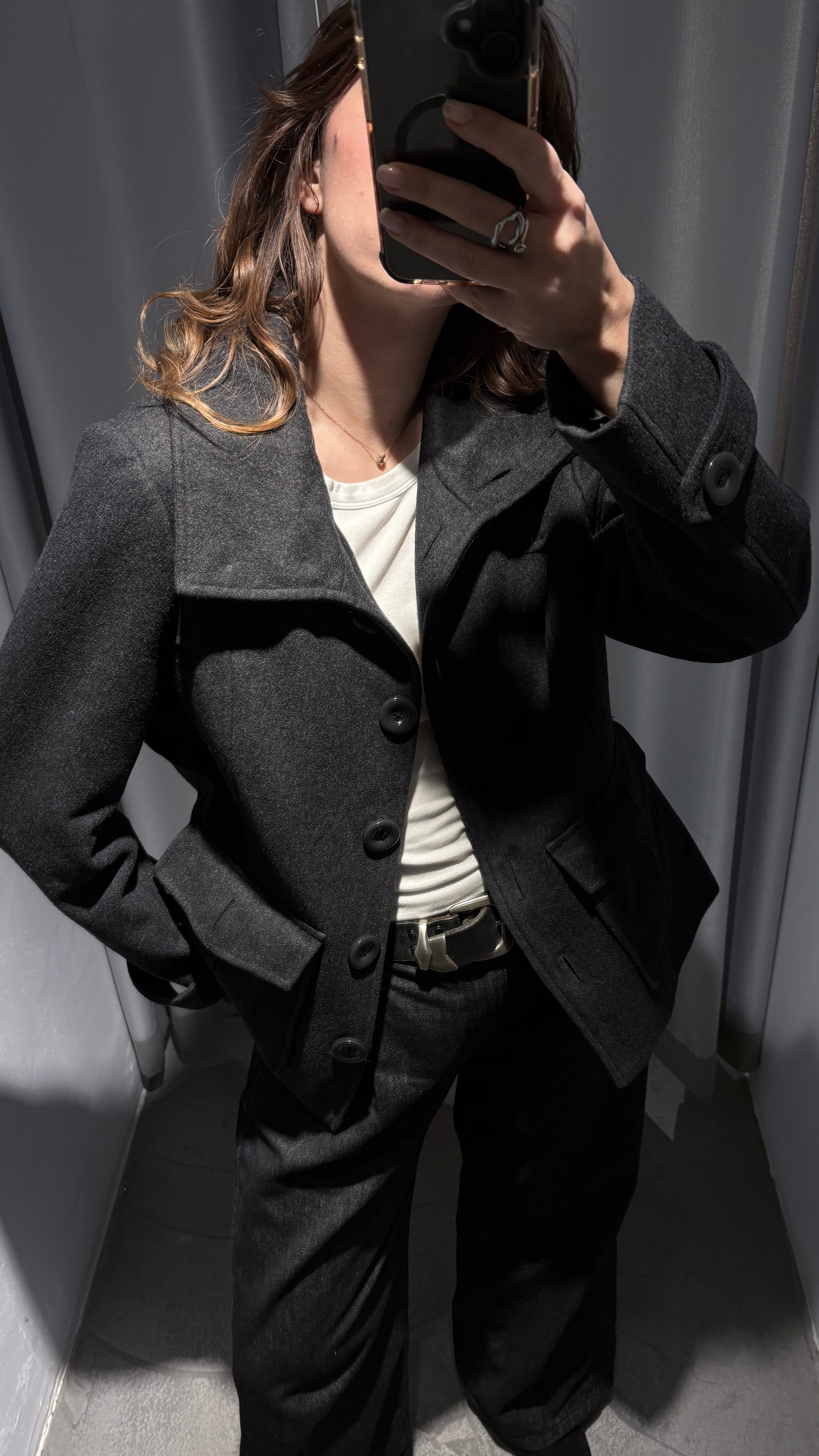 Dark gray wool jacket, smart casual style. Like a short coat. The wool fabric is warm, soft, and durable; it hardly pills. Size S-M.