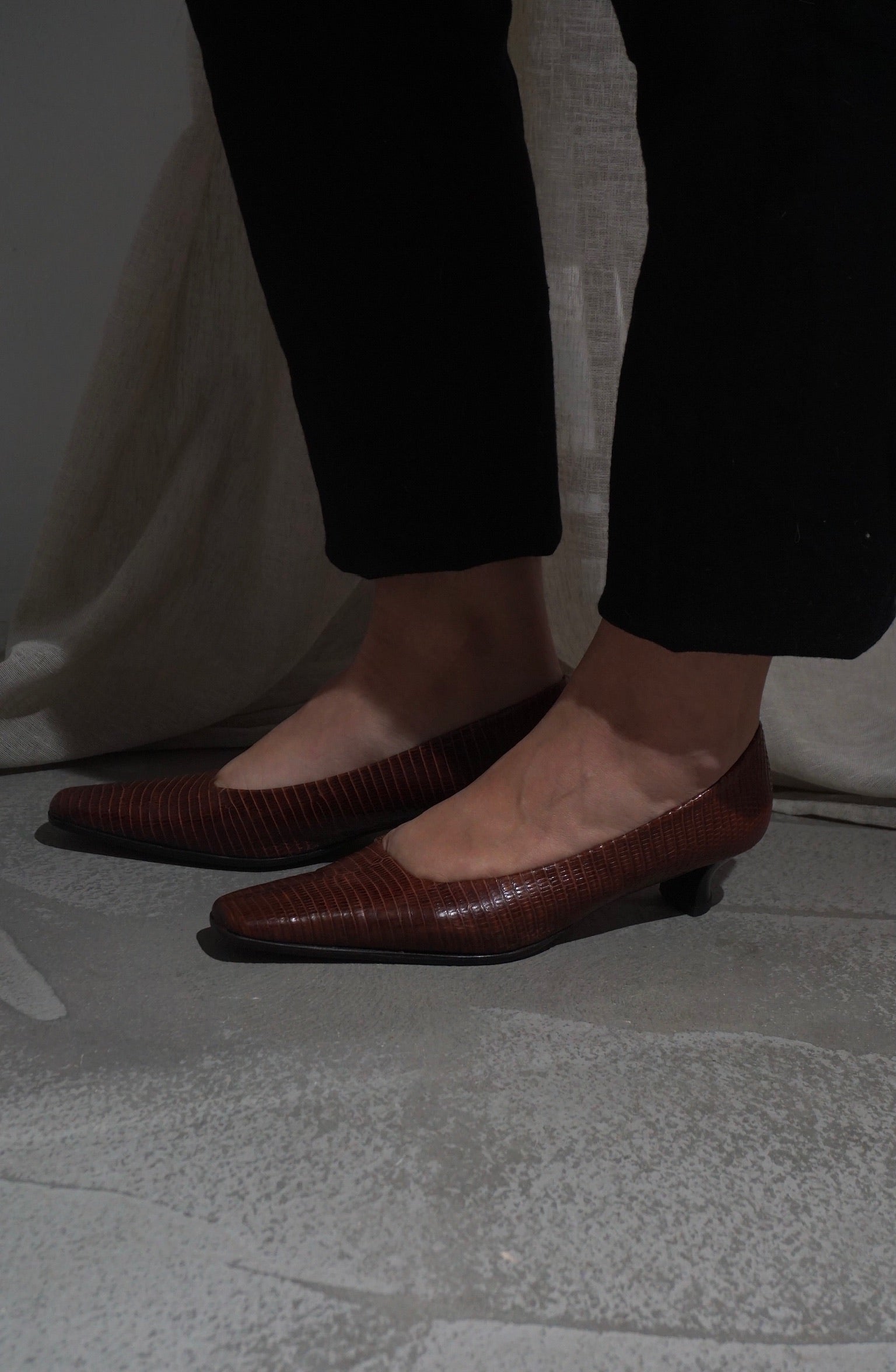 Elegant with a twist. These vintage brown leather kitten heels feature a slim silhouette with a softly squared, elongated toe — refined yet easy to wear. The textured, reptile-inspired leather adds depth and character, while the low heel keeps them chic and comfortable.