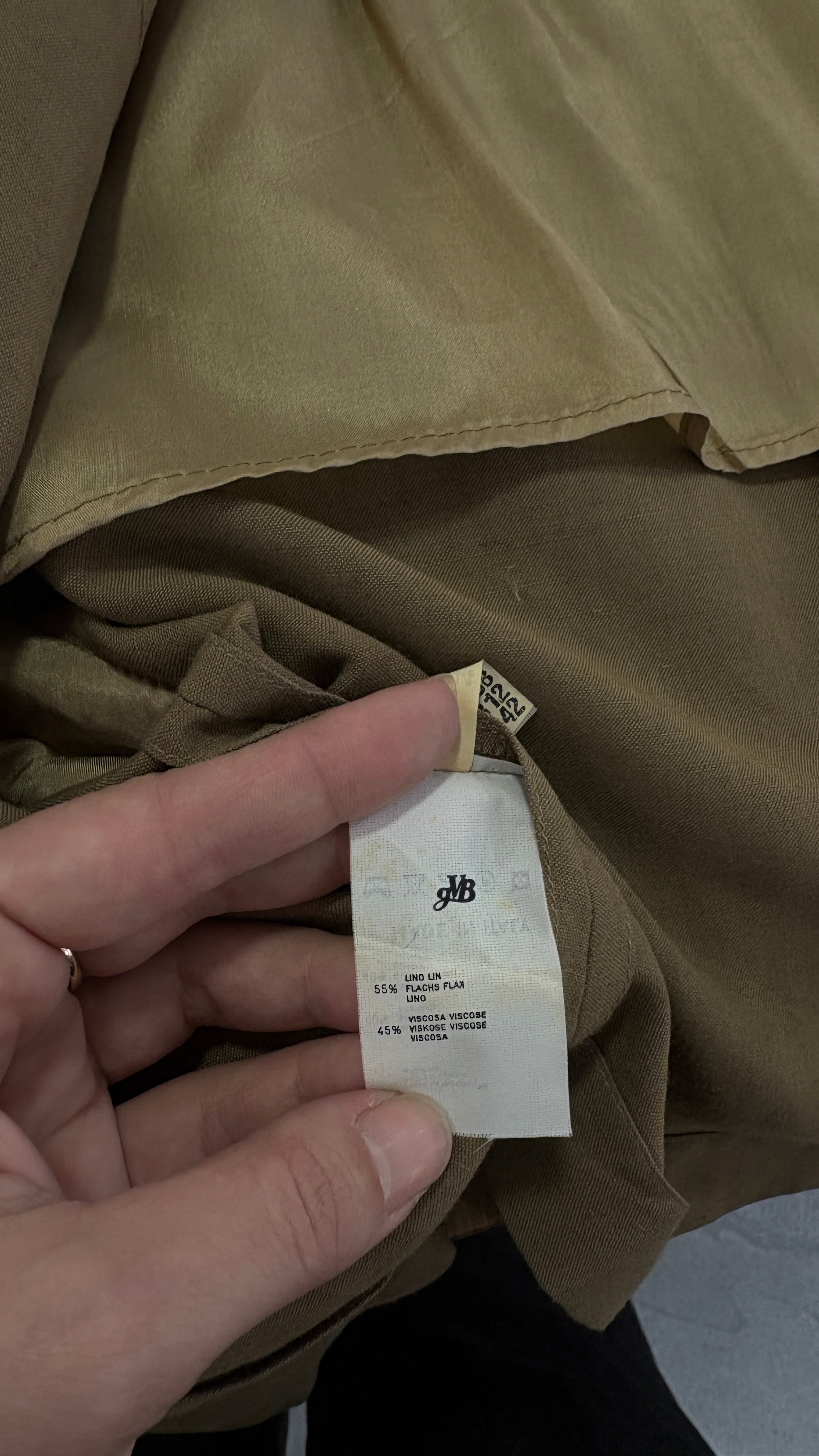 Vintage cropped blazer made from linen in a very elegant mustard/earth tone. The fabric is lightweight, breathable, and has the characteristic natural texture of linen, making it ideal for spring or summer. It is in perfect condition.