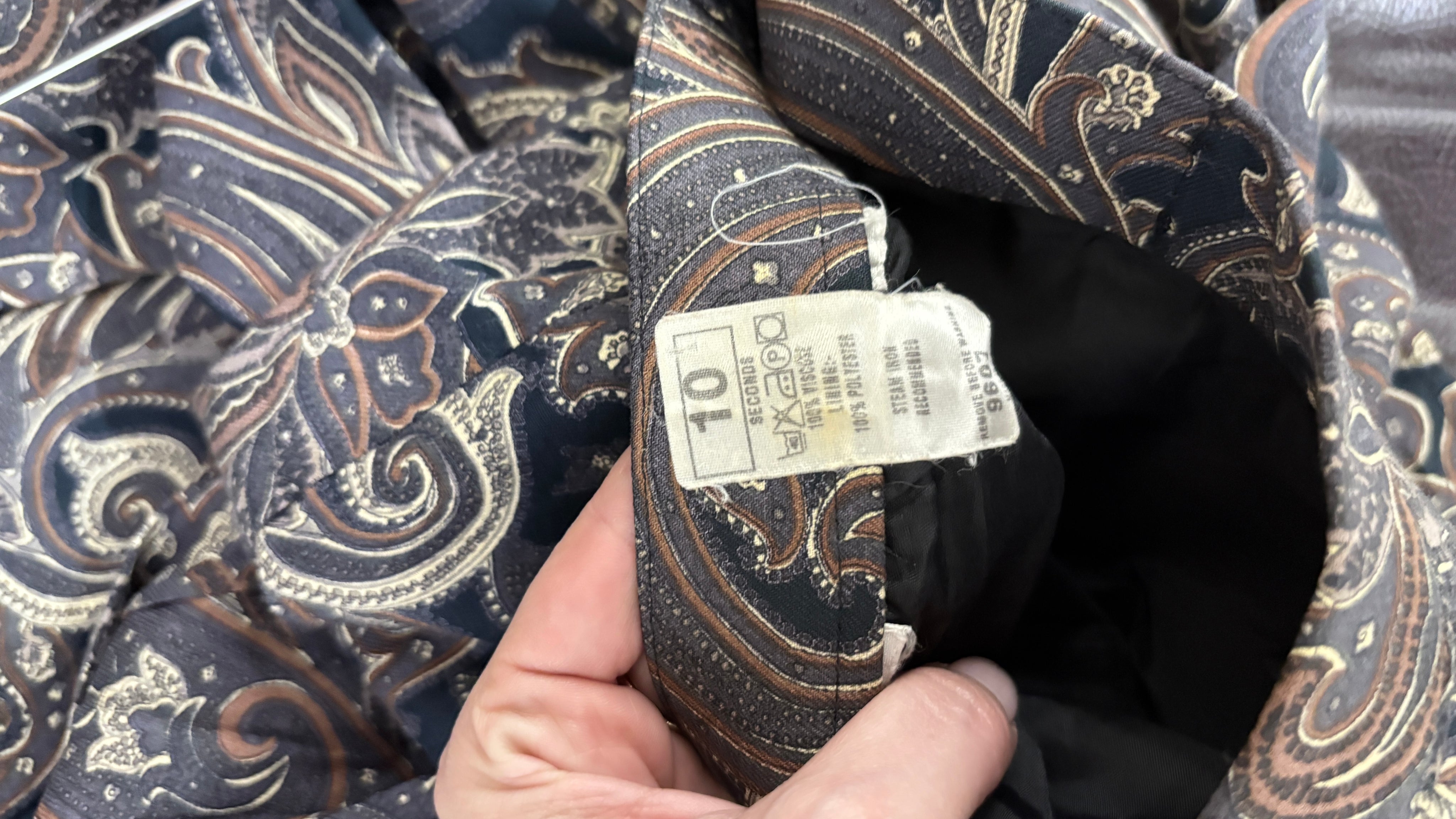 Vintage skirt with an elegant paisley print in dark tones, a piece with a classic and sophisticated feel. The detailed design and deep colors make it a very special garment, perfect for retro or bohemian-inspired looks.