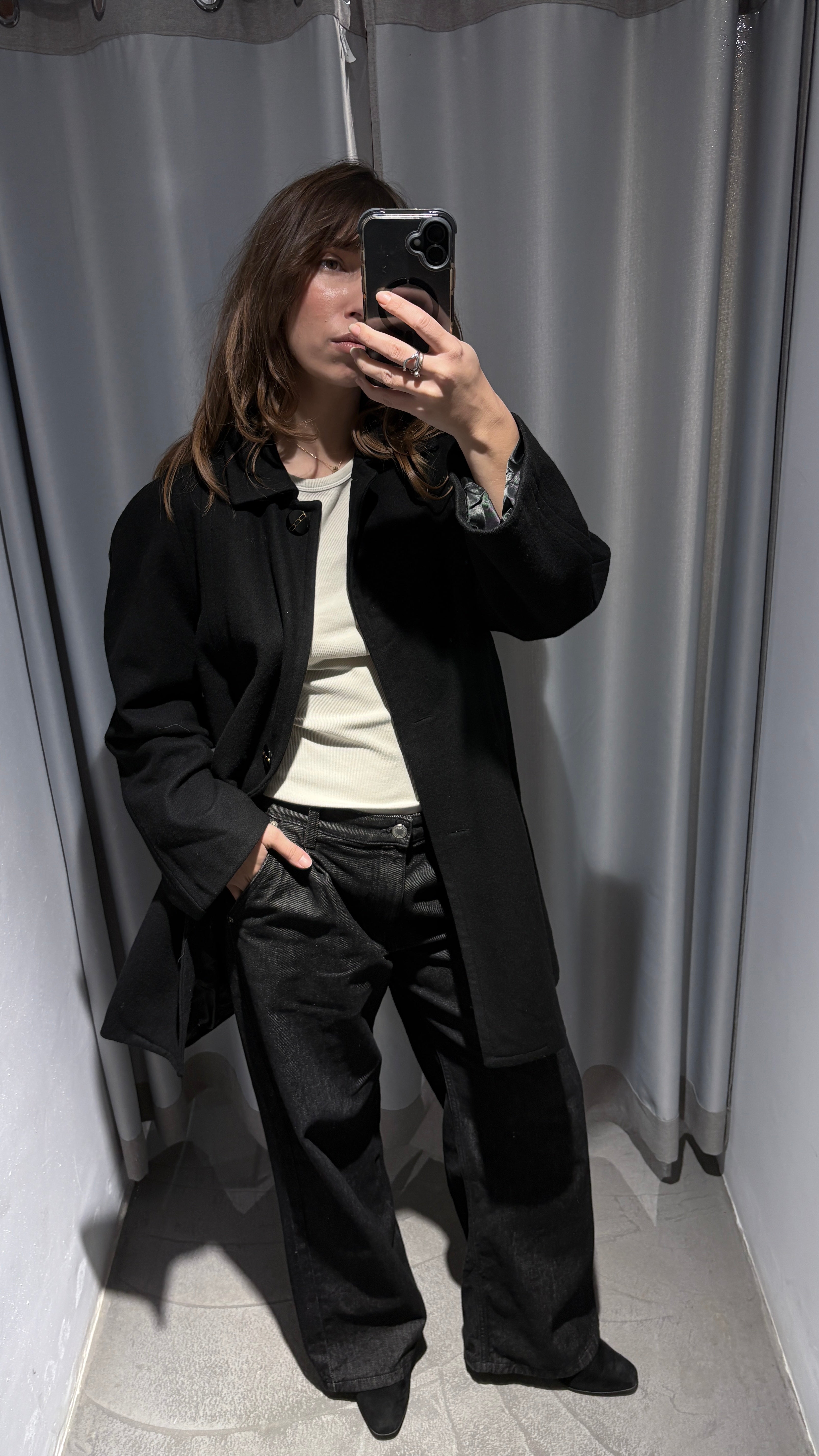 The wool fabric is very pleasant to the touch, lightweight, soft, and well-structured, resisting pilling and maintaining its shape with wear. Its classic and timeless mid-length design is easy to pair with any style: casual, elegant, or urban. It is in perfect condition, missing only one button. This can be easily remedied by moving the bottom button or replacing the entire set of buttons.