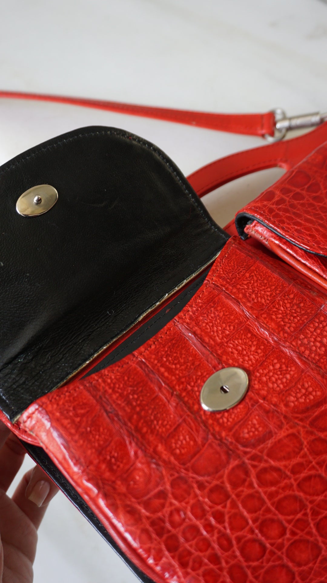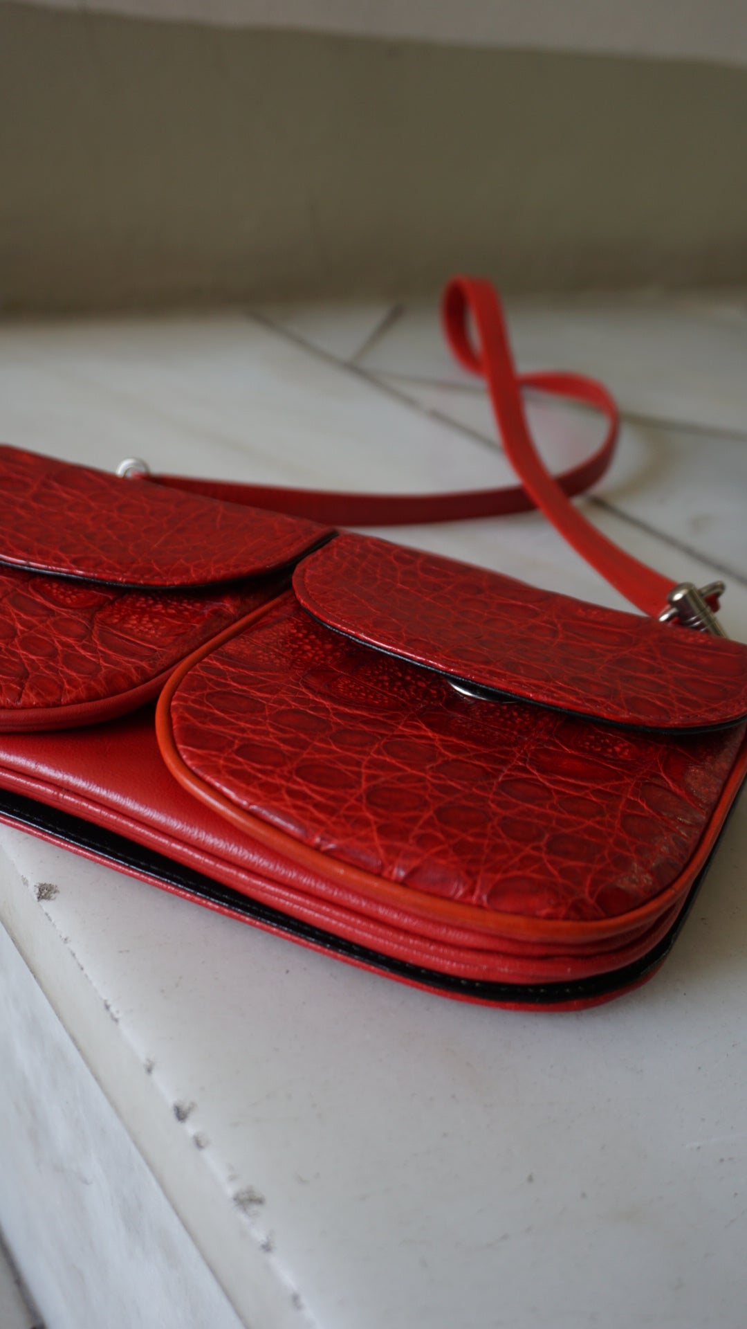 Vintage genuine leather handbag in a vibrant red. An original piece from the late 1970s, recognizable by its characteristic metal clasp, later replaced by a magnetic closure in the late 1970s/early 1980s. Genuine, high-quality leather, very well preserved. Clean interior in excellent condition. Adjustable shoulder strap and practical size for everyday use.