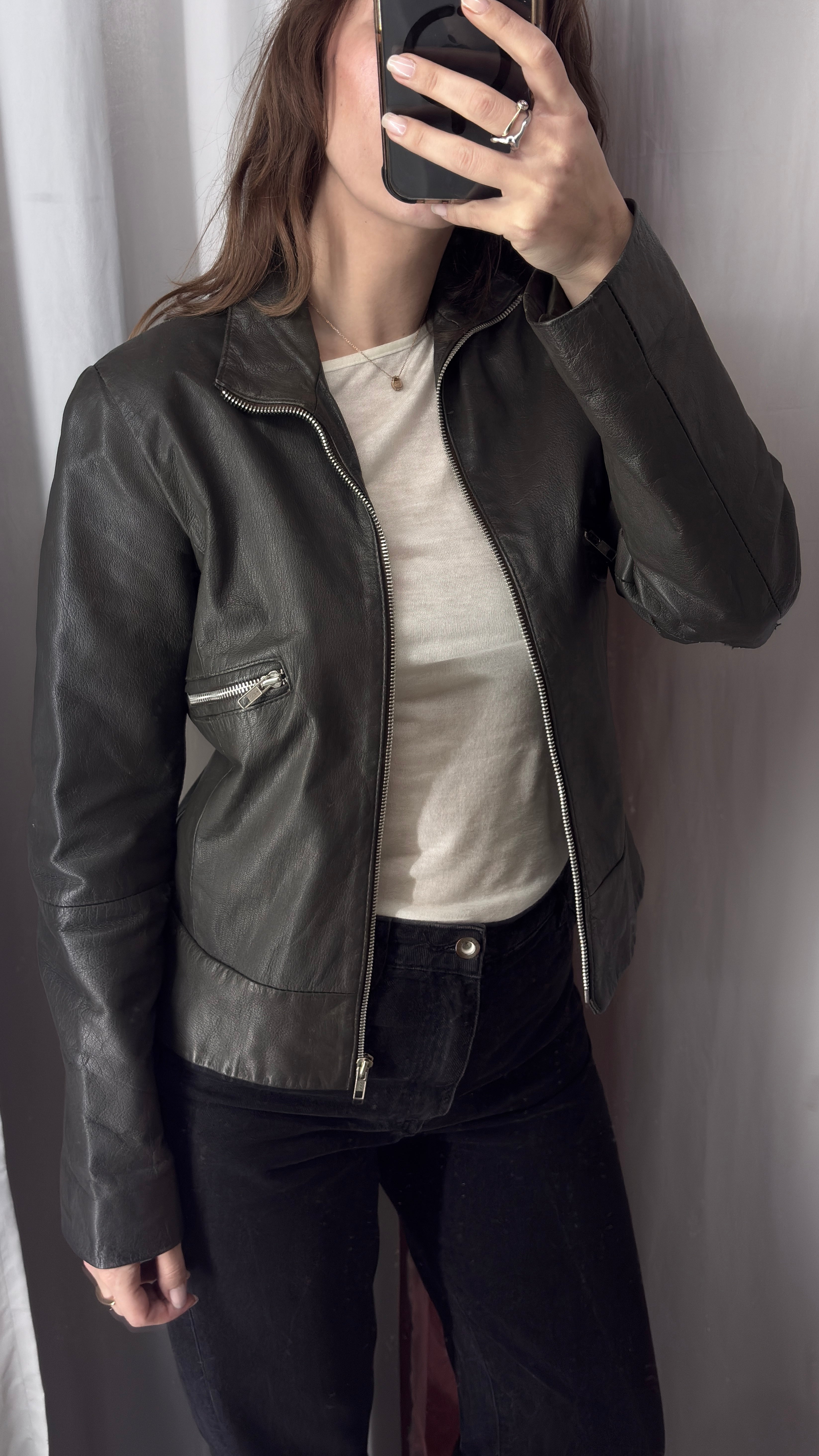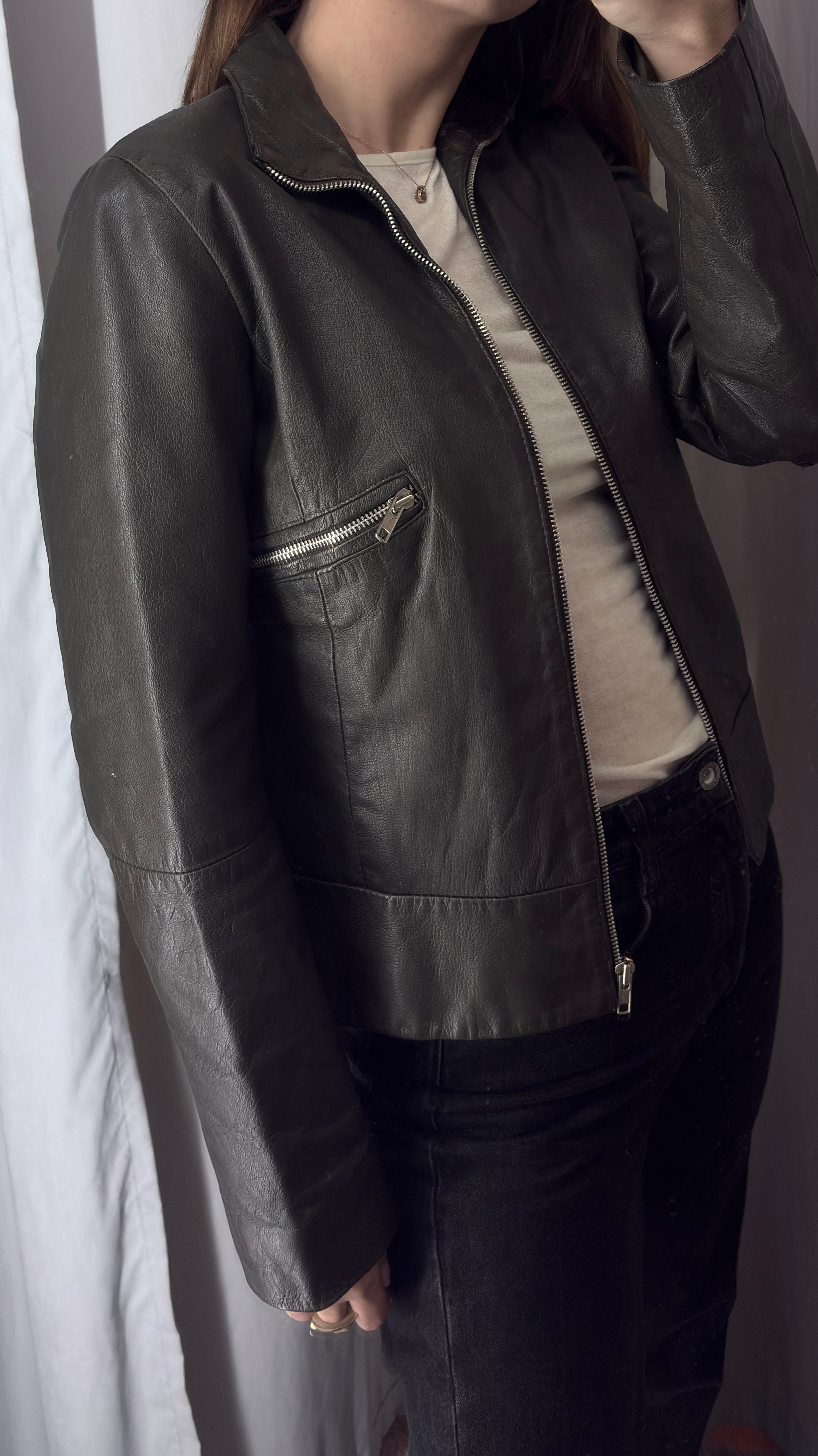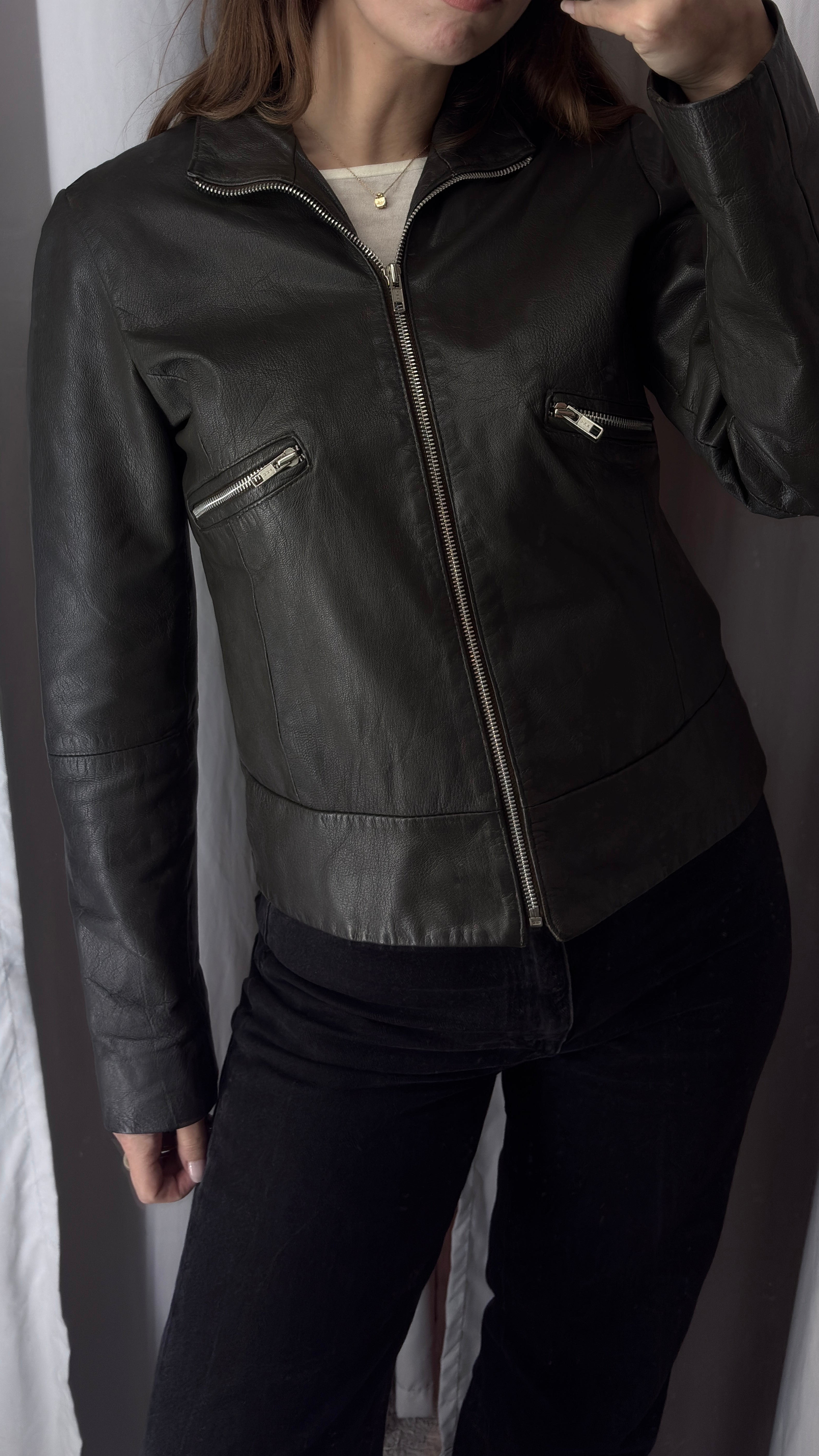 Dark gray/khaki patent leather jacket with a minimalist design and zippers. It has a fitted yet comfortable cut.