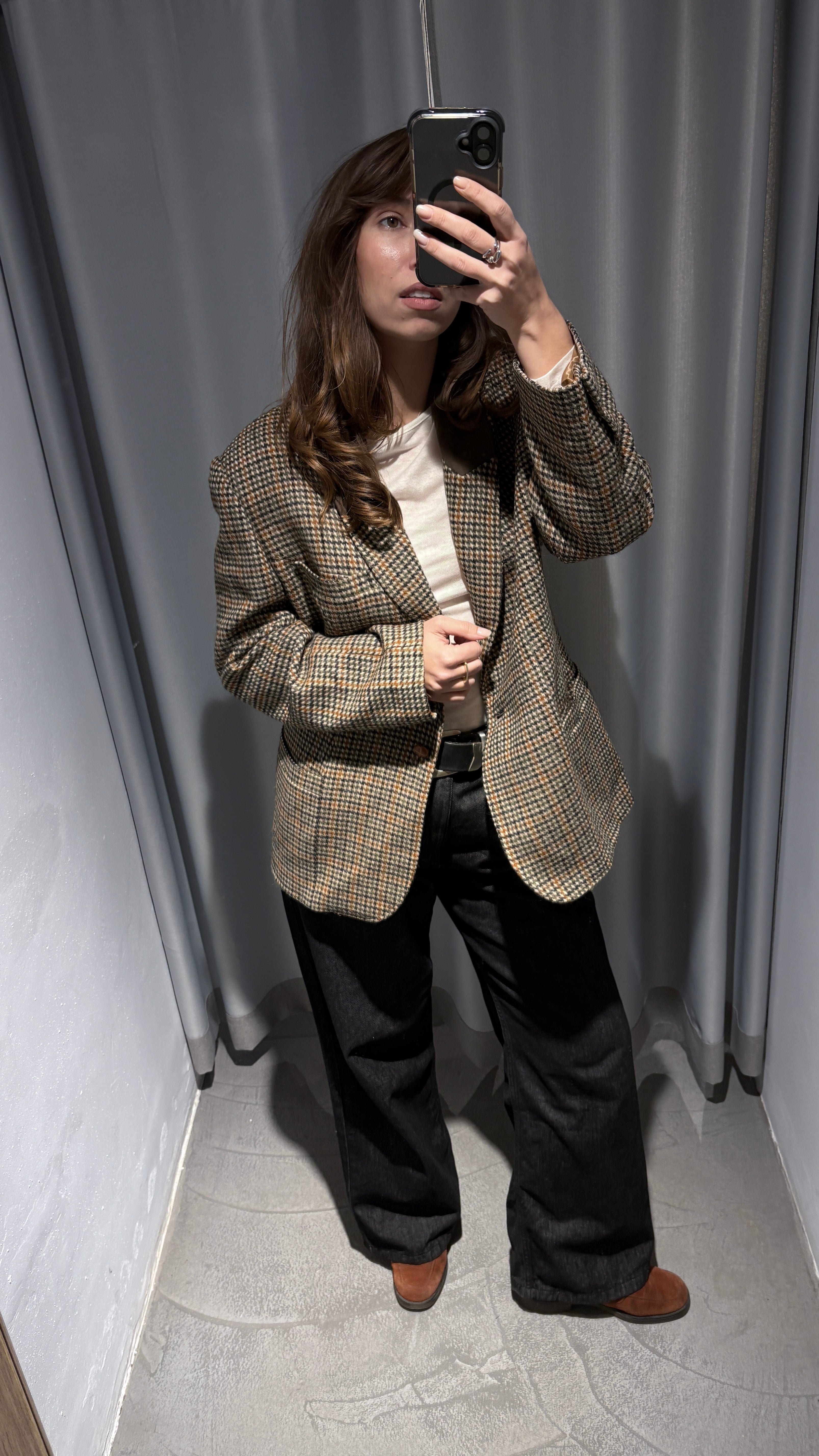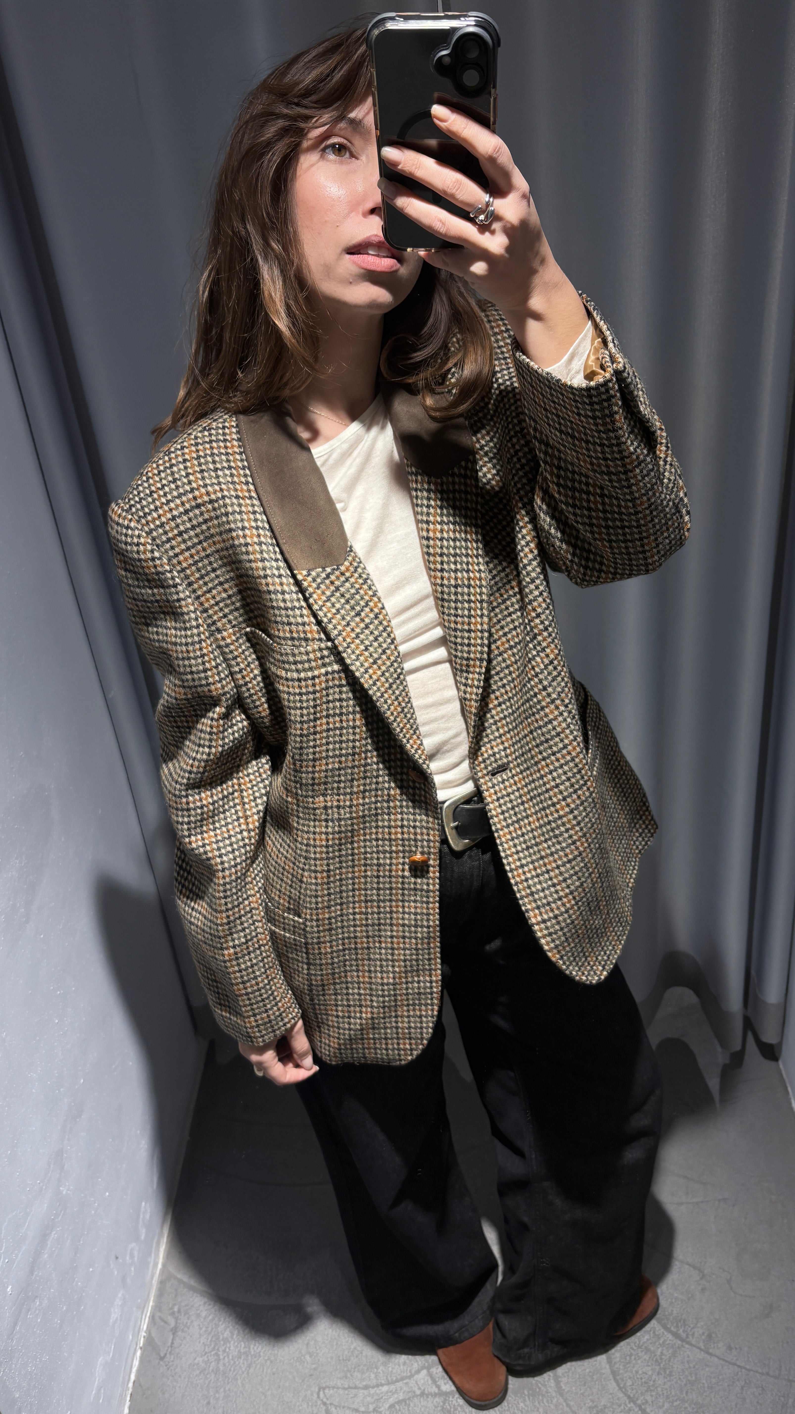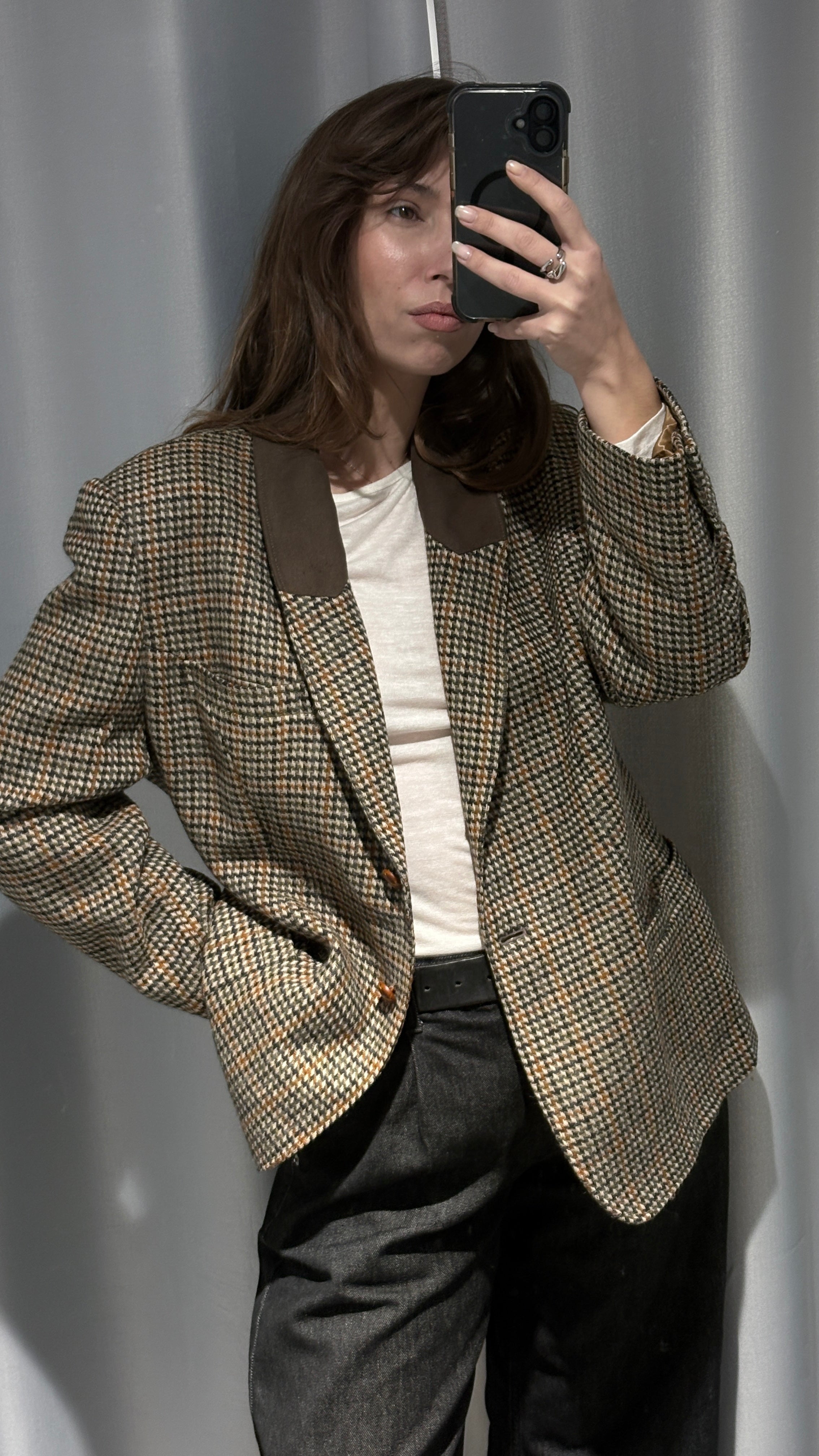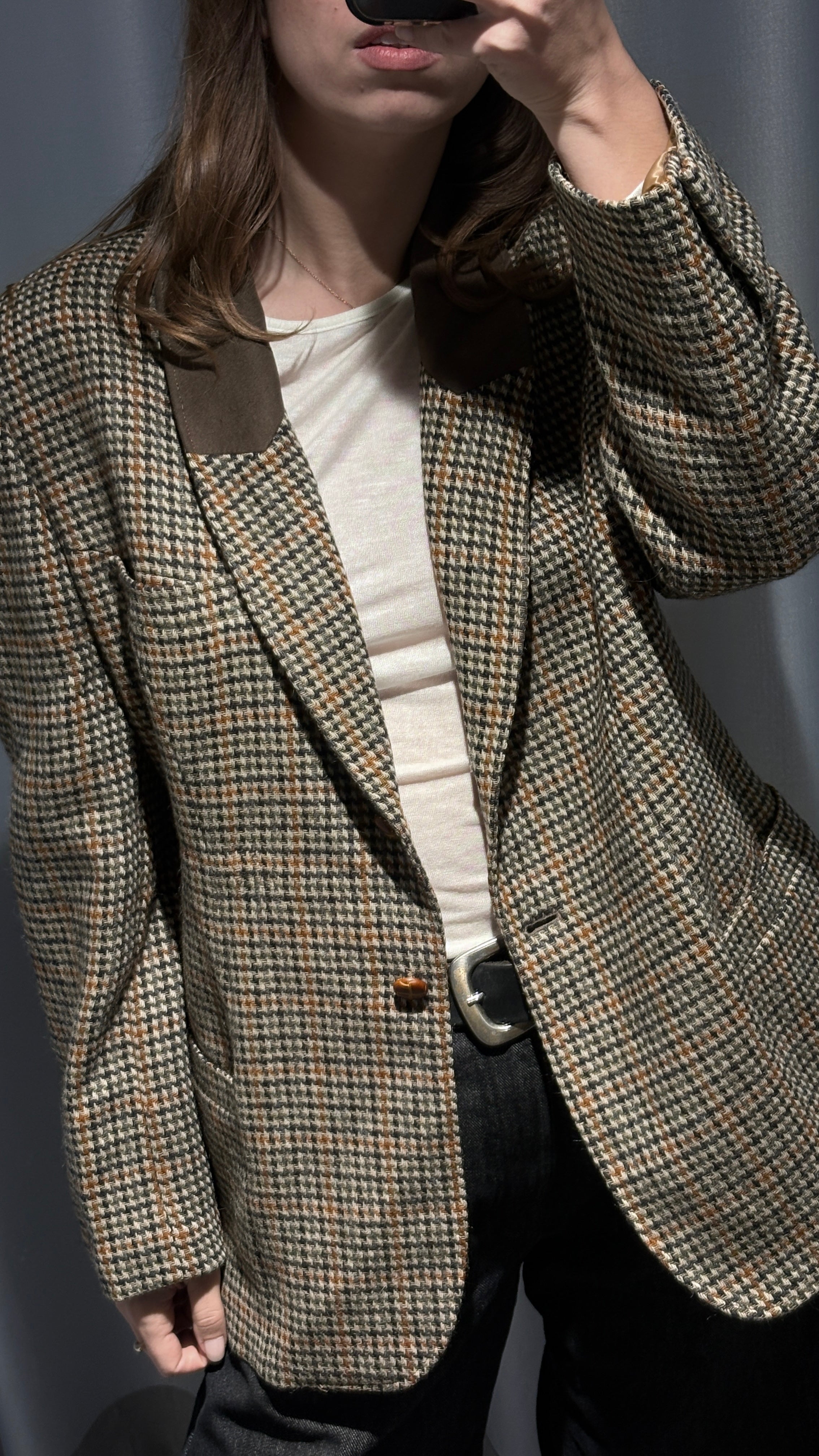 Vintage plaid blazer in neutral tones, super elegant yet with a relaxed vibe.